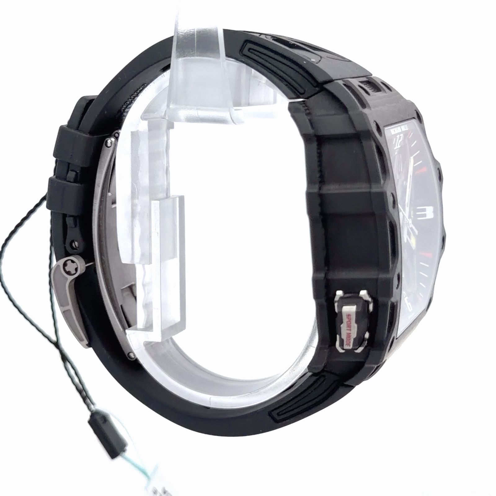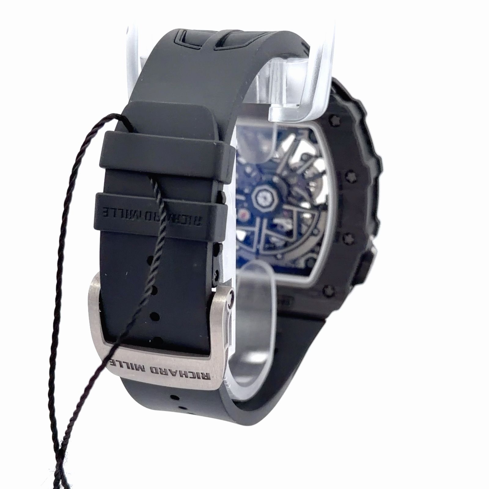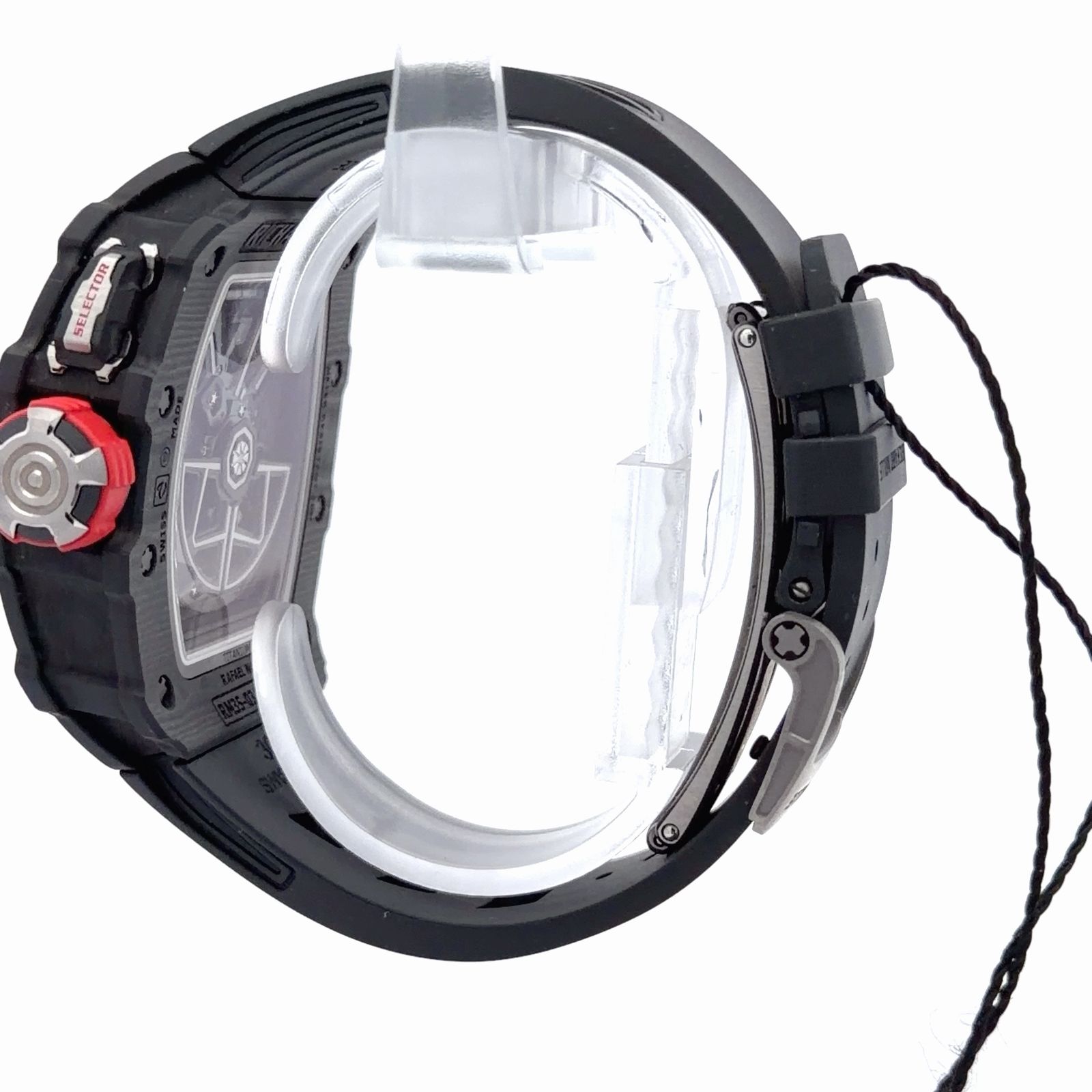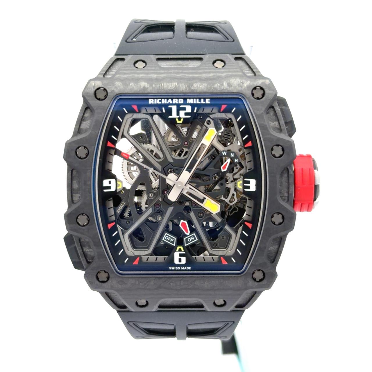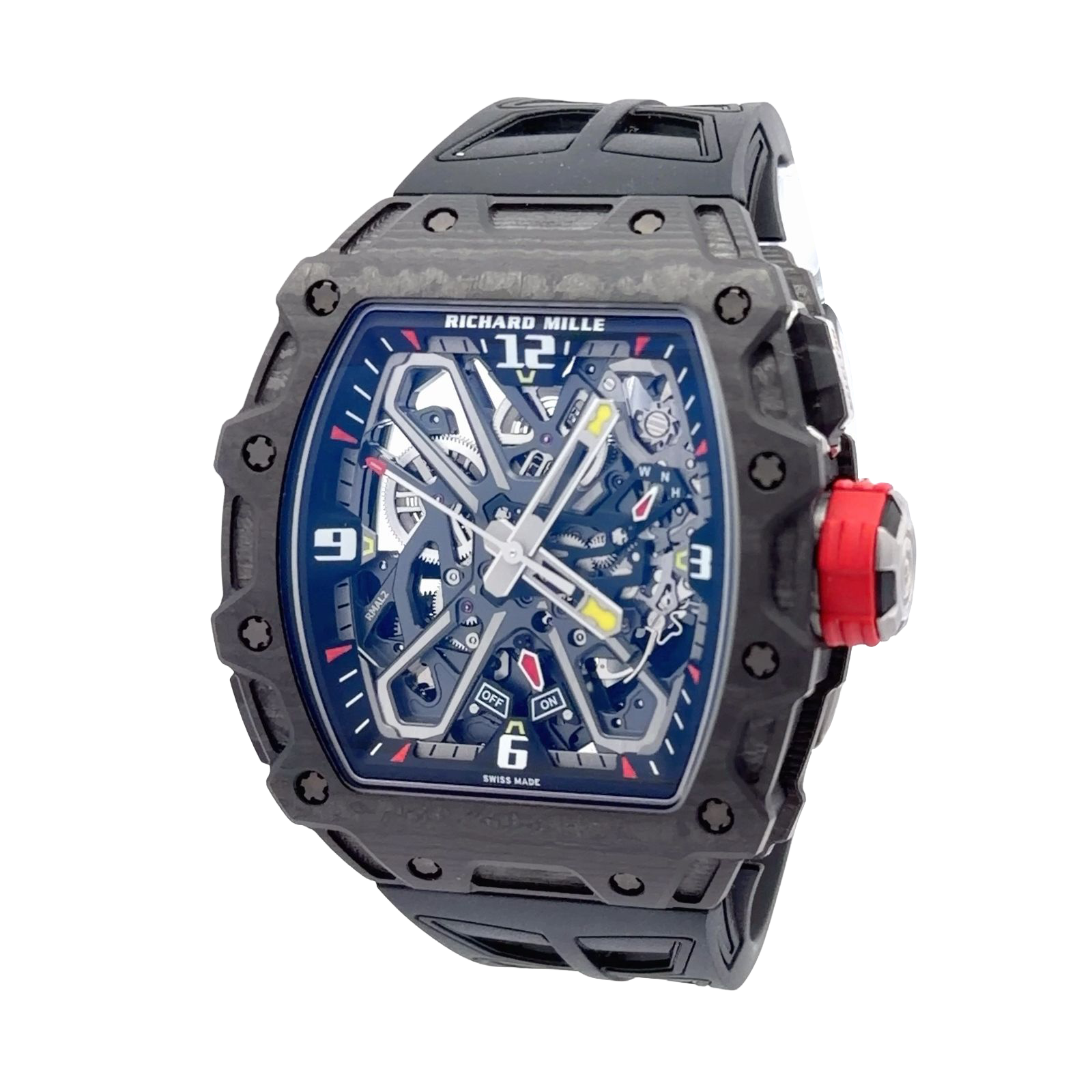 Richard Mille RM 35-03 Automatic Rafael Nadal, is a highly technical timepiece defined by its groundbreaking butterfly rotor mechanism. This patented innovation, developed over three years, allows the wearer to manually adjust the winding efficiency of the Calibre RMAL2 movement based on their activity level. An indicator at 6 o'clock on the skeletonized dial displays the rotor's status as "ON" or "OFF," while a function selector at 2 o'clock toggles between Winding (W), Neutral (N), and Hand-setting (H) modes, similar to a car's gearbox. The watch features a signature tonneau-shaped case, which in this version is crafted from Carbon TPT, a lightweight yet remarkably durable composite material known for its unique striated appearance. Powered by a double-barrel system, the RM 35-03 offers a power reserve of approximately 55 hours and is water-resistant to 50 meters.