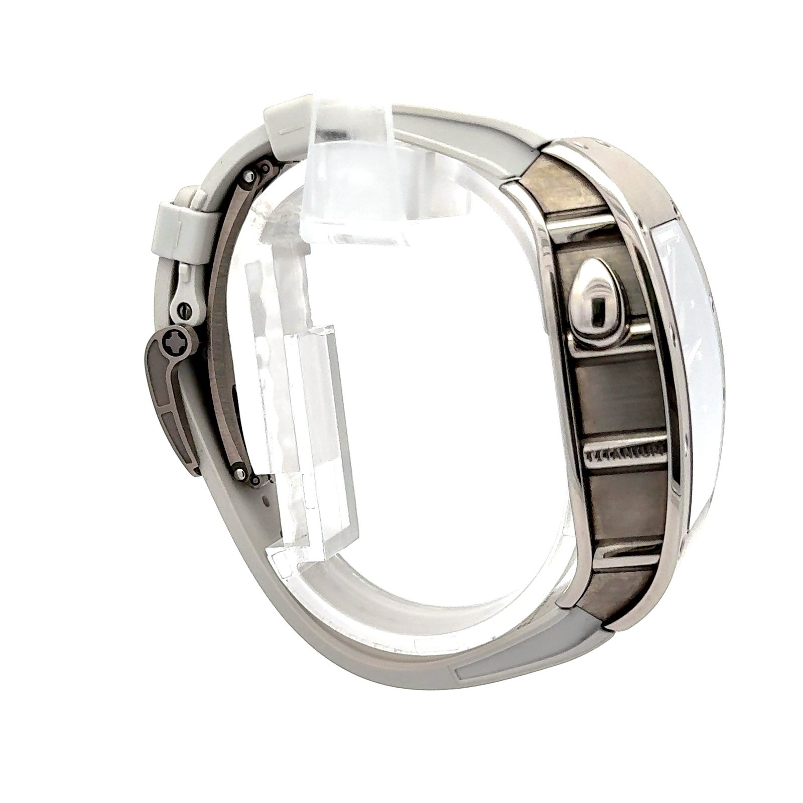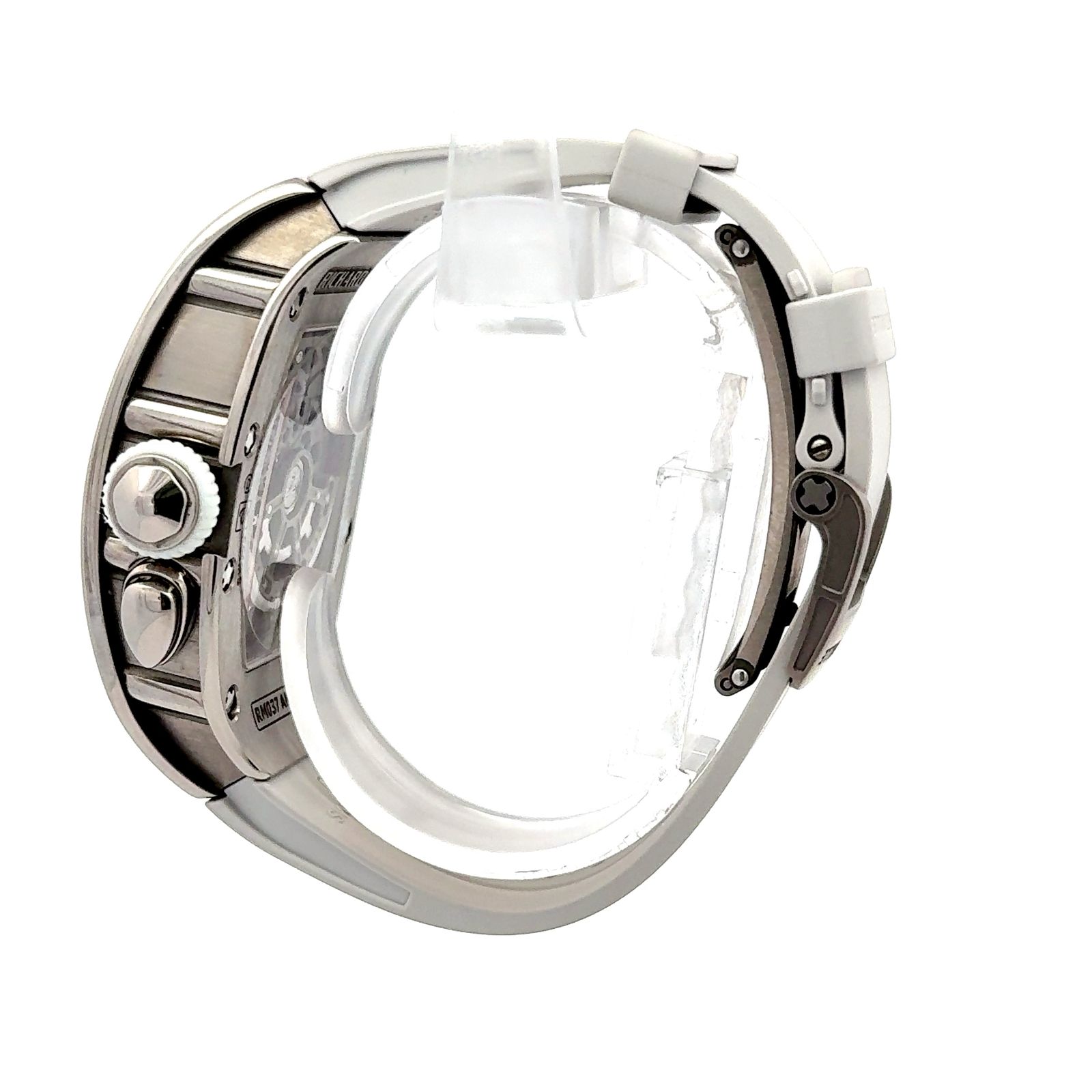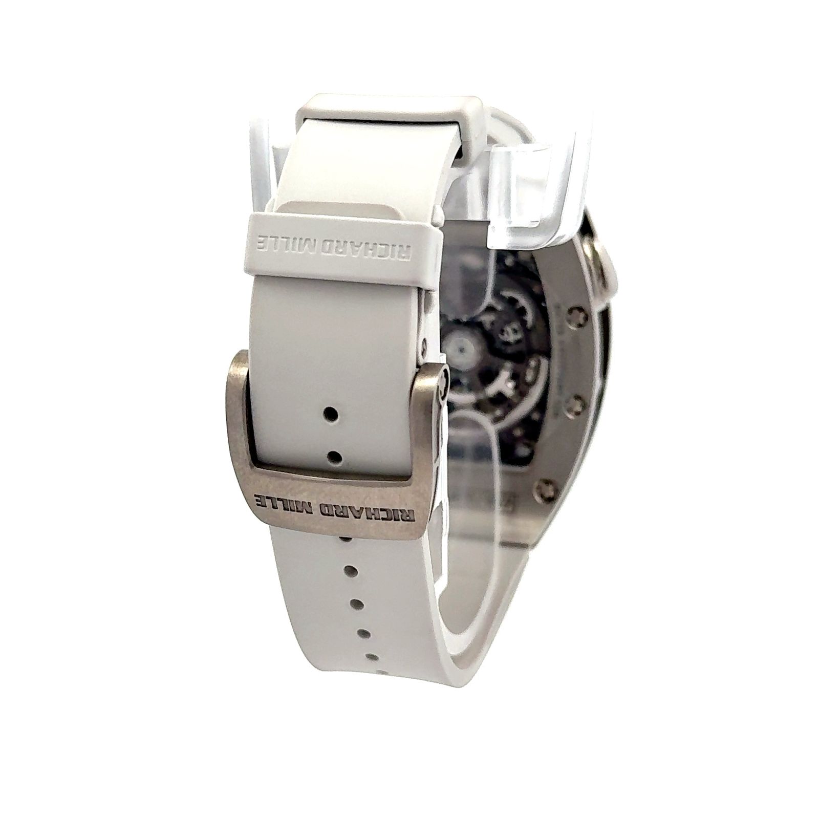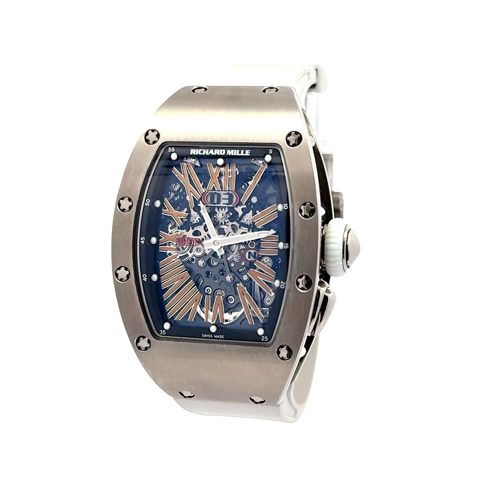 Richard Mille RM 037 is a striking example of contemporary watchmaking, blending cutting-edge technology with innovative design and luxurious materials. The watch features a lightweight yet robust titanium case measuring 52.63 x 34.40 mm, perfectly contoured for ergonomic comfort on the wrist. This is paired with a distinctive carbon bezel, which adds strength and a sporty touch, all protected by a highly scratch-resistant sapphire crystal that offers a clear view into the intricate workings beneath. At its heart lies the automatic CRMA1 caliber, a finely engineered movement housing 25 jewels and delivering a solid 50-hour power reserve. The movement is visible through the stunning skeletonized dial, which omits numerals to maintain a clean, modern aesthetic and highlight the complexity and beauty of the watch’s inner mechanics. Completing the design is a durable and comfortable white rubber strap, secured by a titanium double-fold clasp, ensuring both security and ease of wear. With a water resistance rating of 5 ATM, the RM 037 is designed to handle everyday challenges while maintaining its high-performance luxury status.