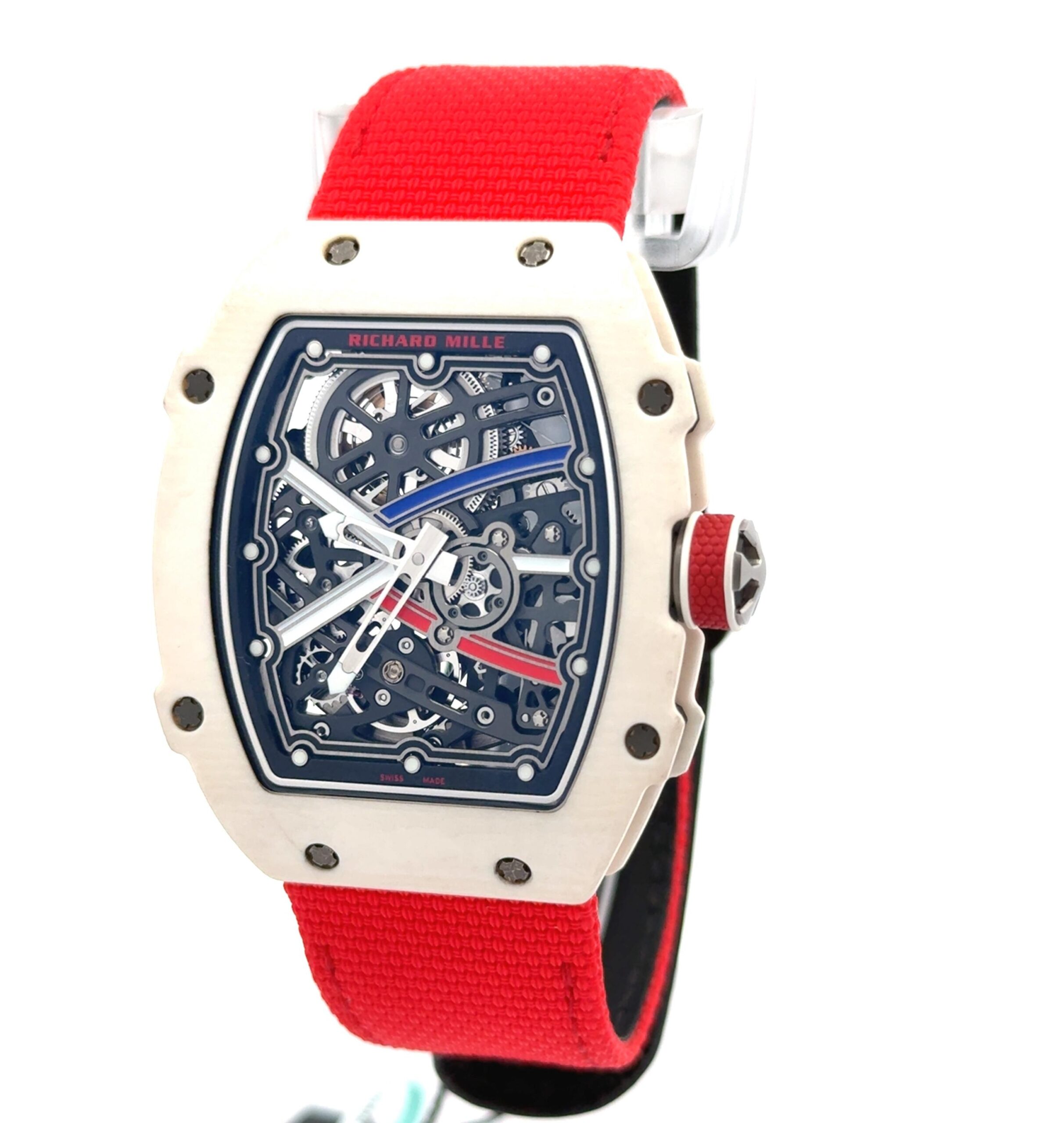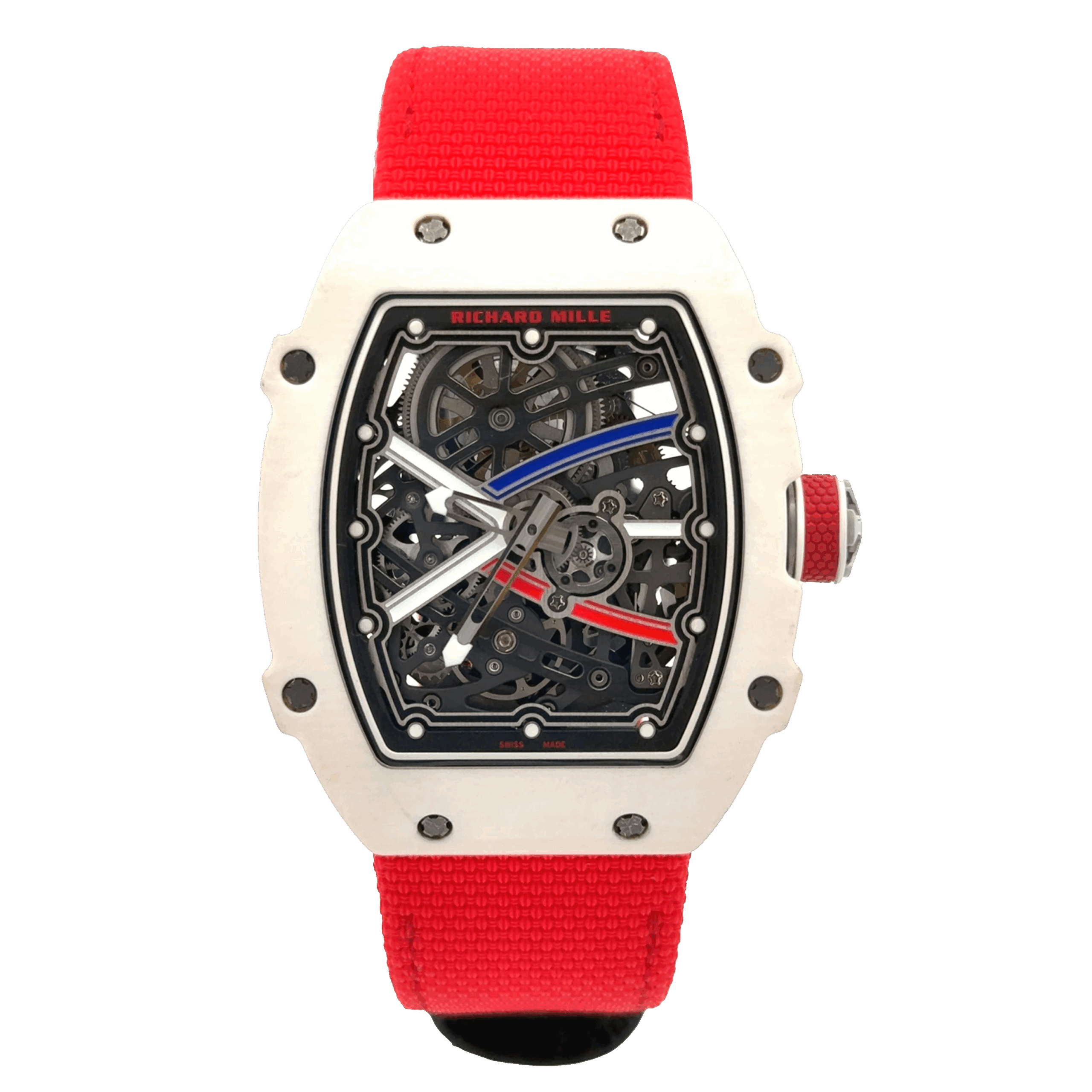 Richard Mille RM 67-02 Alexis Pinturault Edition is an ultra-lightweight and exceptionally thin automatic-winding timepiece designed in collaboration with the renowned French alpine ski racer. This sporting masterpiece features a distinctive tonneau-shaped case crafted from advanced materials like white Quartz TPT and Carbon TPT, ensuring remarkable lightness and robust durability. Powering this watch is the ultra-flat skeletonized CRMA7 calibre, an automatic movement offering hours and minutes, a 50-hour power reserve.The striking skeletonized dial, machined from a thin titanium plate, is hand-painted with the vibrant red, white, and blue colors of the French flag, serving as a patriotic tribute to Alexis Pinturault.