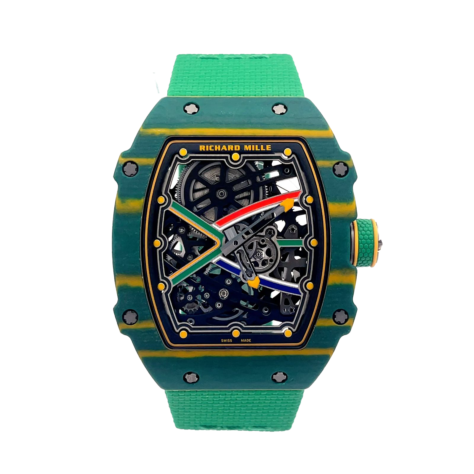 Richard Mille RM 67-02 is the ultimate expression of lightweight engineering and athletic inspiration. Created in partnership with Olympic sprint champion Wayde van Niekerk, this model is designed to deliver uncompromising performance, comfort, and style. The case, crafted entirely from Carbon TPT®, measures 38.7 x 47.5 mm and is complemented by a matching carbon bezel and a durable sapphire crystal, ensuring both strength and visibility. With a water resistance of 3 ATM, this piece embodies resilience while remaining exceptionally lightweight. At its heart lies the automatic calibre CRMA7, a skeletonized movement developed exclusively by Richard Mille. Featuring 25 jewels and a 50-hour power reserve, it highlights the brand’s dedication to technical mastery and precision timekeeping.