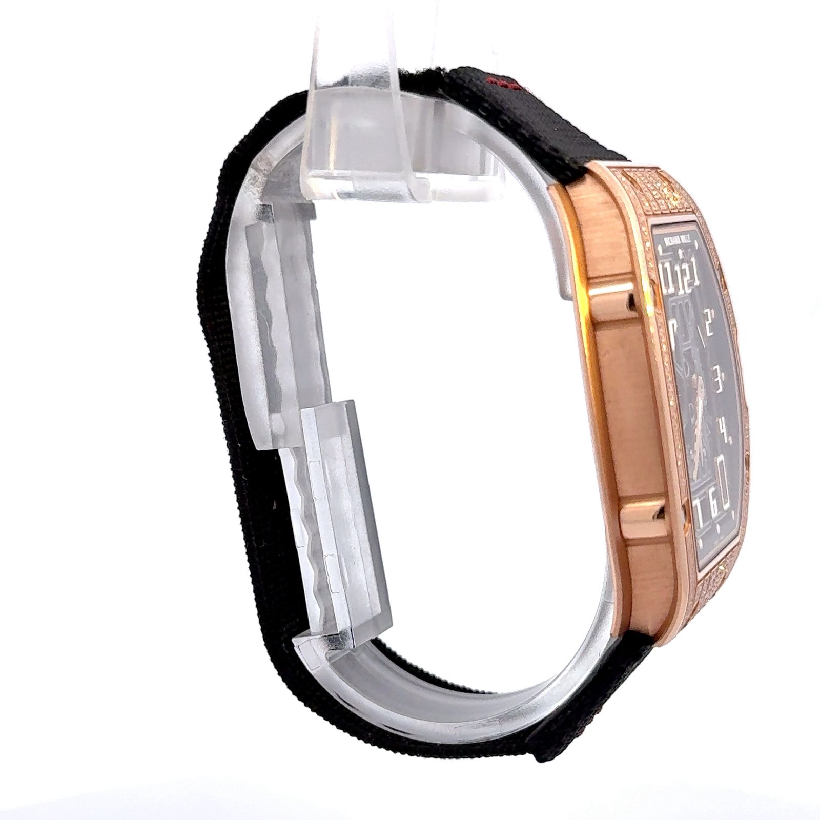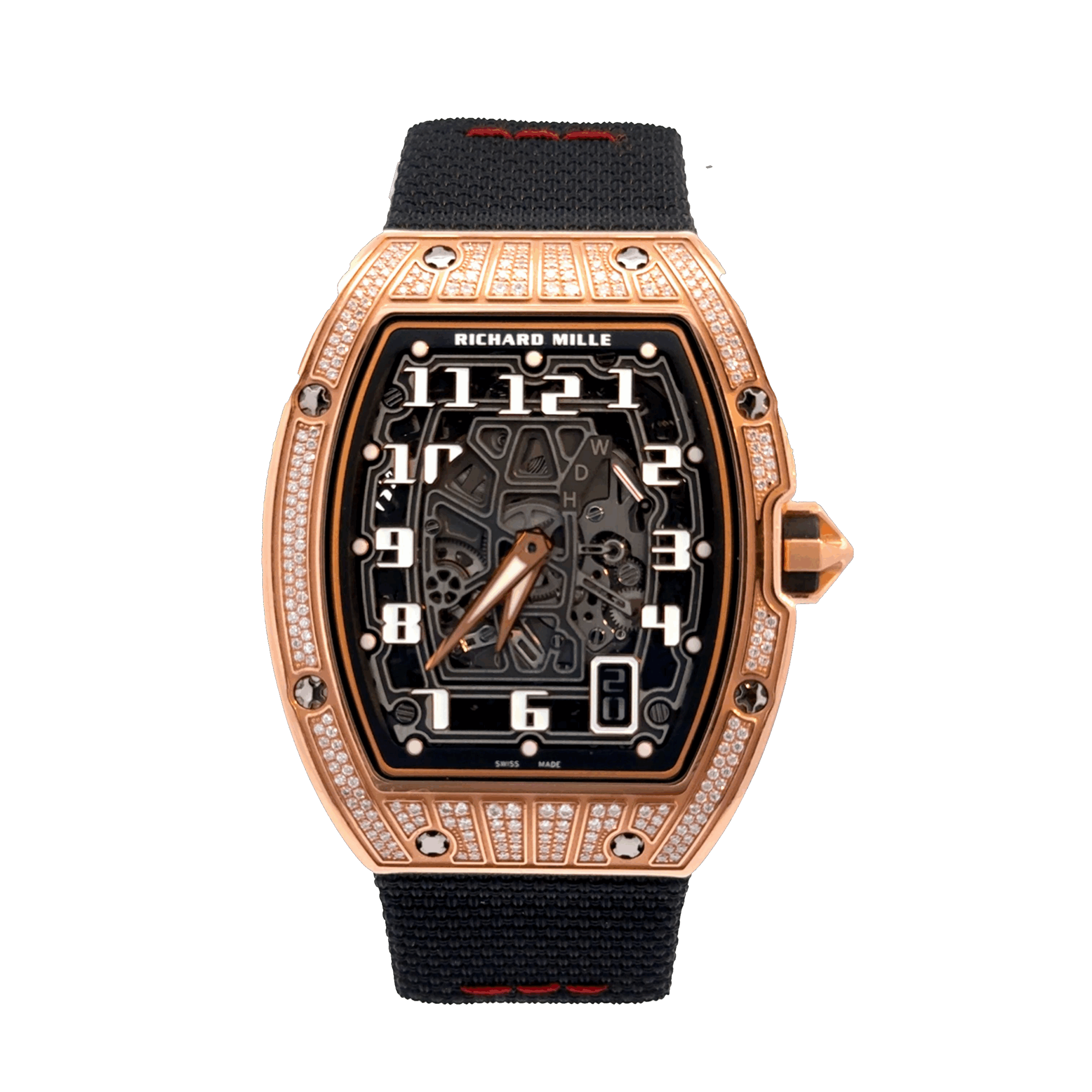 Richard Mille RM 67-01 is a masterclass in ultra-thin horology, blending technical ingenuity with unmistakable aesthetic flair. Housed in a sleek 38.7 x 47.5 mm tonneau-shaped case crafted from 18K rose gold, this timepiece exudes refined opulence. Its skeletonized dial reveals the intricate architecture of the CRMA6 automatic movement, built on a microblasted grade 5 titanium baseplate and bridges, offering hours, minutes, date, and a function selector at 2 o’clock. The function indicator—reminiscent of a car’s gearbox—lets the wearer toggle between winding (W), date-setting (D), and hand-setting (H) modes. A platinum rotor with ceramic ball bearings ensures efficient winding while maintaining the watch’s slim profile. Paired with a black elastic strap accented by red stitching.