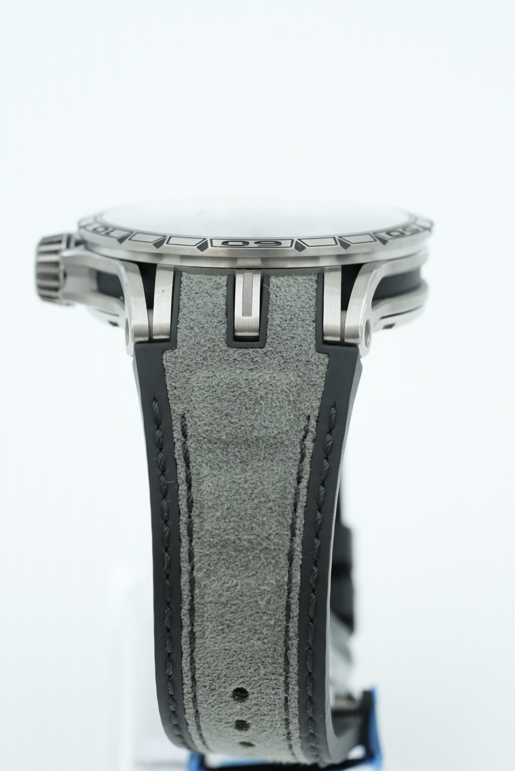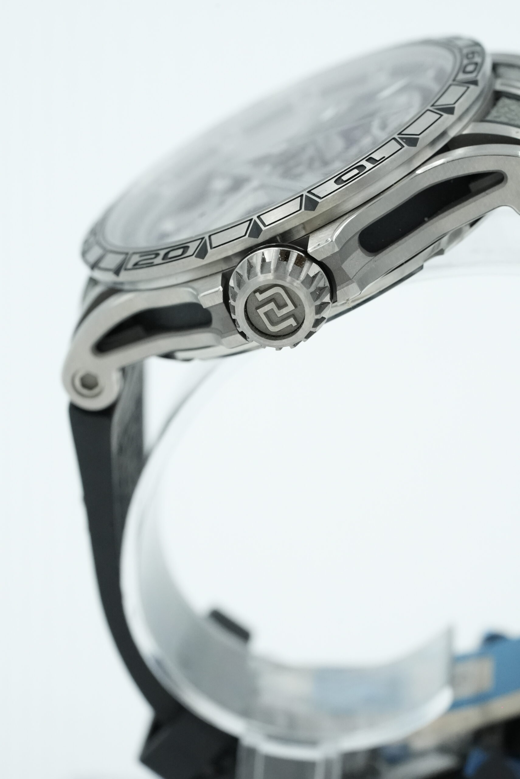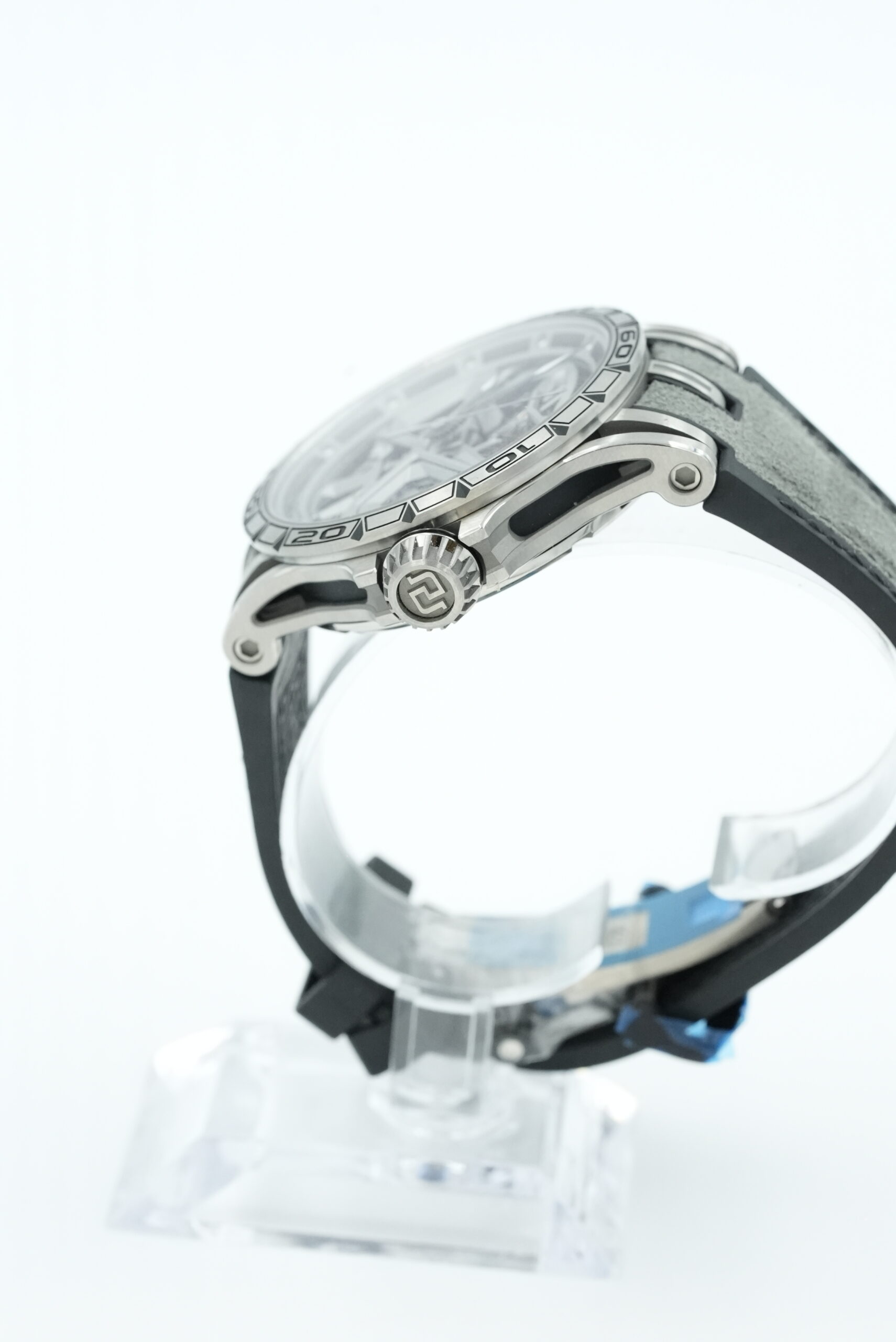 Roger Dubuis DBEX0748 is a striking timepiece from the iconic Swiss luxury brand, known for its innovative design and technical excellence. This model is part of the Excalibur collection, featuring a bold and contemporary aesthetic. The watch boasts a 45mm case crafted from titanium, showcasing a luxurious yet durable finish.