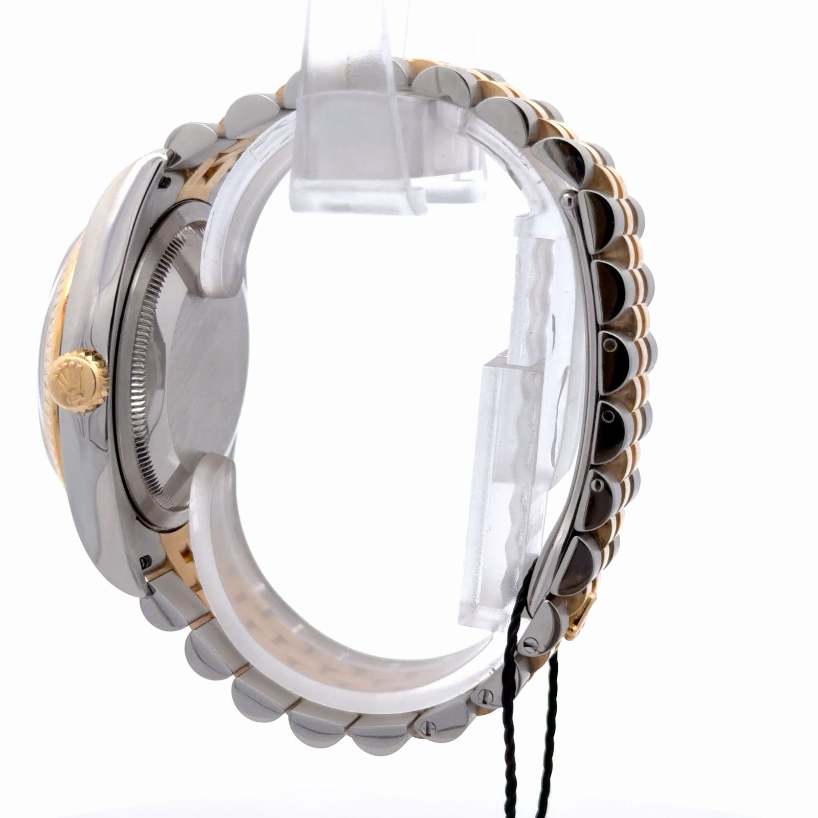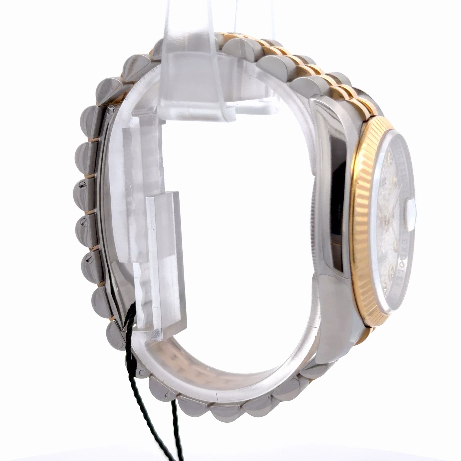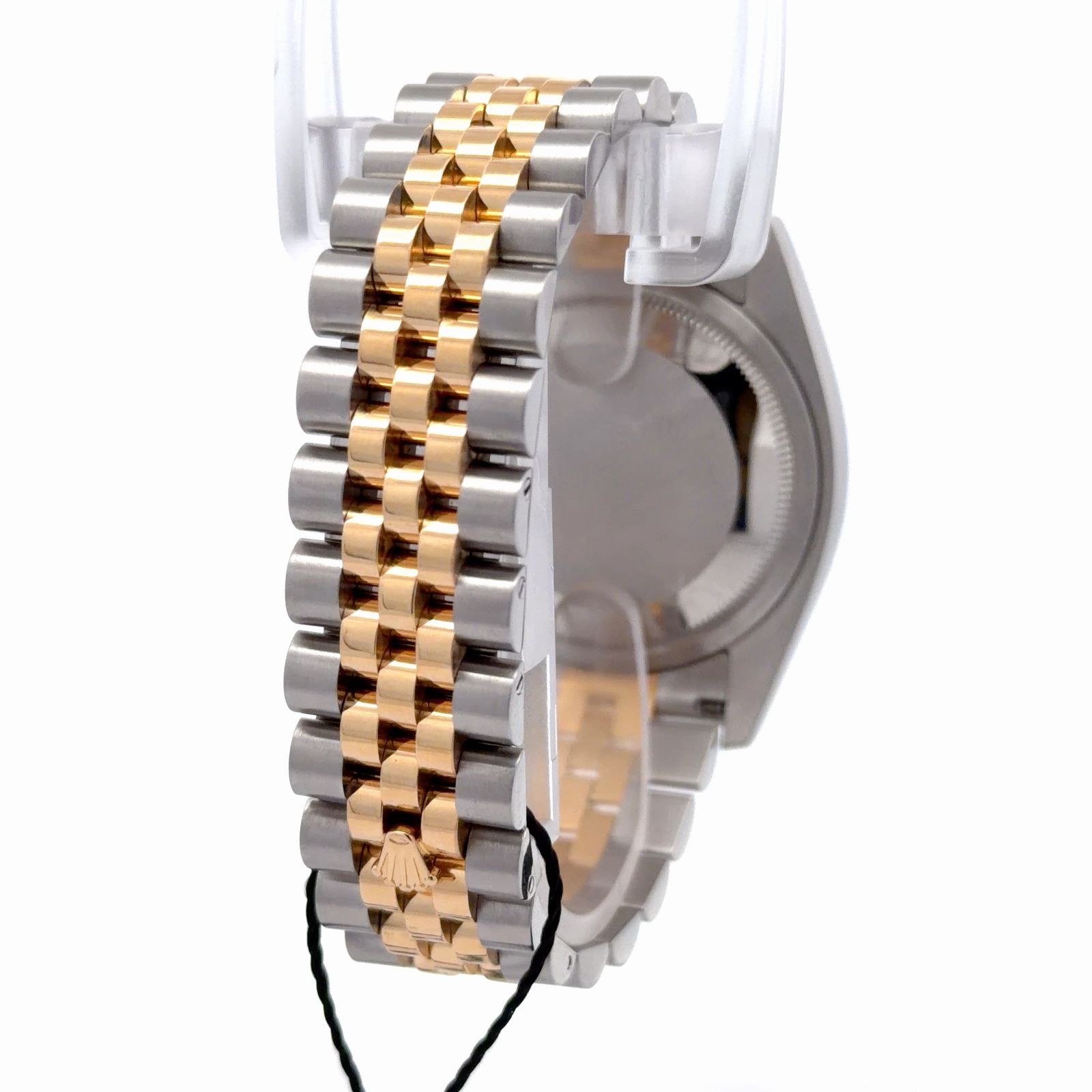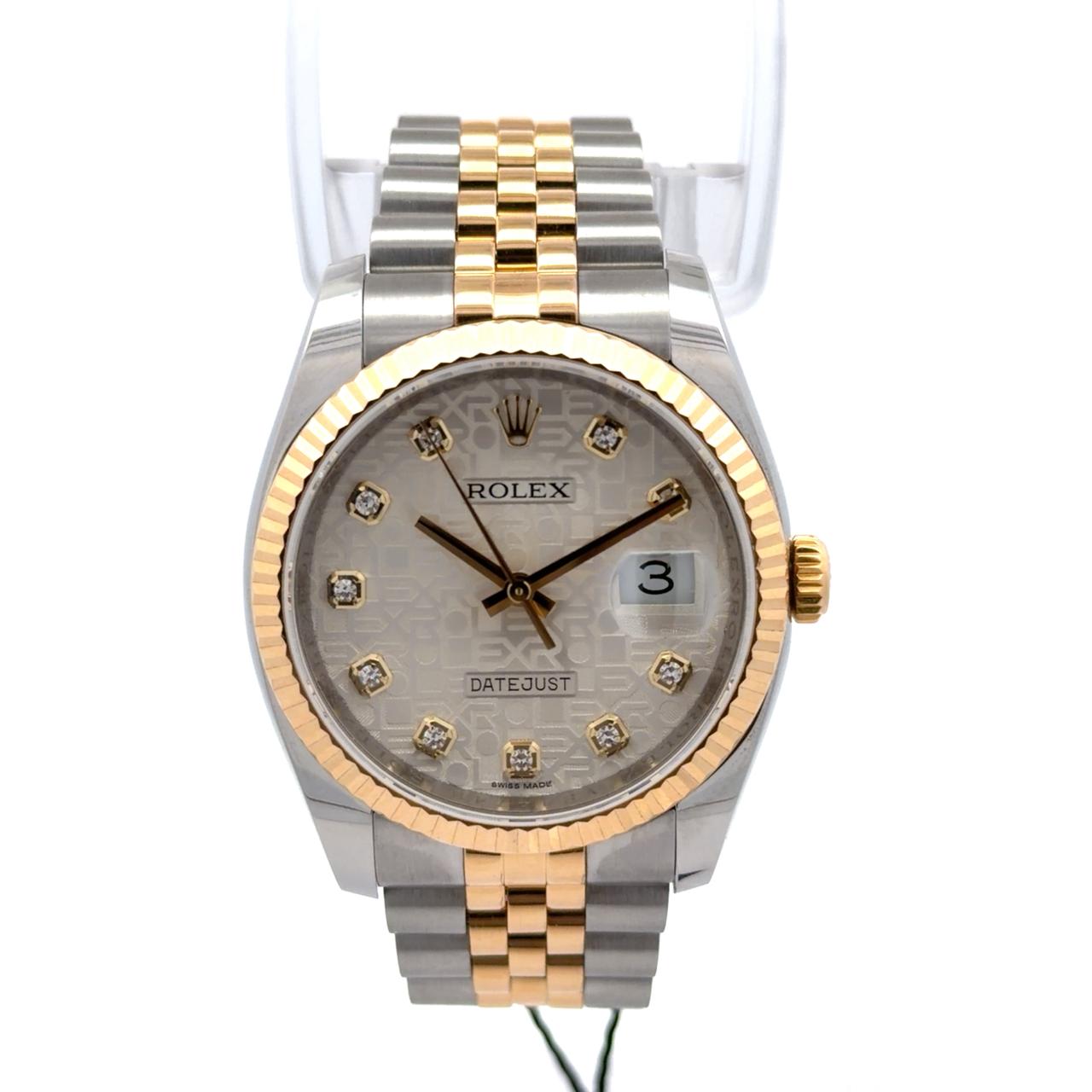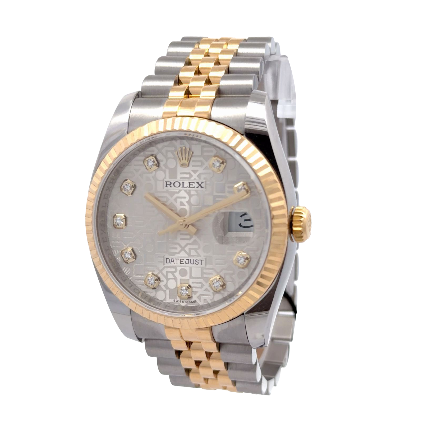Rolex Datejust reference 116233 is a men's or unisex watch featuring a 36mm stainless steel case and an 18k yellow gold fluted bezel. The watch has a silver computer pattern dial with diamond hour markers and a date window at the 3 o'clock position with a Cyclops magnifier. It is powered by an officially certified chronometer automatic self-winding movement, such as the 3135 calibre, and often comes fitted with a two-tone stainless steel and 18k yellow gold Jubilee bracelet.