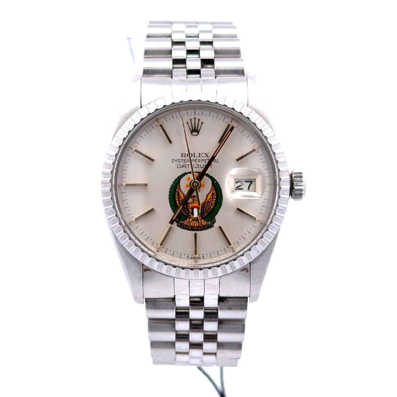 Rolex Datejust 36 Ref. 16030 UAE Armed Forces Logo Dial is an exceptionally rare and historically important 1980s special-edition timepiece, featuring a silver dial with luxurious gold accents, a prominently displayed UAE Armed Forces insignia symbolizing its exclusive military issuance, a sturdy 36mm stainless steel Oyster case with sharp lines, an engine-turned steel bezel, an acrylic crystal, a refined and comfortable Jubilee bracelet, and the reliable Rolex Caliber 3035 automatic movement with quickset date—coming together to form a highly coveted collectible that blends cultural significance, military heritage, and timeless Rolex craftsmanship in one remarkable watch.