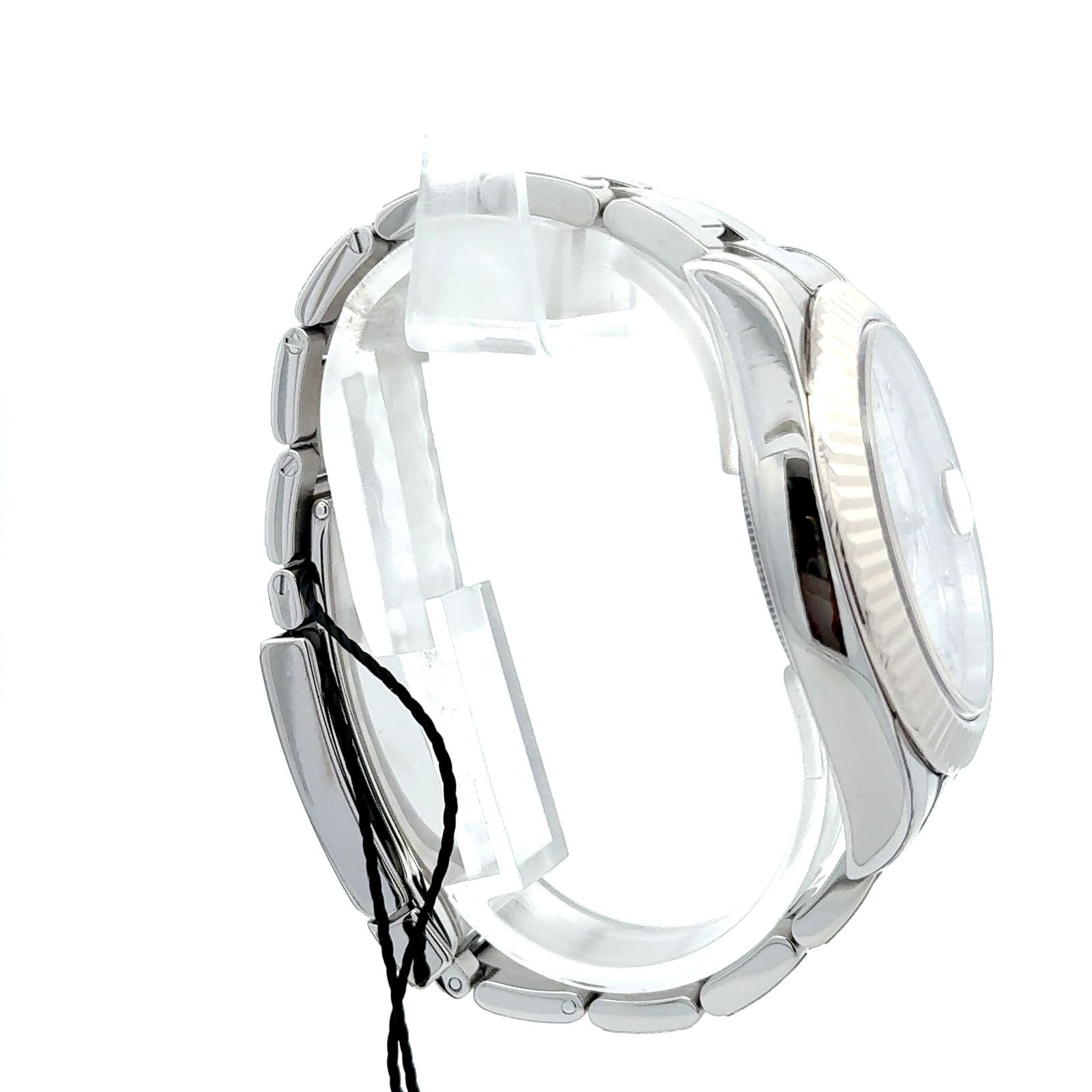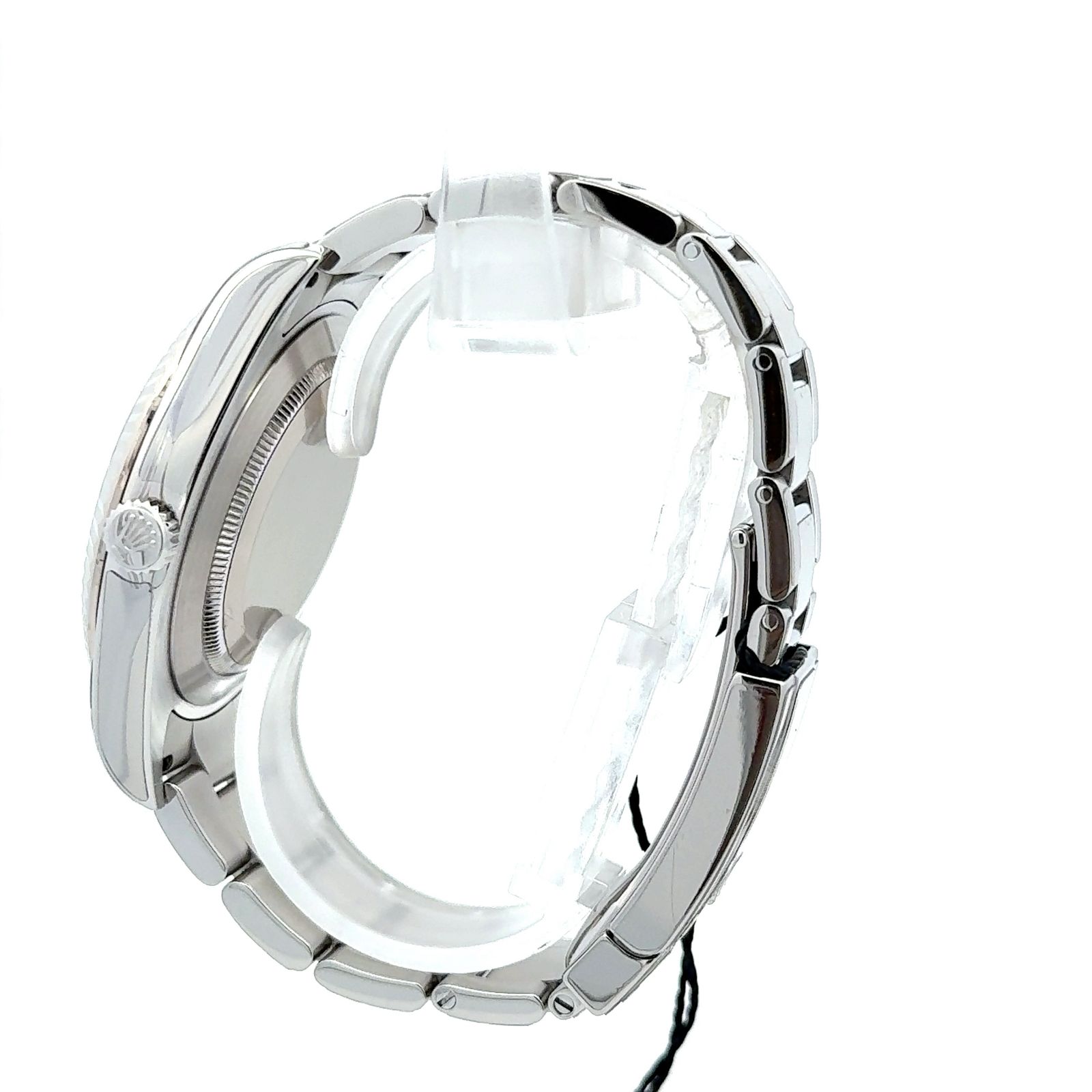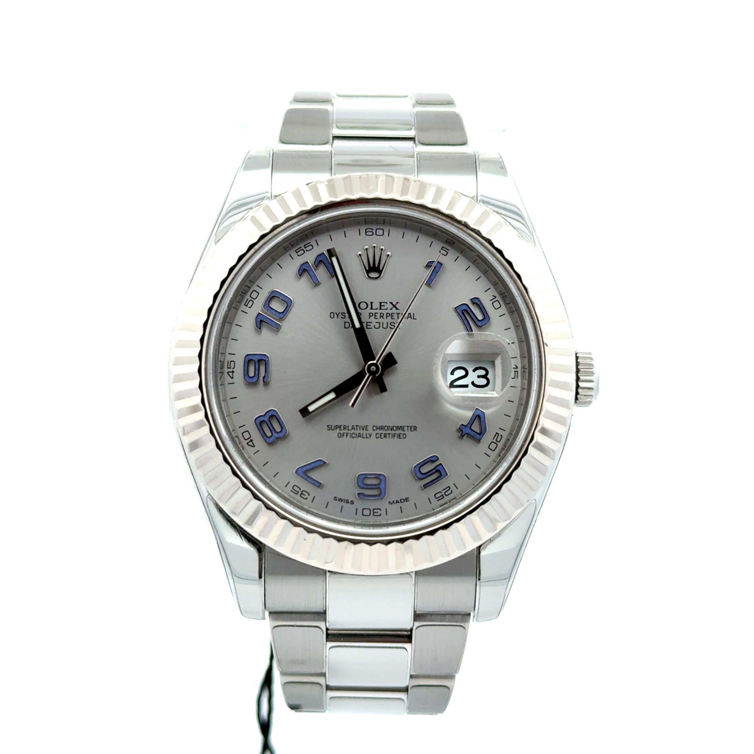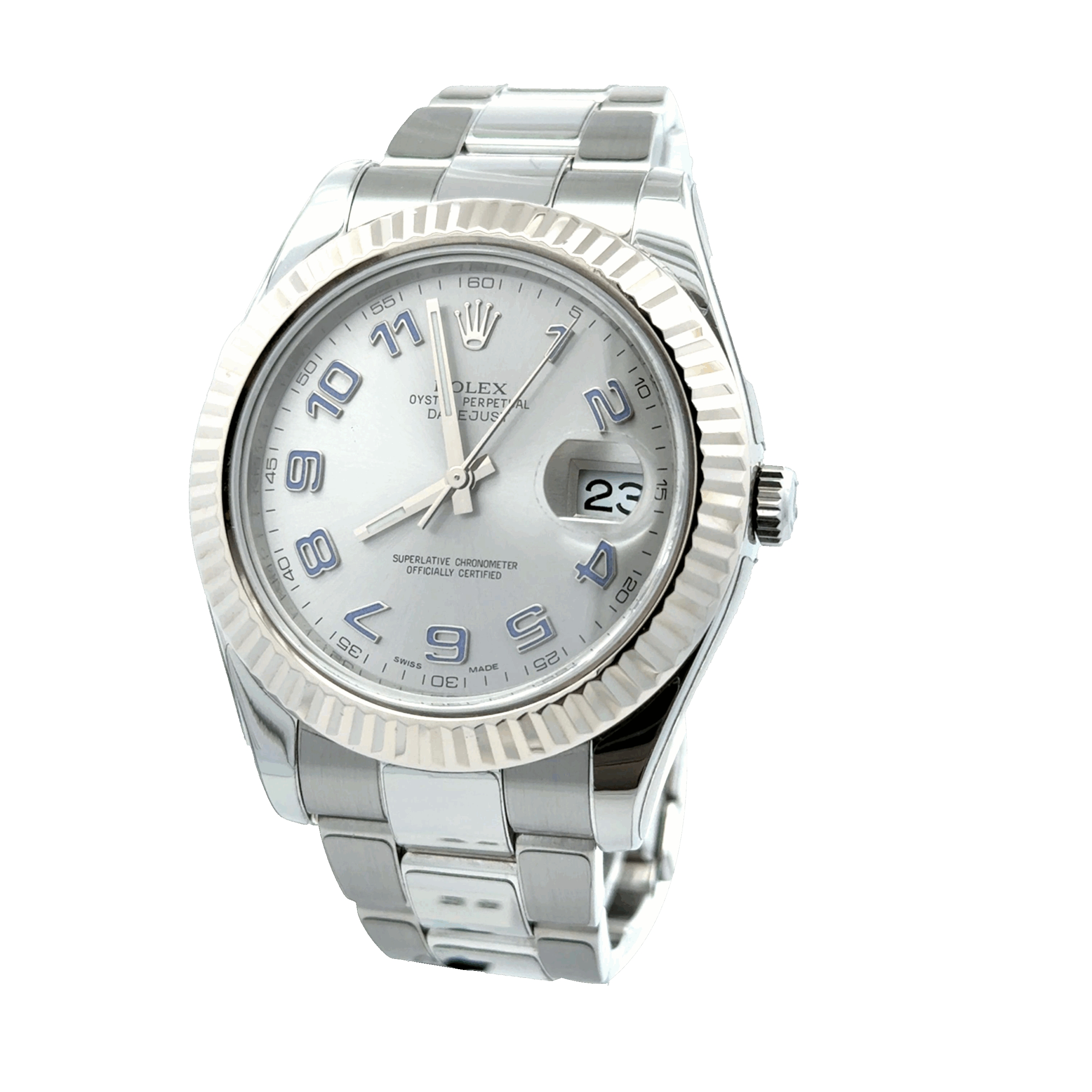 Rolex Datejust II reference 116334 is a striking timepiece that blends classic elegance with modern refinement. Crafted in stainless steel with an 18k white gold fluted bezel, it offers a robust yet luxurious presence on the wrist. The watch features a silver dial highlighted by applied blue Arabic numerals, giving it a contemporary touch while ensuring excellent legibility. Its 41mm Oyster case guarantees durability and water resistance, while the scratch-resistant sapphire crystal with Cyclops lens magnifies the date display at 3 o’clock. Powered by the reliable automatic Caliber 3136 movement, the 116334 is a certified Swiss chronometer, ensuring precision and performance. Paired with the iconic Oyster bracelet, this model perfectly embodies Rolex’s timeless design and technical excellence.
