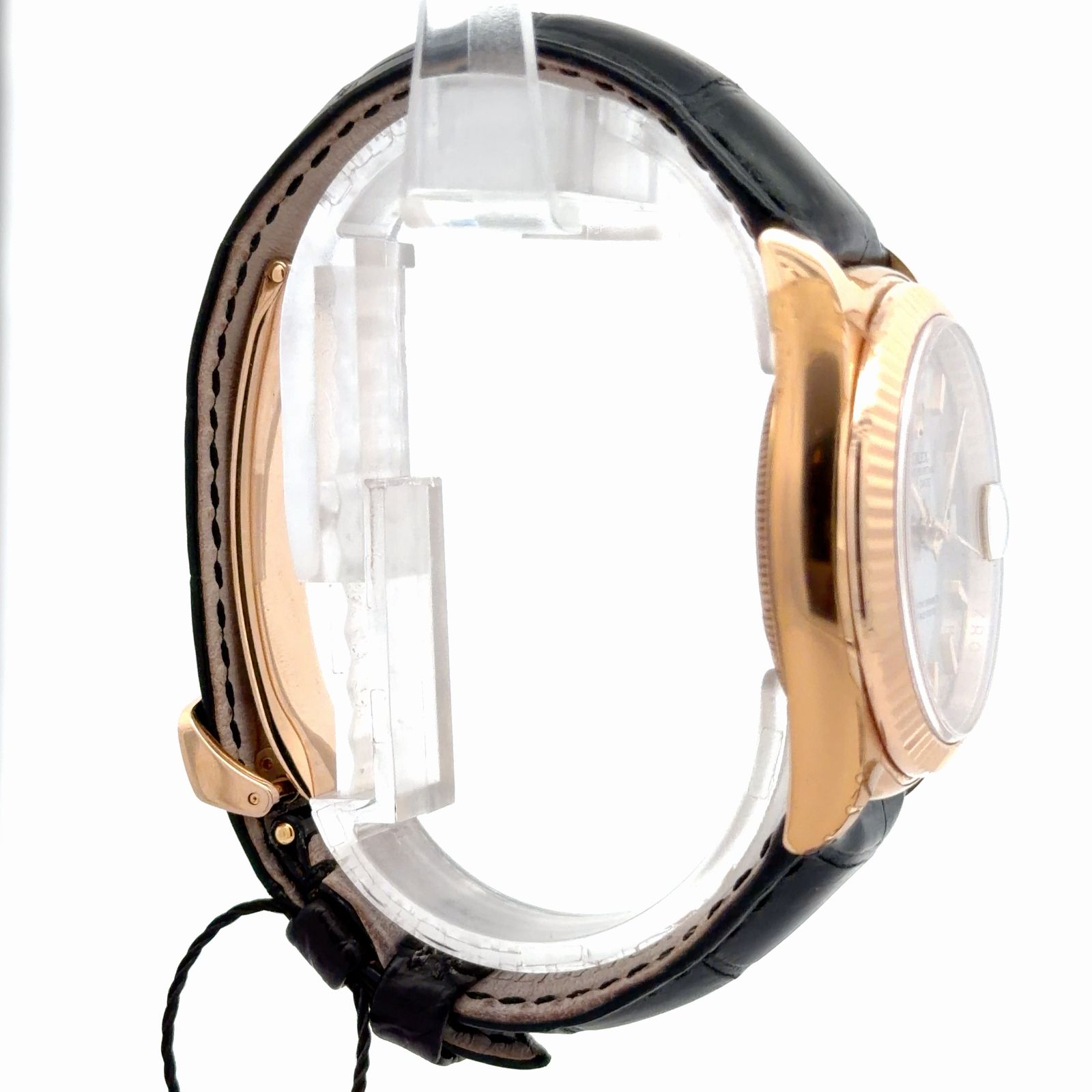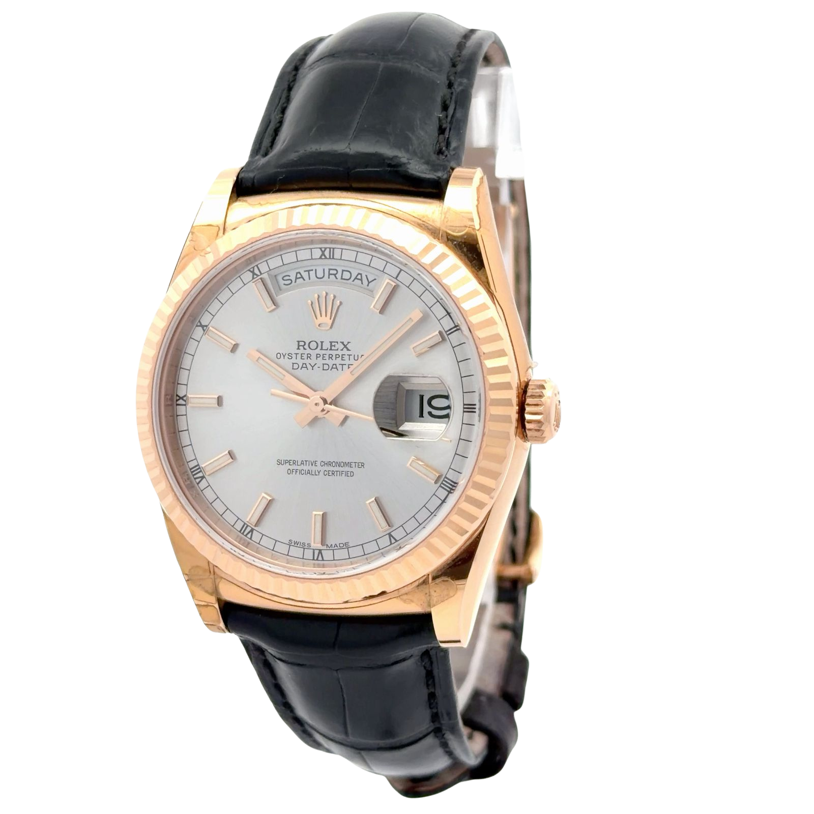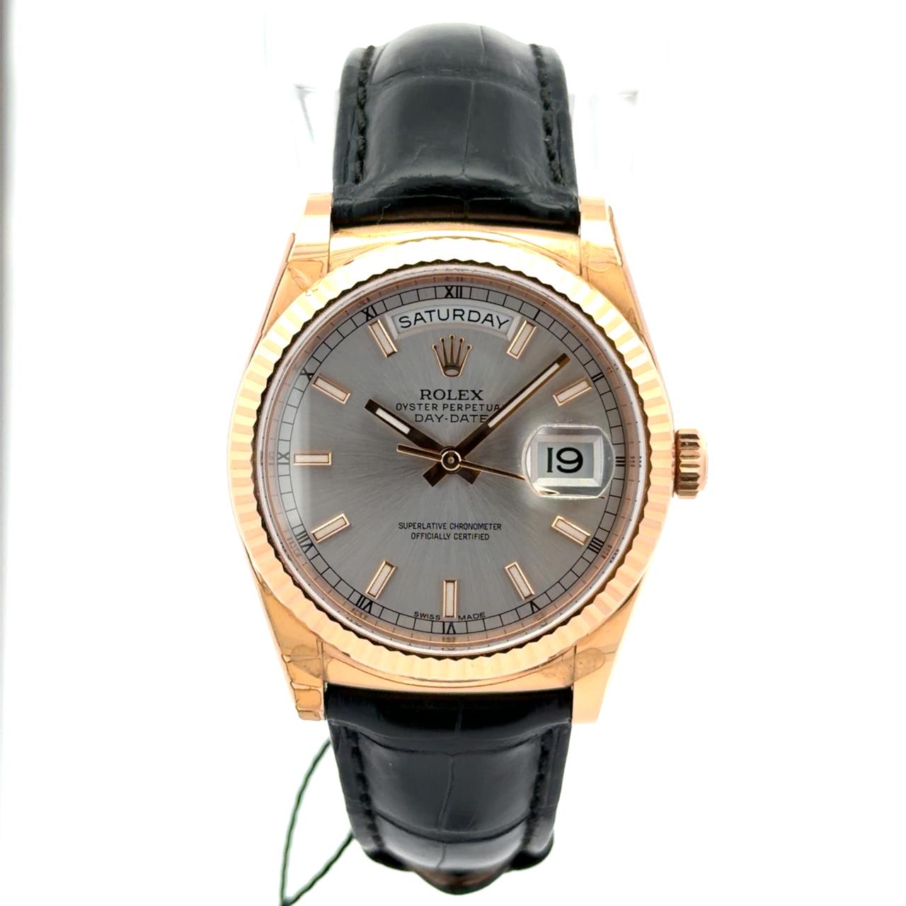 Rolex Day-Date 36 reference 118135 is a prestigious 36mm timepiece featuring an 18k Everose gold Oyster case paired with a signature fluted bezel. This model is distinguished by its silver sunray dial, which displays the full day of the week at the 12 o'clock position and the date under a Cyclops magnifying lens at 3 o'clock. It is powered by the caliber 3155, a self-winding mechanical chronometer movement officially certified for its precision. Designed for classic elegance, the watch is fitted with a high-quality leather strap and an 18k Everose gold deployant buckle.