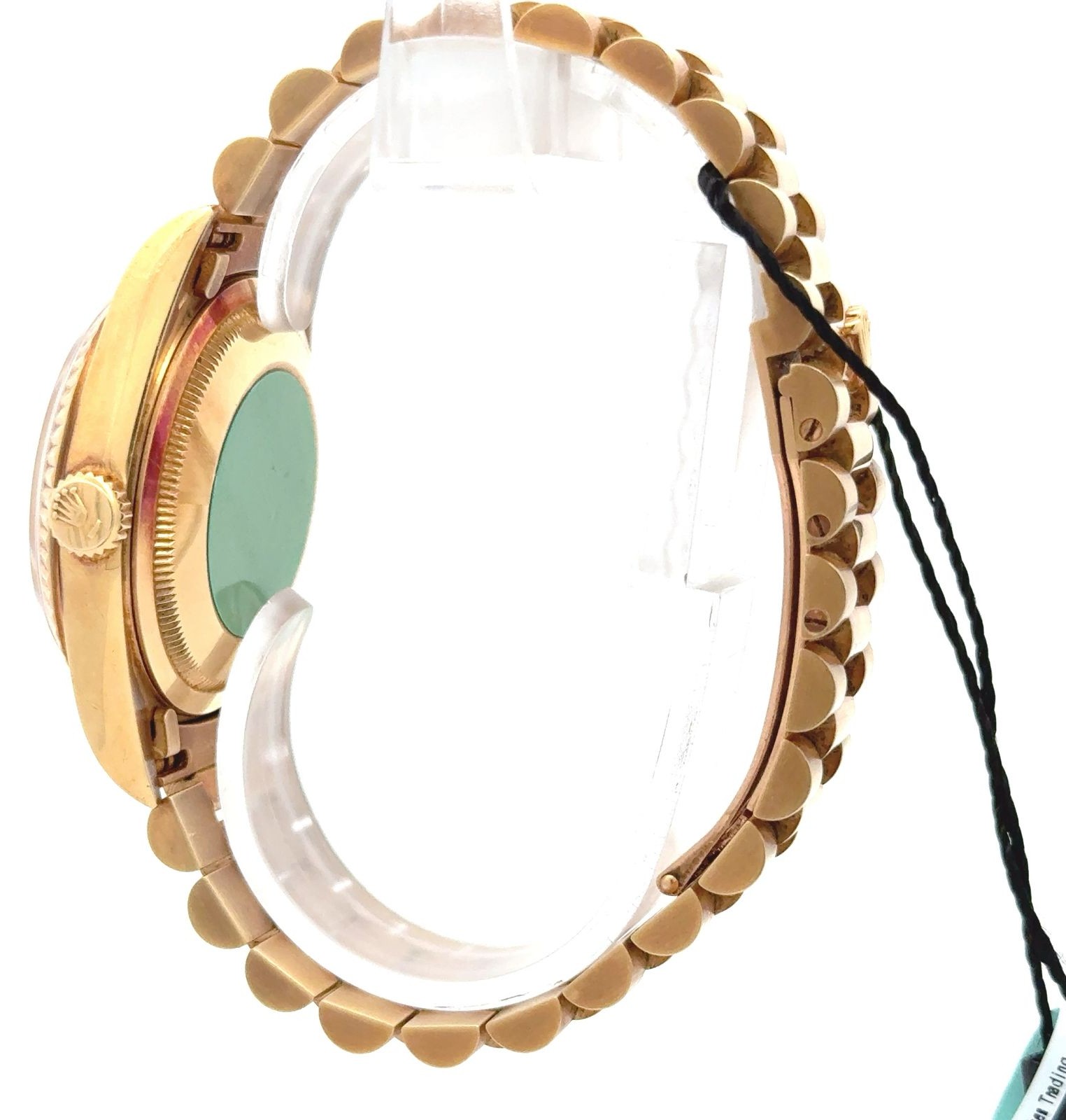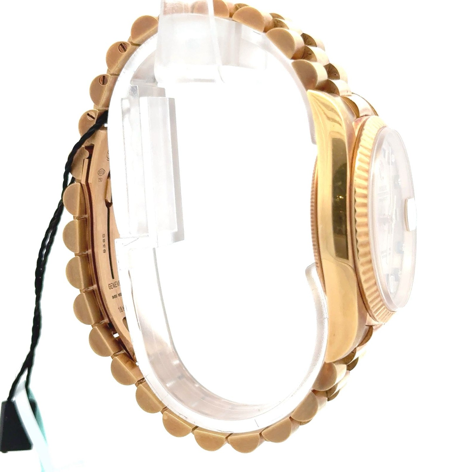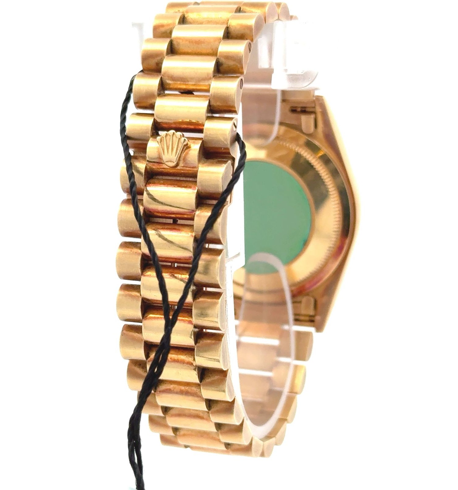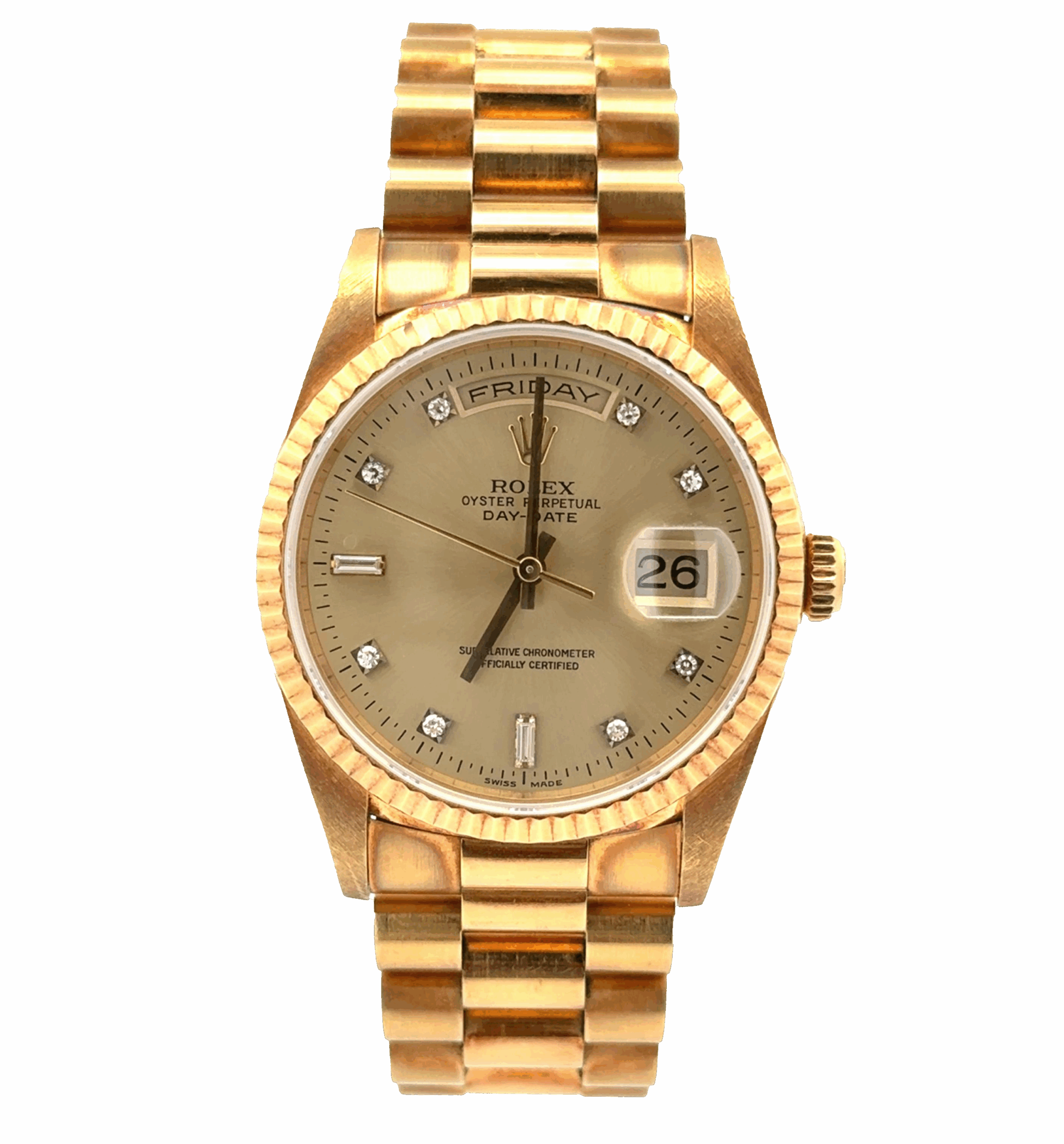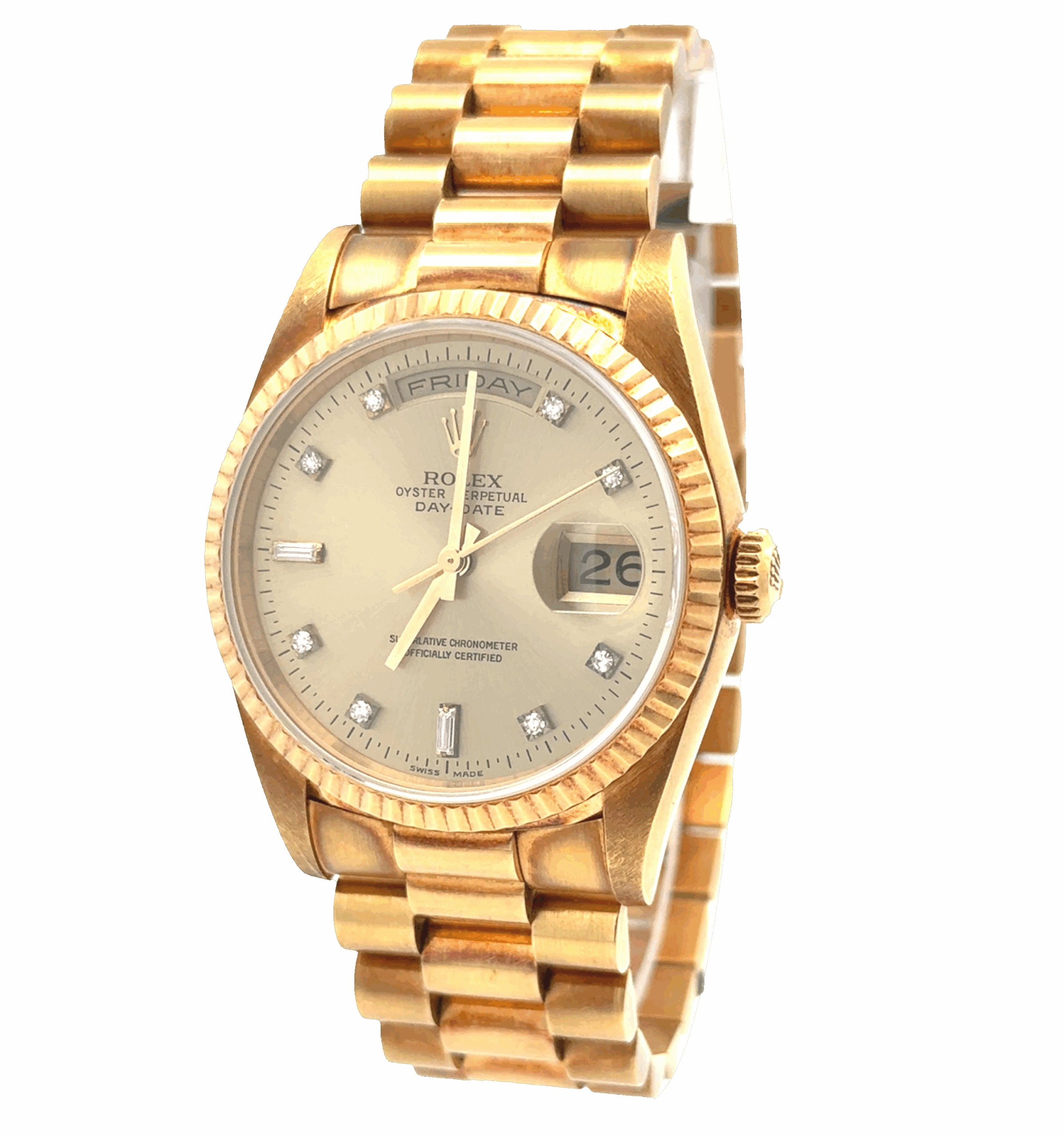 Rolex Day-Date 18238 is an iconic symbol of prestige and refinement, crafted in 18k yellow gold with Rolex’s signature President bracelet that ensures both comfort and elegance. Its champagne dial is enhanced with diamond-set hour markers, adding a luxurious sparkle to the classic design, while the fluted bezel further elevates its timeless appeal. As part of the Day-Date collection, this model features the hallmark day display at 12 o’clock and the date window at 3 o’clock, magnified by the Cyclops lens for easy readability. Powered by the reliable automatic caliber 3155 movement, it delivers exceptional accuracy and performance, certified as a Swiss chronometer. The Rolex 18238 perfectly embodies sophistication and status, making it a highly sought-after piece among collectors and enthusiasts.