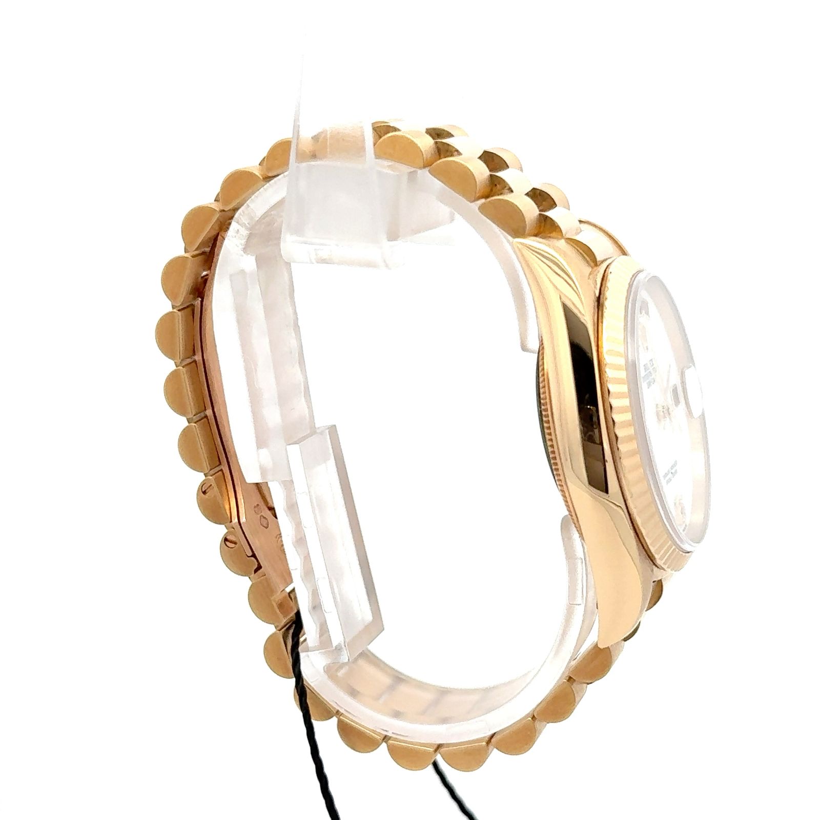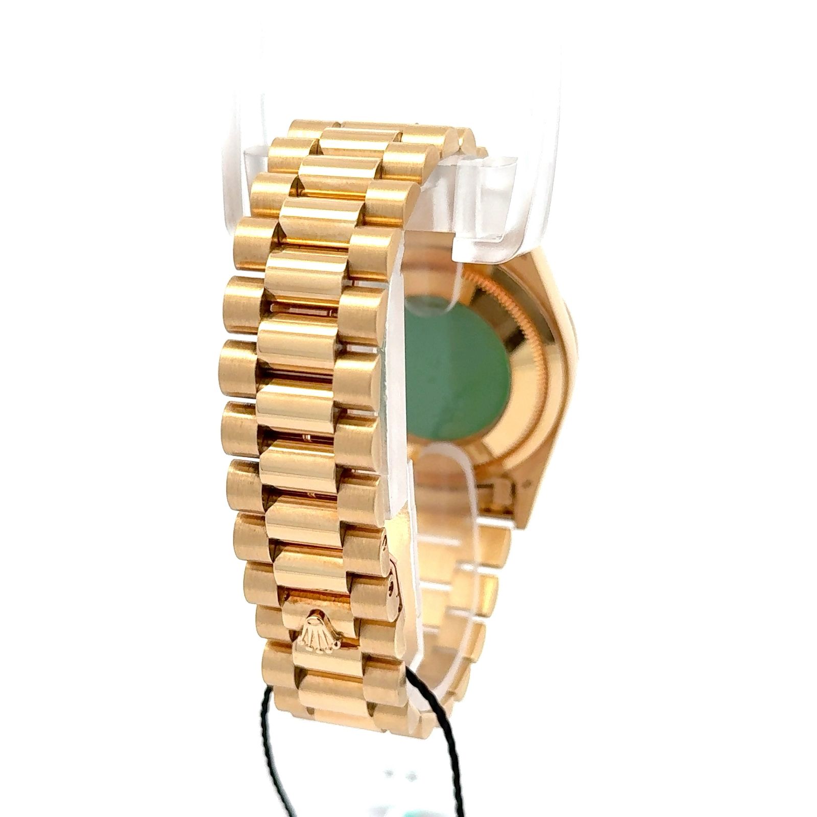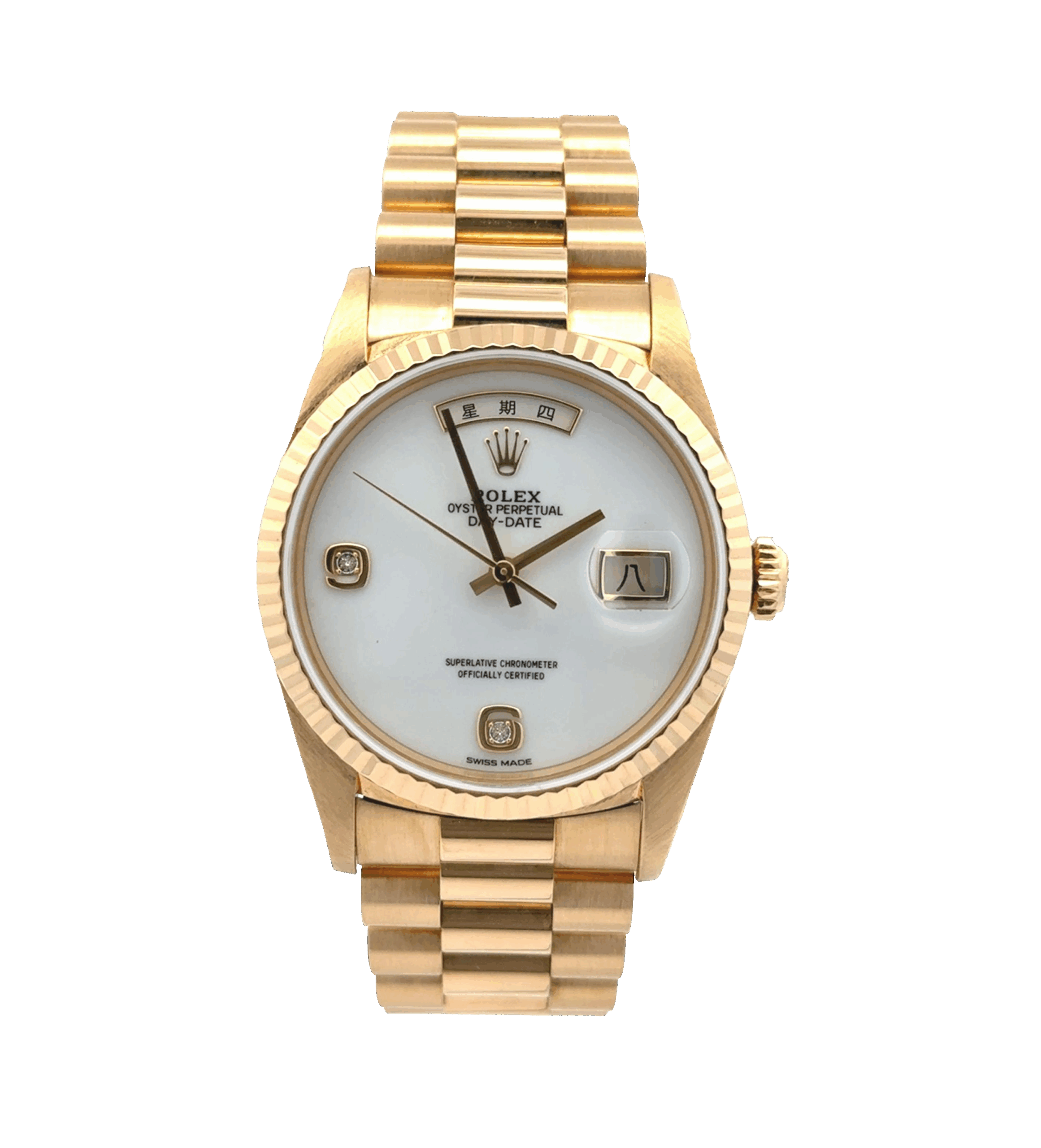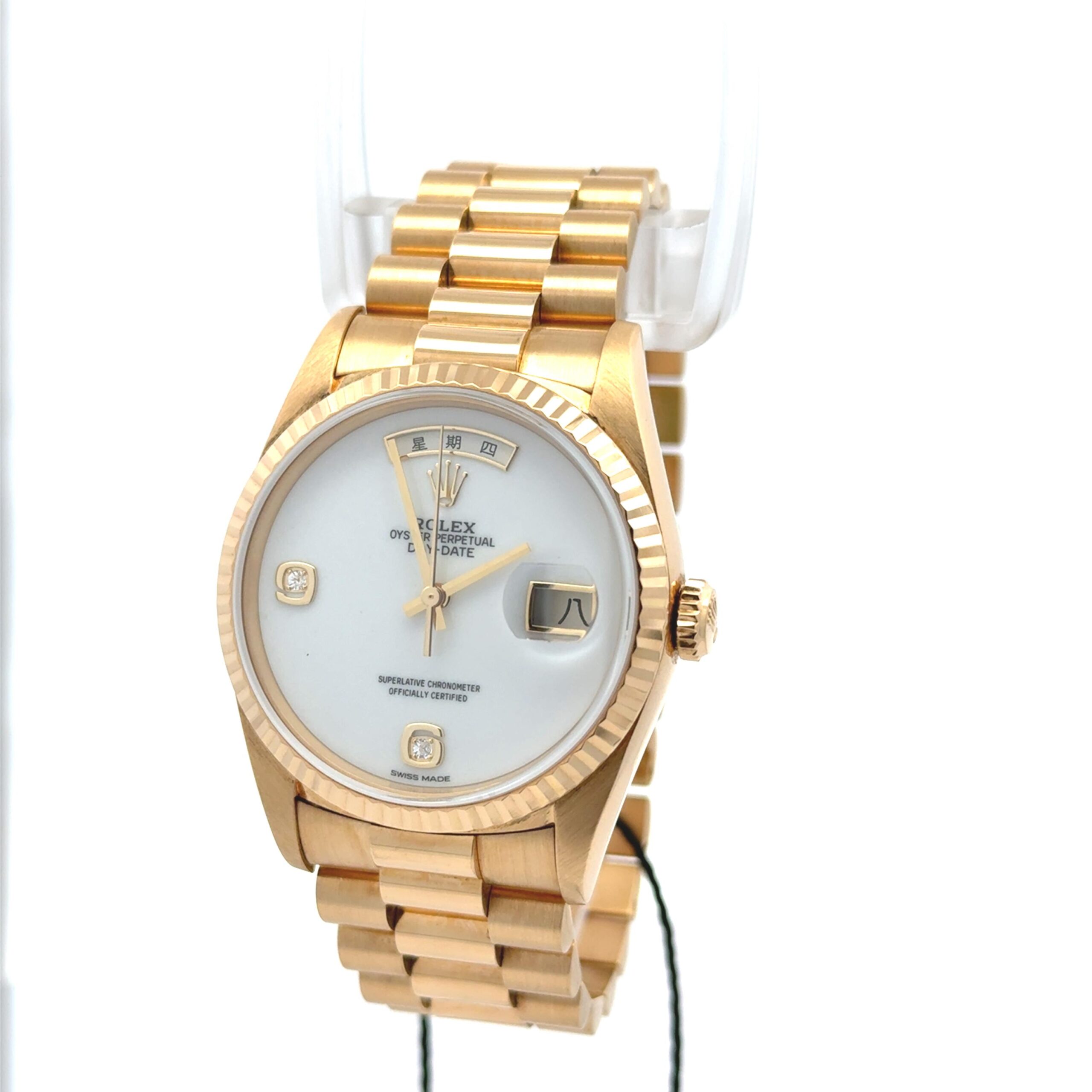 Rolex Day-Date Reference 18238 often called the "President," is a prestigious 18k yellow gold timepiece featuring a 36mm Oyster case, fluted bezel, and President bracelet, powered by the Calibre 3155 movement for independent day and date adjustment. Its most distinguishing characteristic is the rare and captivating white Agata stone dial, providing a unique, naturally patterned surface that sets it apart from standard models and enhances its collectibility as a luxurious and visually distinctive horological piece.