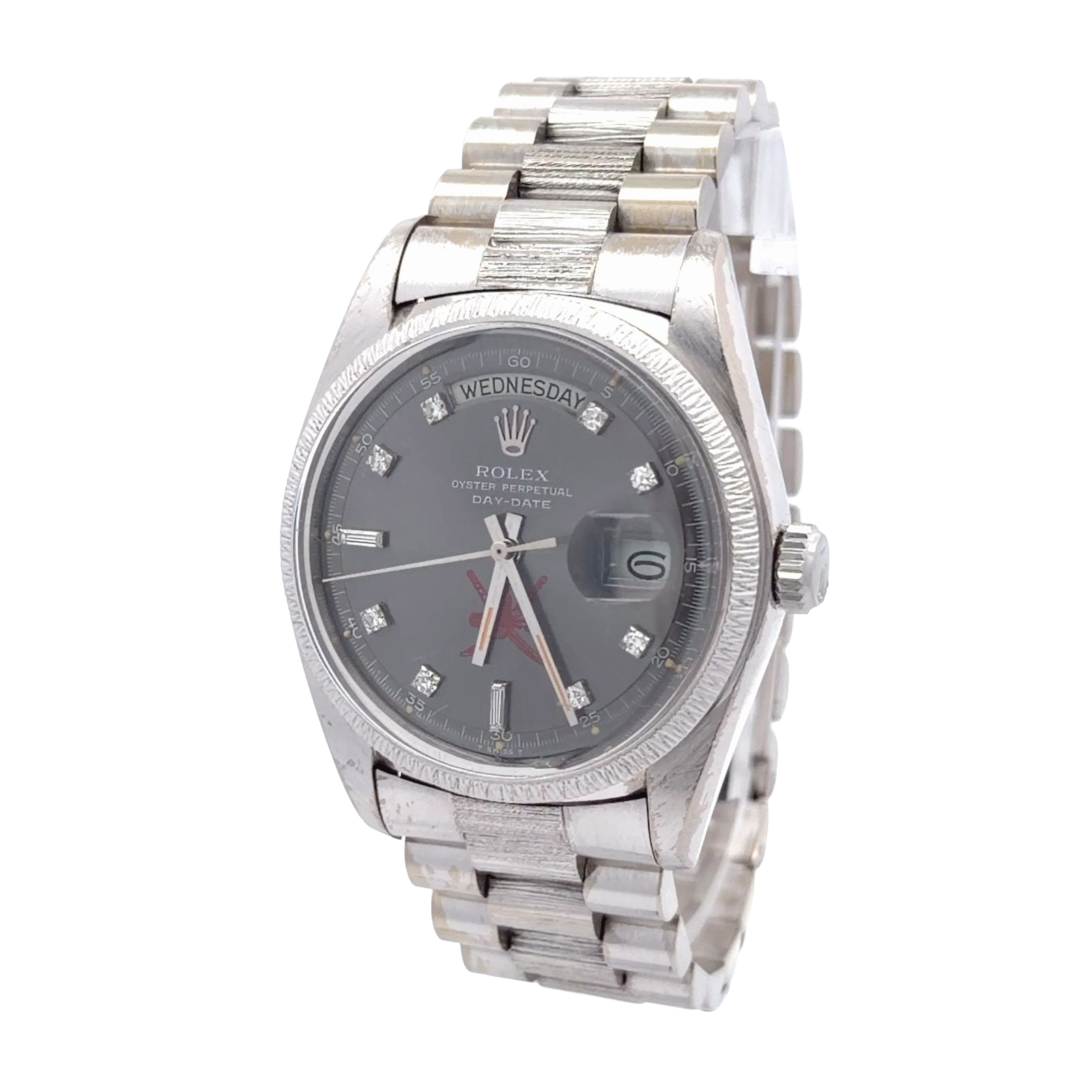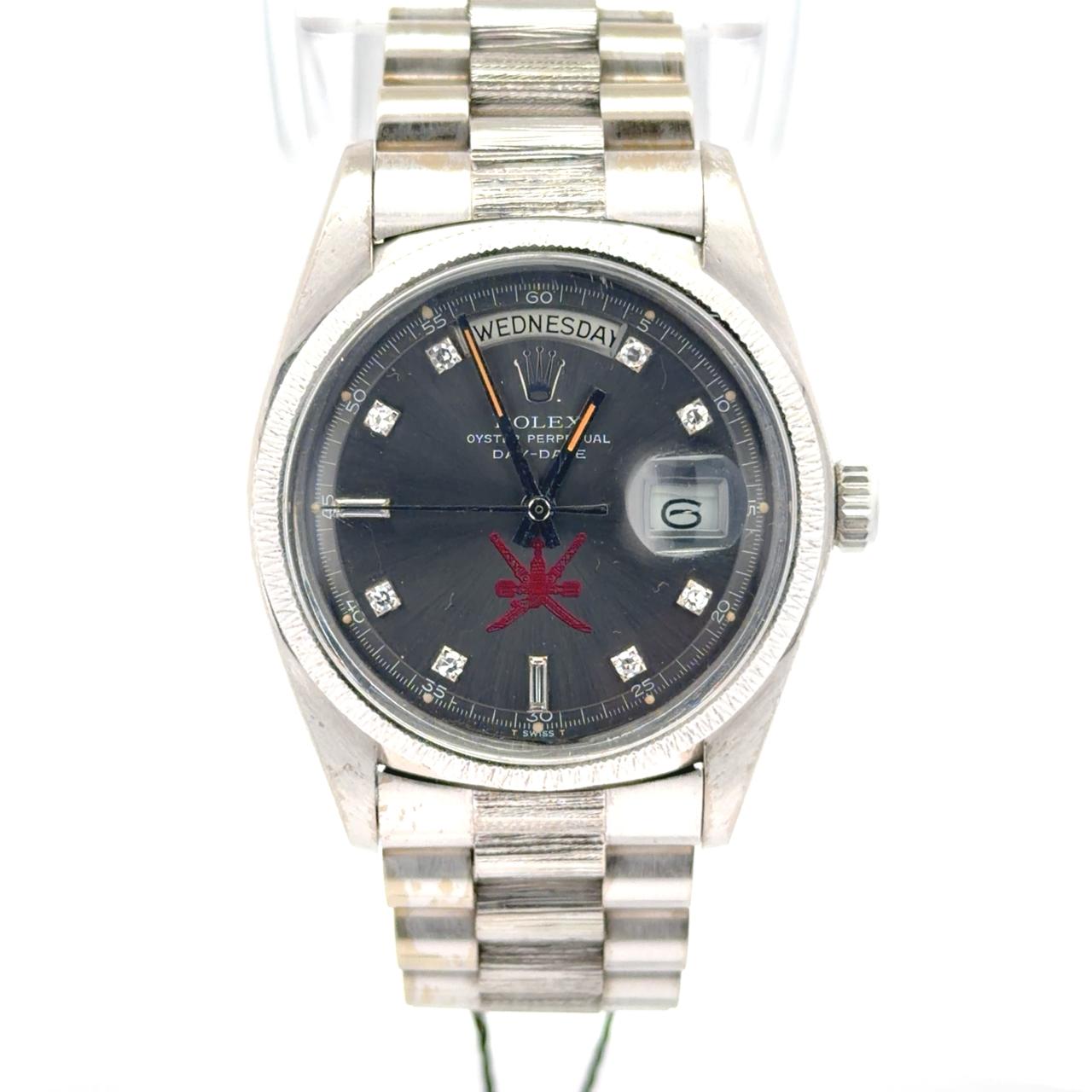 Rolex Day-Date reference 1807 with the Omani "Khanjar" emblem is an exceptionally rare and historically significant timepiece. It features 36mm Oyster case with its distinctive "bark" finish on both the bezel and the center links of the President bracelet. The dial displays the day of the week spelled out in full at 12 o'clock and the date at 3 o'clock. Most notably, the national emblem of Oman—the red Khanjar (a dagger within its sheath and crossed swords)—is prominently featured above the 6 o'clock position.