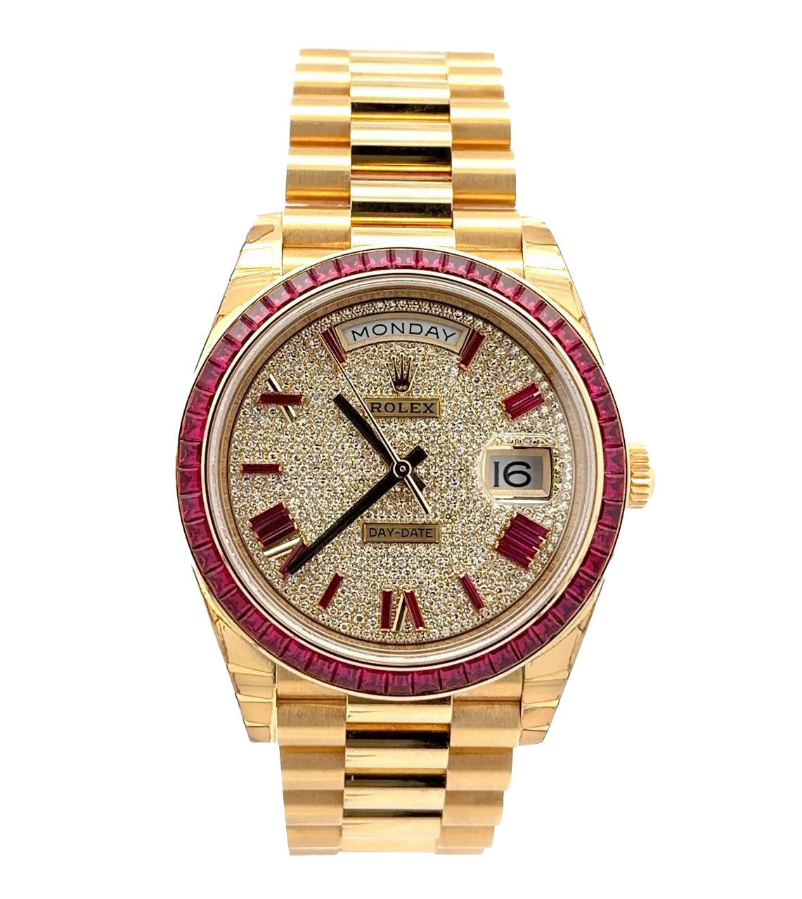 Rolex Day-Date 40 reference 228398TRU is a striking expression of luxury and exclusivity, crafted in solid 18k yellow gold and designed for those who appreciate bold elegance. Its bezel is set with a stunning array of baguette-cut rubies, complementing the diamond-paved dial that exudes brilliance and sophistication. The dial features ruby-set baguette hour markers, adding a vivid contrast against the shimmering diamond backdrop, while the iconic day display at 12 o’clock and date aperture at 3 o’clock showcase Rolex’s signature functionality. Equipped with the reliable self-winding caliber 3255 movement, the watch offers superior precision and performance, along with a 70-hour power reserve.