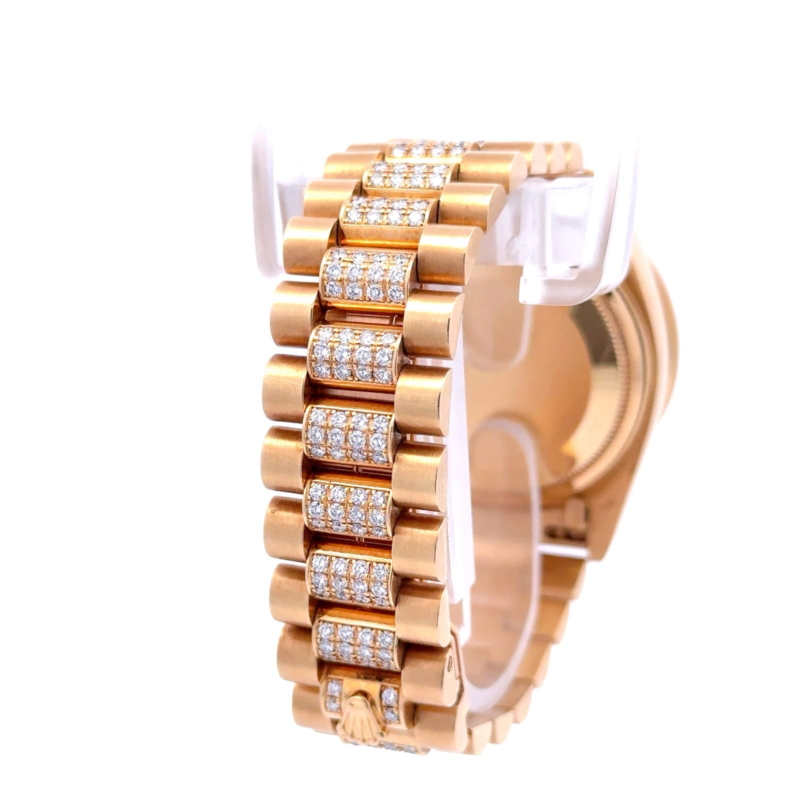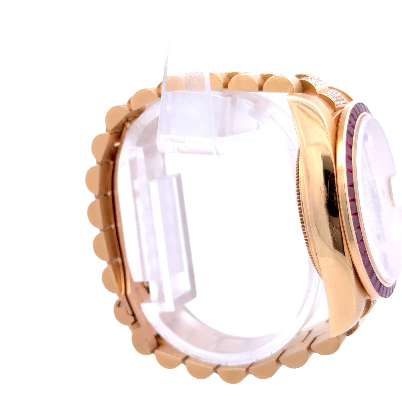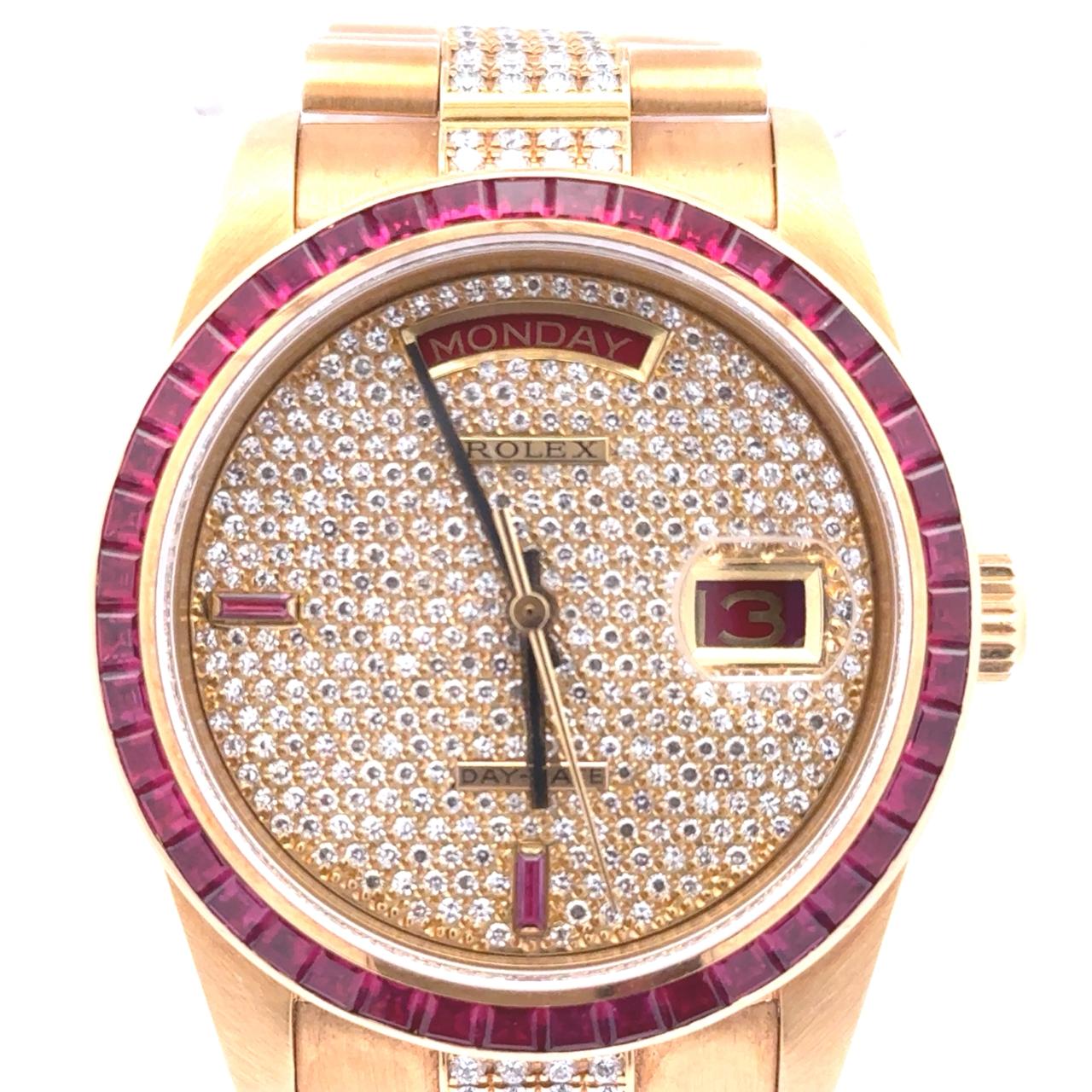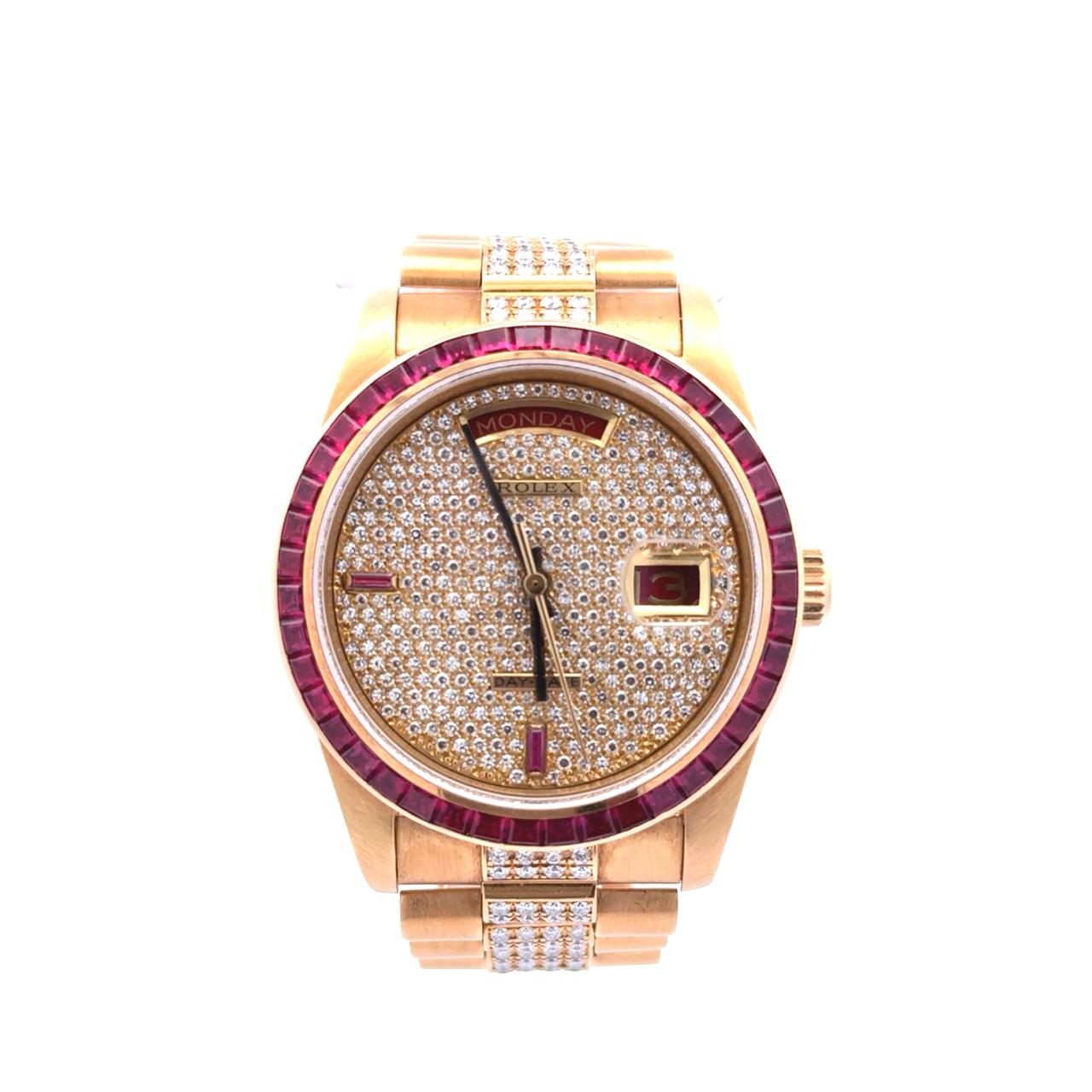 Rolex Day-Date Ref. 18068 is an exceptionally rare and opulent timepiece, celebrated for its lavish gemstone setting and elite collector status. Crafted in 18k yellow gold and the standout feature is its ruby-set bezel, composed of 44 square-cut rubies, a rarity even among Rolex’s gem-set offerings. The pavé diamond dial is equally extravagant, adorned with brilliant-cut ruby hour markers, including baguette rubies at 6 and 9 o’clock, creating a harmonious balance with the red-toned day and date windows. To enhance legibility against the dazzling dial, Rolex fitted the watch with a contrasting black handset. The President bracelet, also in 18k gold and set with diamonds, completes the regal aesthetic, while the Caliber 3055 automatic movement ensures reliable performance beneath the glamour.