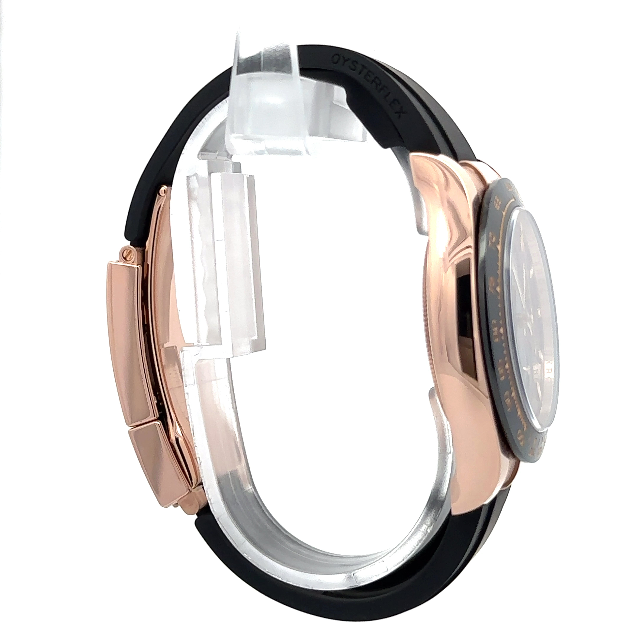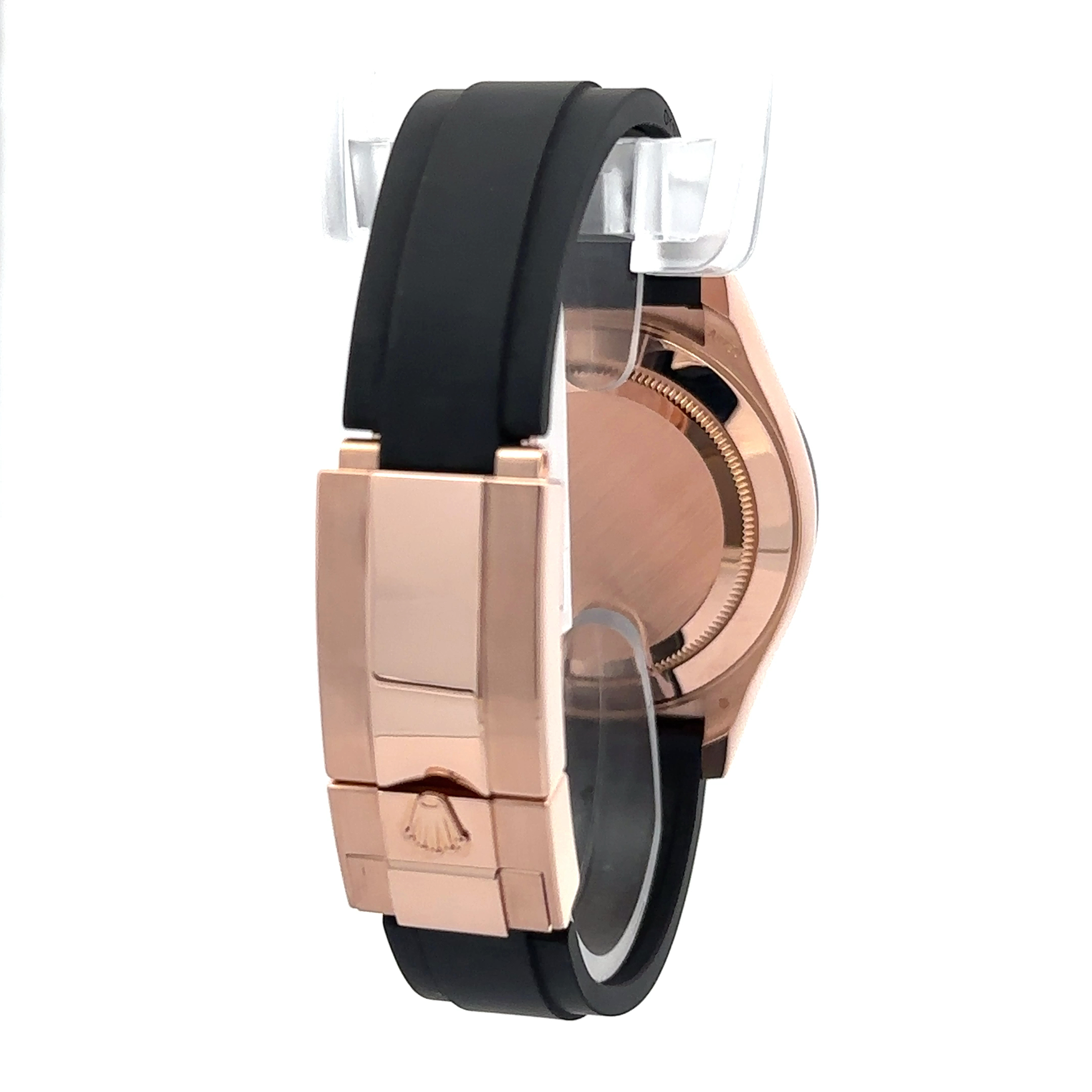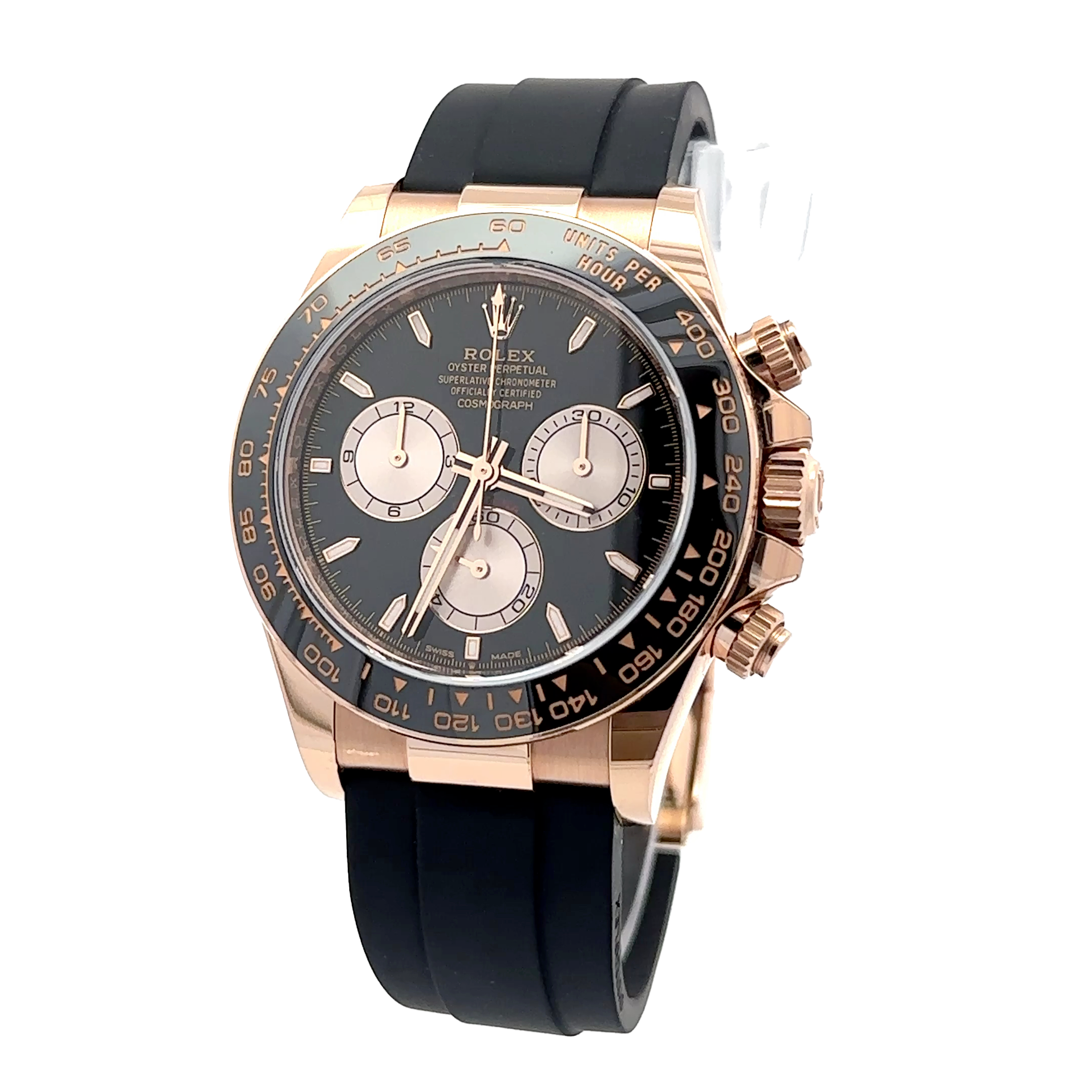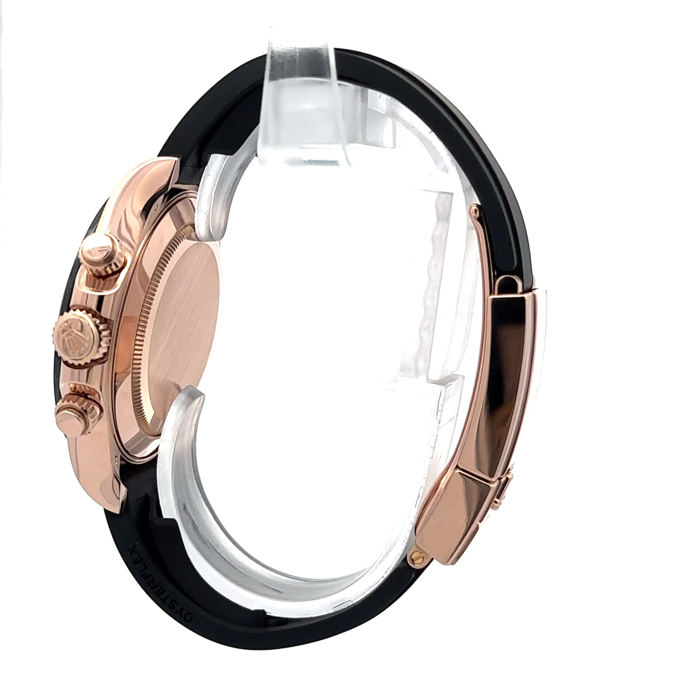 Rolex Cosmograph Daytona reference 116515LN housed in a 40mm 18k Everose gold case, it exudes a warm, luxurious tone that resists fading over time. The watch is distinguished by its black Cerachrom bezel with engraved tachymetric scale, providing durability and a sharp contrast against the pink hue of the case. The dial is chocolate brown featuring chronograph sub-dials at 3, 6, and 9 o'clock, along with 18k gold applied hour markers and Chromalight luminescence for optimal legibility. Powered by the robust caliber 4130 automatic chronograph movement, it offers a 72-hour power reserve and COSC-certified precision. The watch is paired with a black Oysterflex bracelet, Rolex’s high-performance elastomer strap that combines the comfort of rubber with the stability of a metal blade inside. With 100 meters of water resistance.
