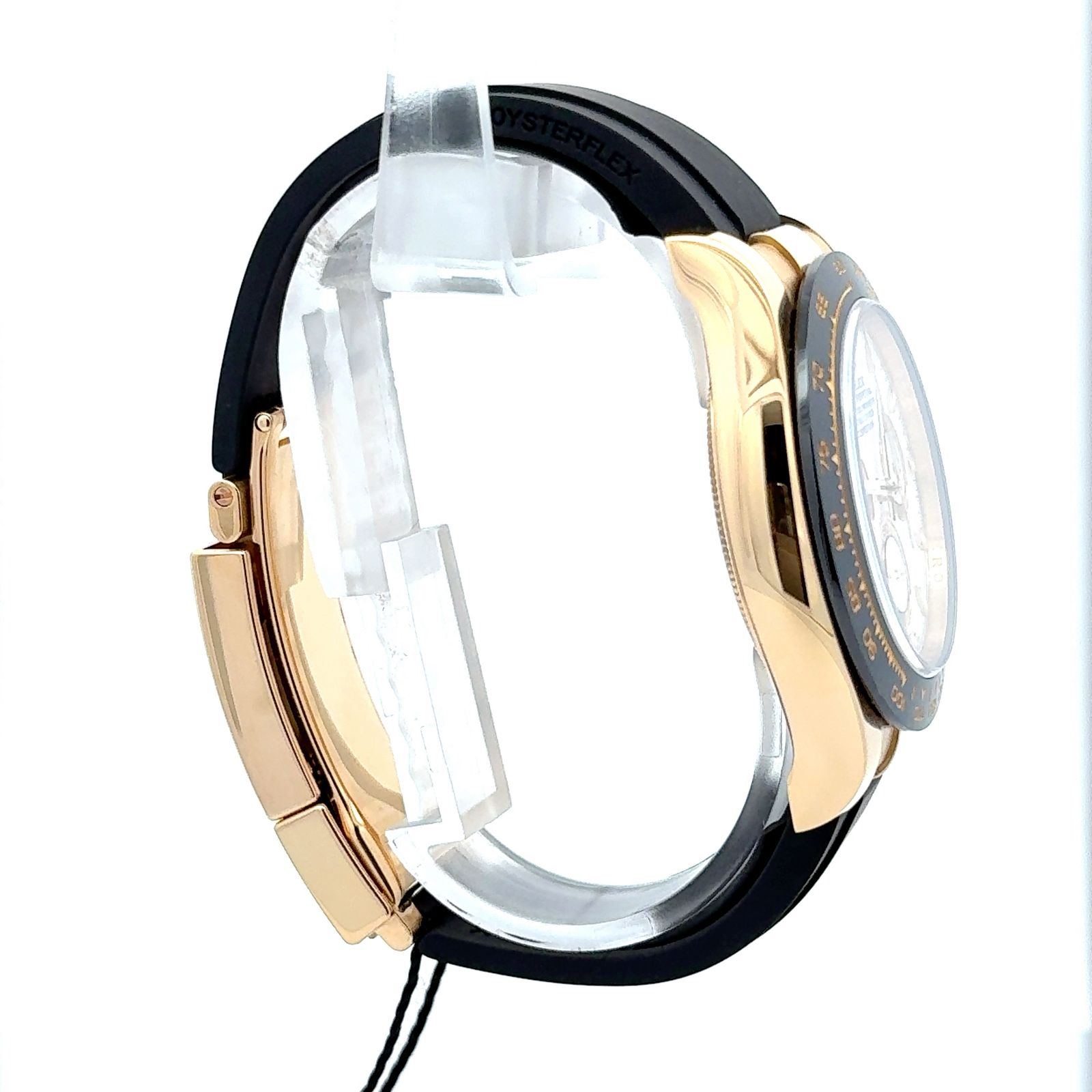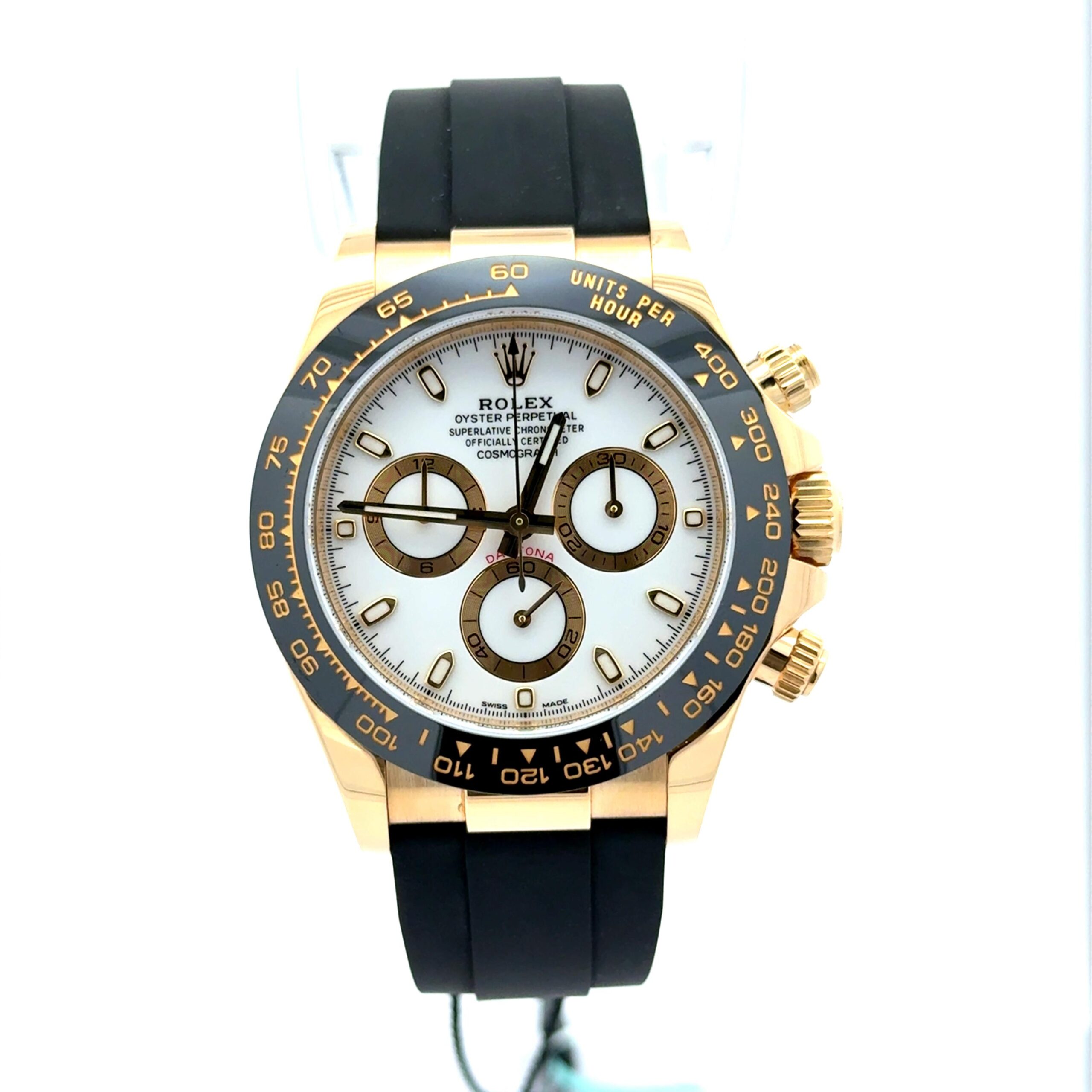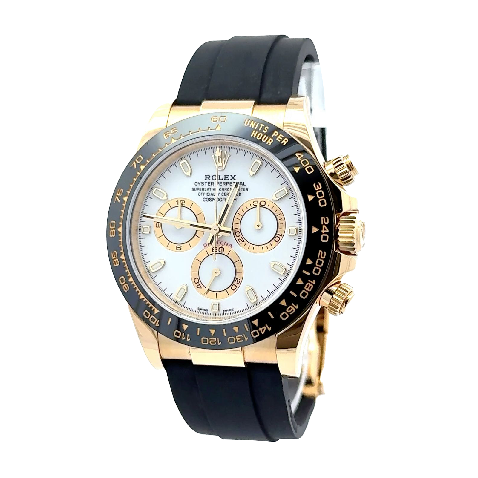 Rolex Cosmograph Daytona reference 116518LN is a luxurious and sporty chronograph that embodies precision and prestige. Crafted in 18k yellow gold, this model features a striking white dial with white sub-dials outlined in gold, enhancing legibility and adding depth to the design. The watch is fitted with a black Cerachrom ceramic bezel engraved with a tachymeter scale, emphasizing its racing-inspired heritage. At its heart beats the Rolex Caliber 4130, a self-winding chronograph movement known for its reliability, precision, and robust 72-hour power reserve. Completing the look is the innovative Oysterflex bracelet, combining the durability of a high-performance elastomer with the comfort and flexibility of a rubber strap, while incorporating a flexible titanium-nickel blade for strength. Waterproof to 100 meters, the Daytona 116518LN is both elegant and functional, making it a perfect companion for those who seek a balance of performance, luxury, and timeless design.