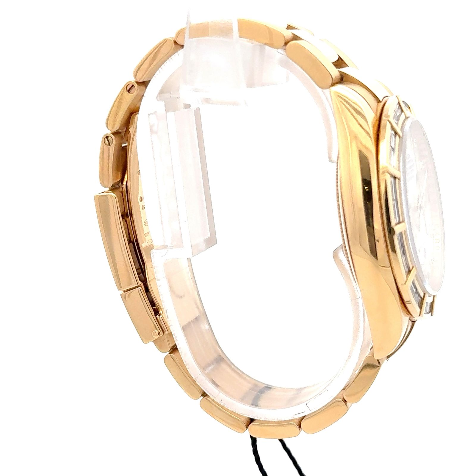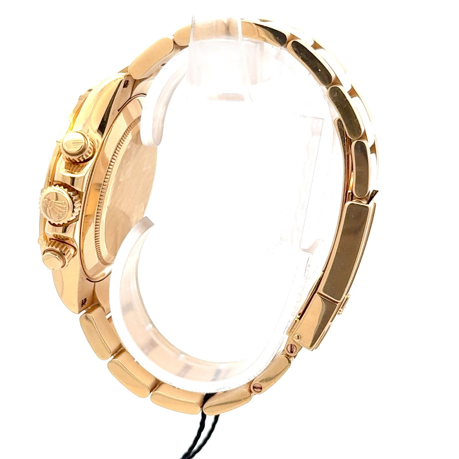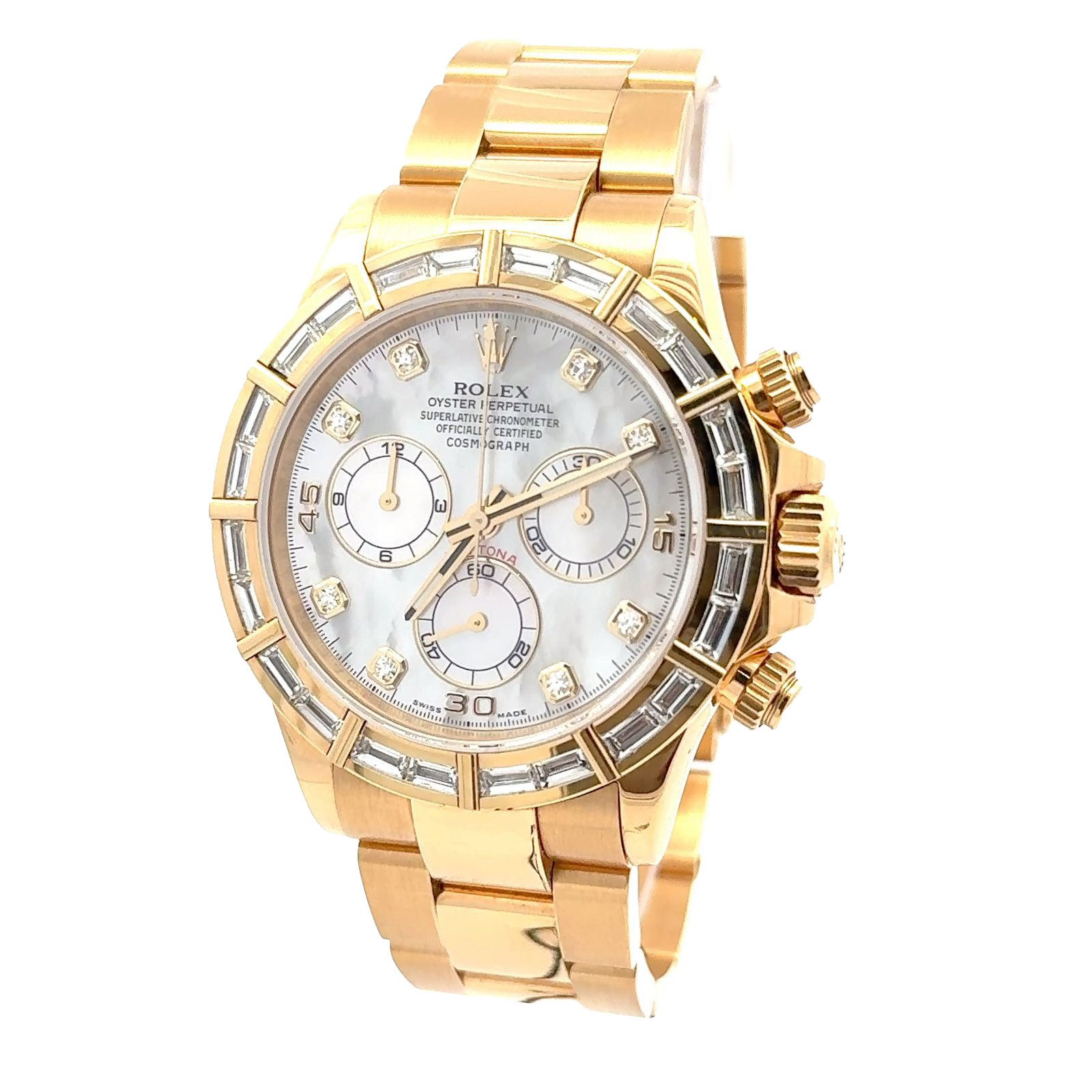 This remarkable Rolex Daytona, reference number 116568, is a highly sought-after luxury chronograph that showcases the brand's legendary craftsmanship and timeless design. Manufactured in 2003, this exceptional timepiece is crafted entirely from luxurious yellow gold, including the 40mm case, fixed bezel, and solid bracelet, creating a striking and cohesive aesthetic that exudes sophistication and prestige. The watch is powered by a high-performance automatic movement, offering a generous 72-hour power reserve, ensuring accurate and reliable timekeeping even after days off the wrist. Its chronograph function, a hallmark of the Daytona series, provides precise time interval measurement, catering to both professional timing needs and refined tastes. Encased under a durable sapphire crystal, the dial is a mesmerizing mother-of-pearl, giving each piece a unique and elegant visual appeal. The absence of numerals on the dial emphasizes the minimalist elegance and highlights the natural beauty of the material.