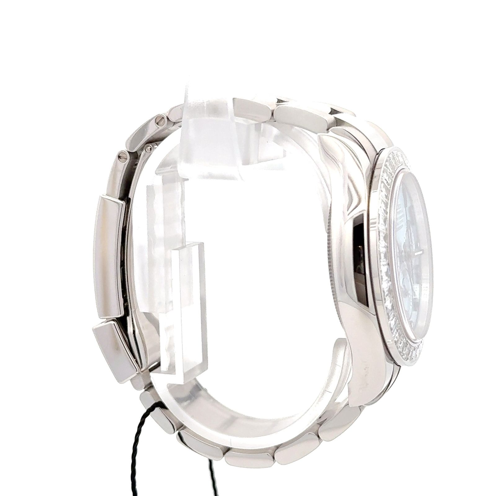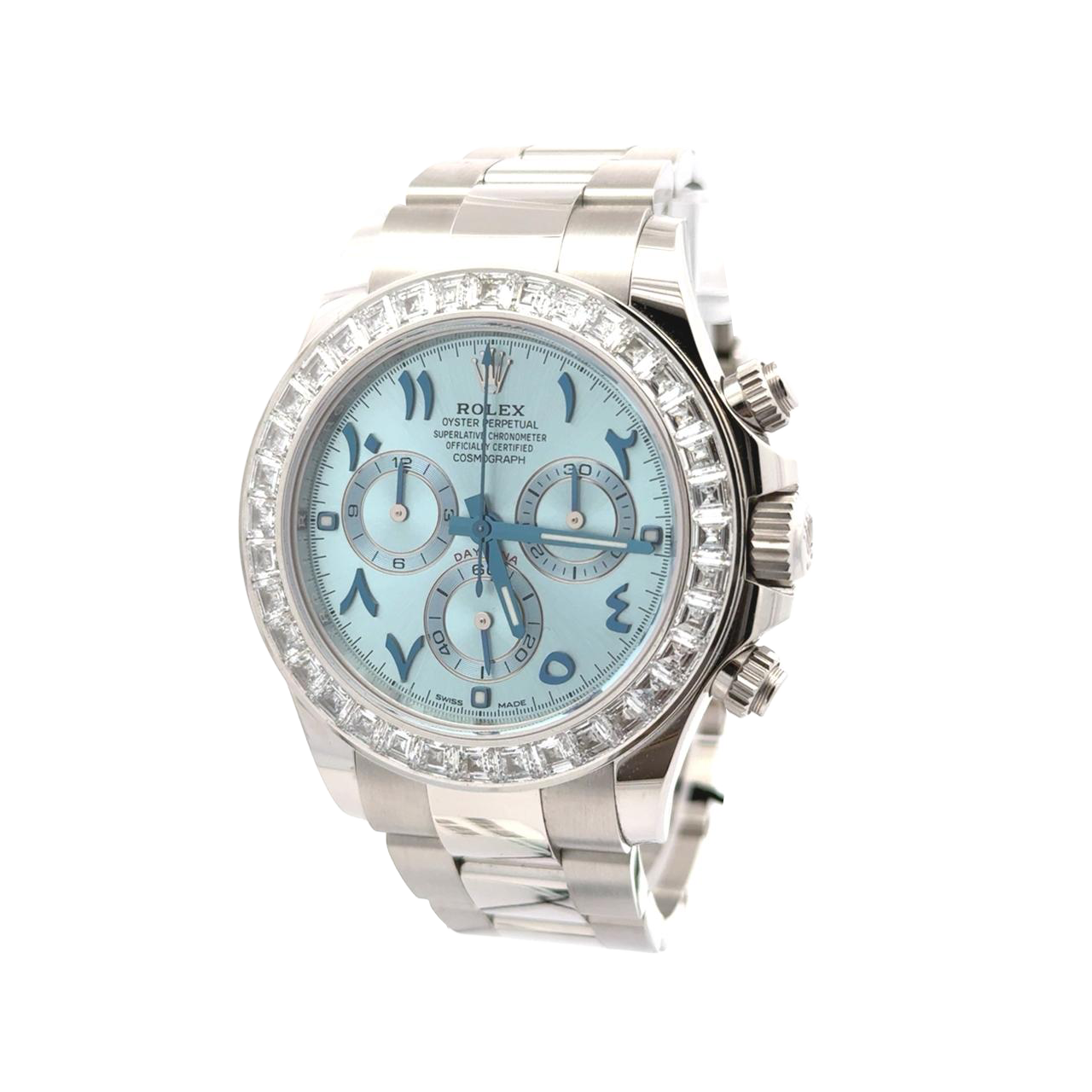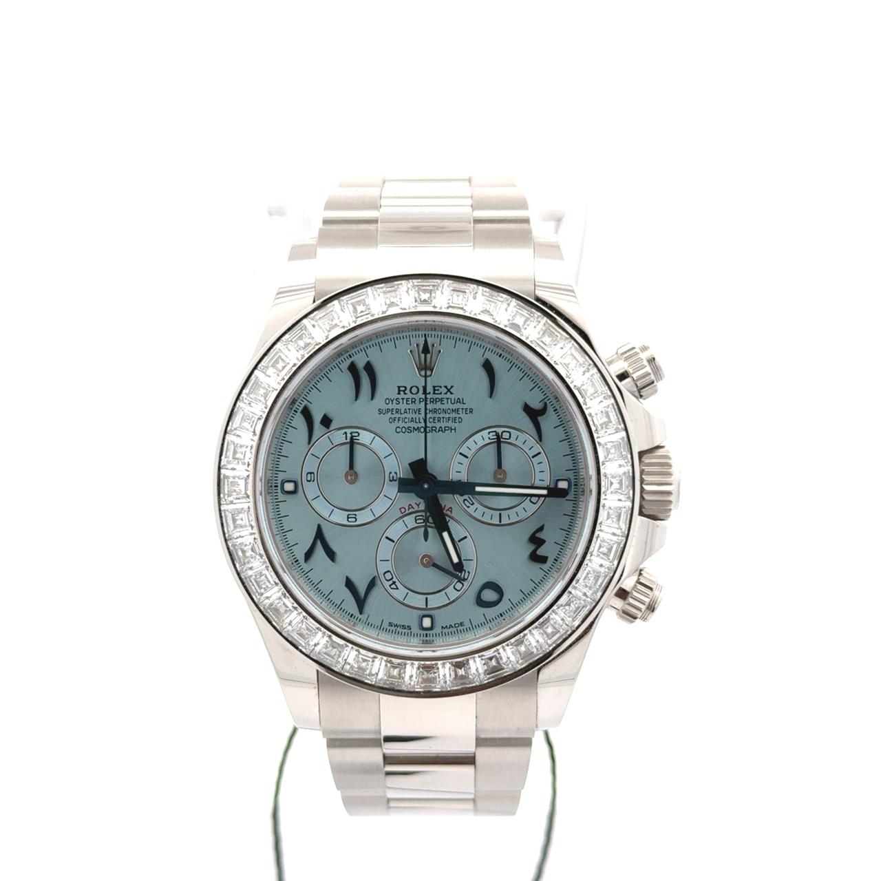 Rolex Cosmograph Daytona 116576TBR is a dazzling expression of technical mastery and gem-setting artistry, crafted in platinum and adorned with baguette-cut diamonds that elevate the iconic racing chronograph into the realm of haute horlogerie. This reference features a 40 mm platinum case paired with a matching Oyster bracelet, offering substantial wrist presence and a cool, silvery sheen. The bezel is set with 36 baguette-cut diamonds, replacing the traditional tachymeter scale with a radiant halo that refracts light from every angle. The ice blue dial, exclusive to Rolex platinum models, is accented with Arabic numerals, chromed sub-dials, and luminous hands, maintaining legibility while exuding elegance. The chronograph layout includes a 30-minute counter at 3 o’clock, 12-hour counter at 9 o’clock, and small seconds at 6 o’clock, all powered by the Rolex Caliber 4130—a COSC-certified automatic movement with a 72-hour power reserve and vertical clutch column wheel architecture for precise timing. The watch is equipped with a screw-down crown and pushers, ensuring water resistance up to 100 meters, and features Rolex’s Parachrom hairspring for enhanced shock and temperature resistance. The Oyster lock clasp and Easyl ink extension system provide secure and adjustable wearability.