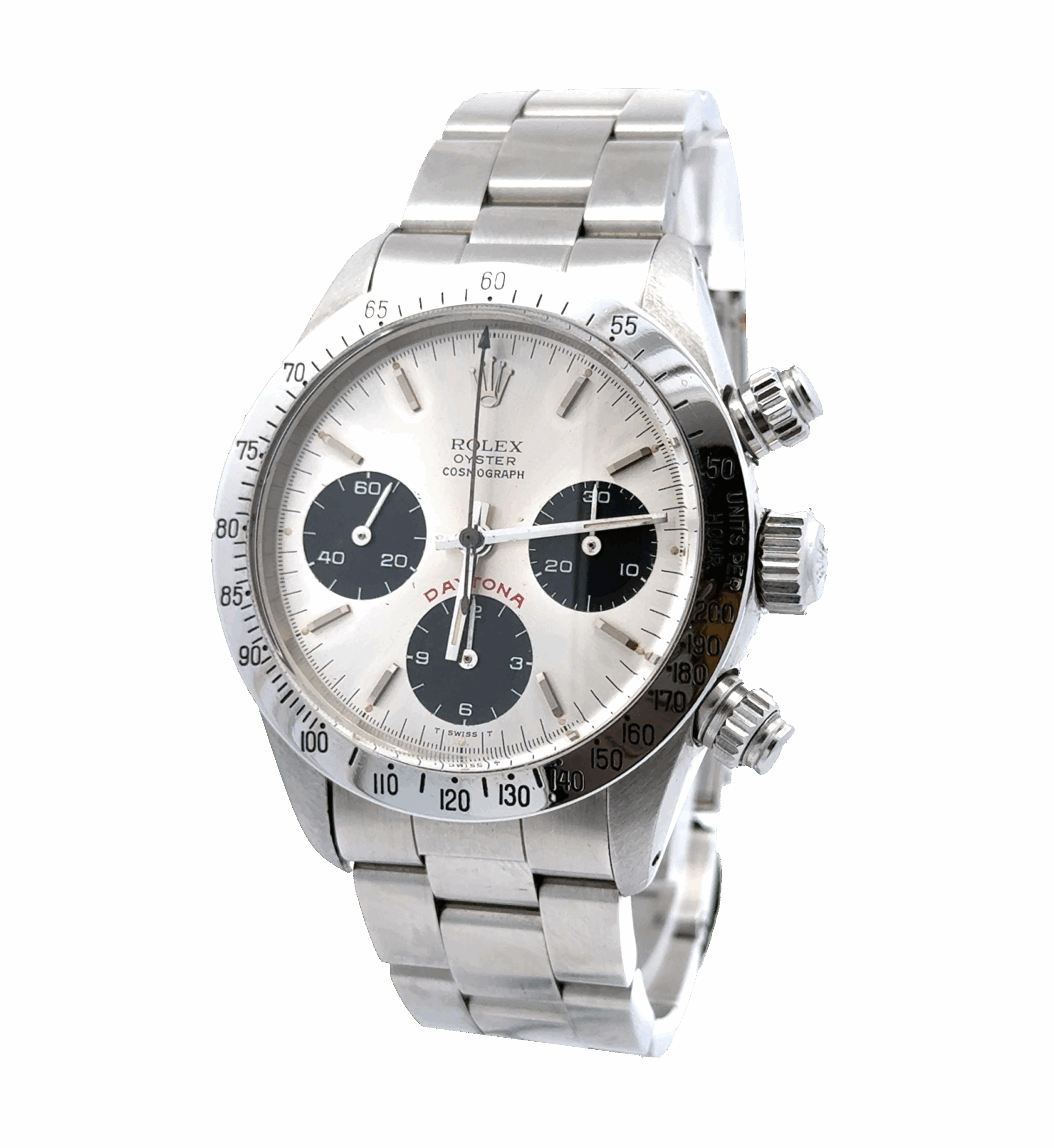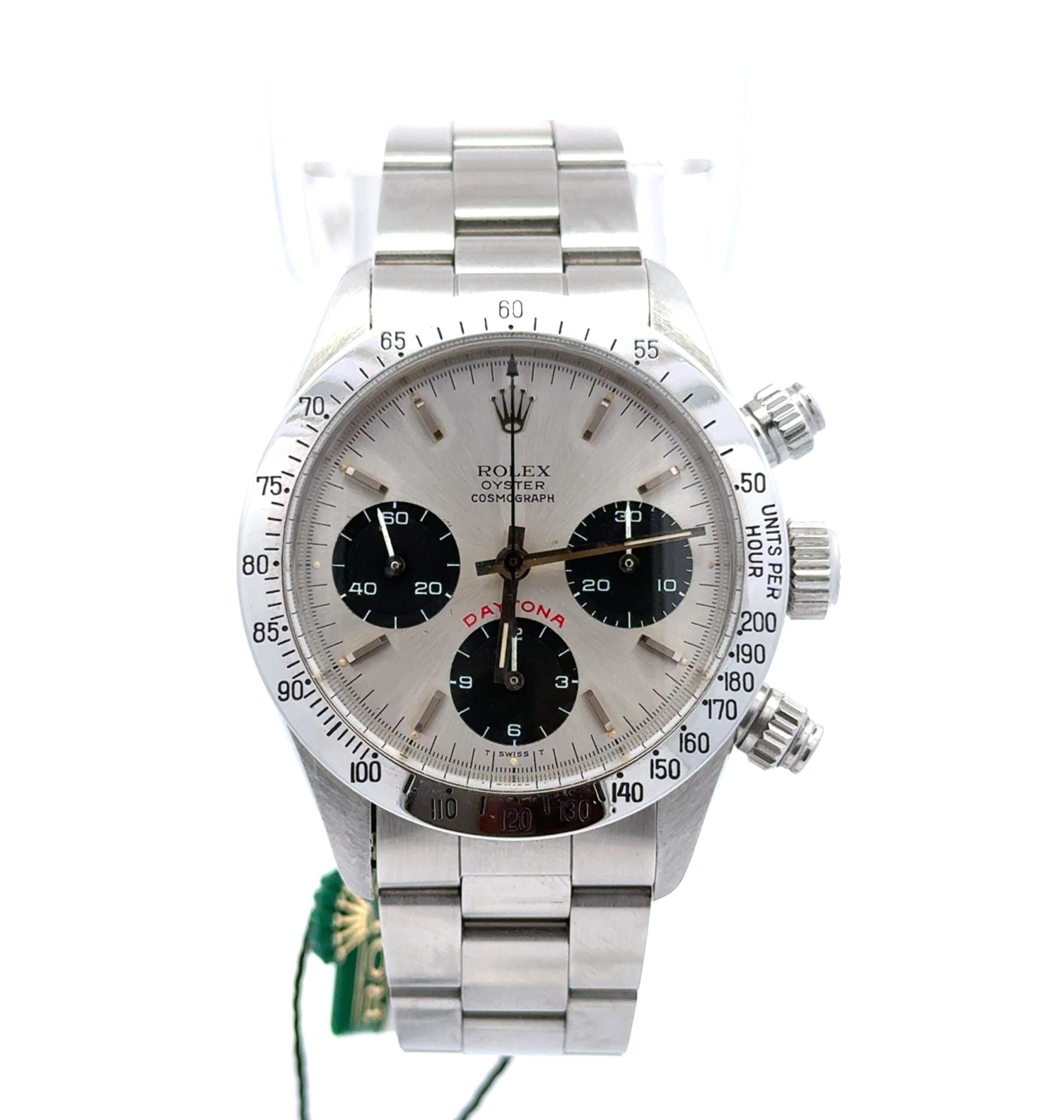 Rolex Daytona 6265 is a legendary vintage chronograph, renowned for its robust design, precision, and deep-rooted connection to motorsports. it remains one of the most iconic manual-wind Daytona models, featuring a stainless steel or 18k yellow gold case, a screw-down crown, and pump pushers that enhance its water resistance. The watch boasts a 37mm Oyster case with a screw-down case back and pushers, ensuring durability and reliability. Its engraved metal bezel incorporates a tachymeter scale, allowing for precise speed measurement. Available with a black or silver dial, the timepiece features the classic three-register chronograph layout, with contrasting subdials for enhanced legibility. The acrylic crystal adds a distinctive vintage charm to the overall aesthetic.