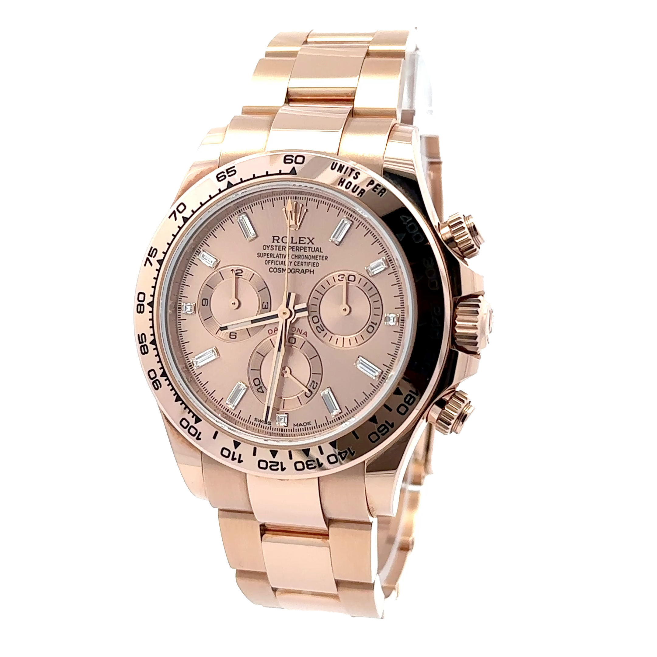 Rolex Cosmograph Daytona 116505 is a striking and luxurious chronograph, fully crafted in 40mm 18k Everose gold with baguette dial. The fixed Everose gold bezel features an engraved tachymetric scale, used to measure average speeds over a given distance.