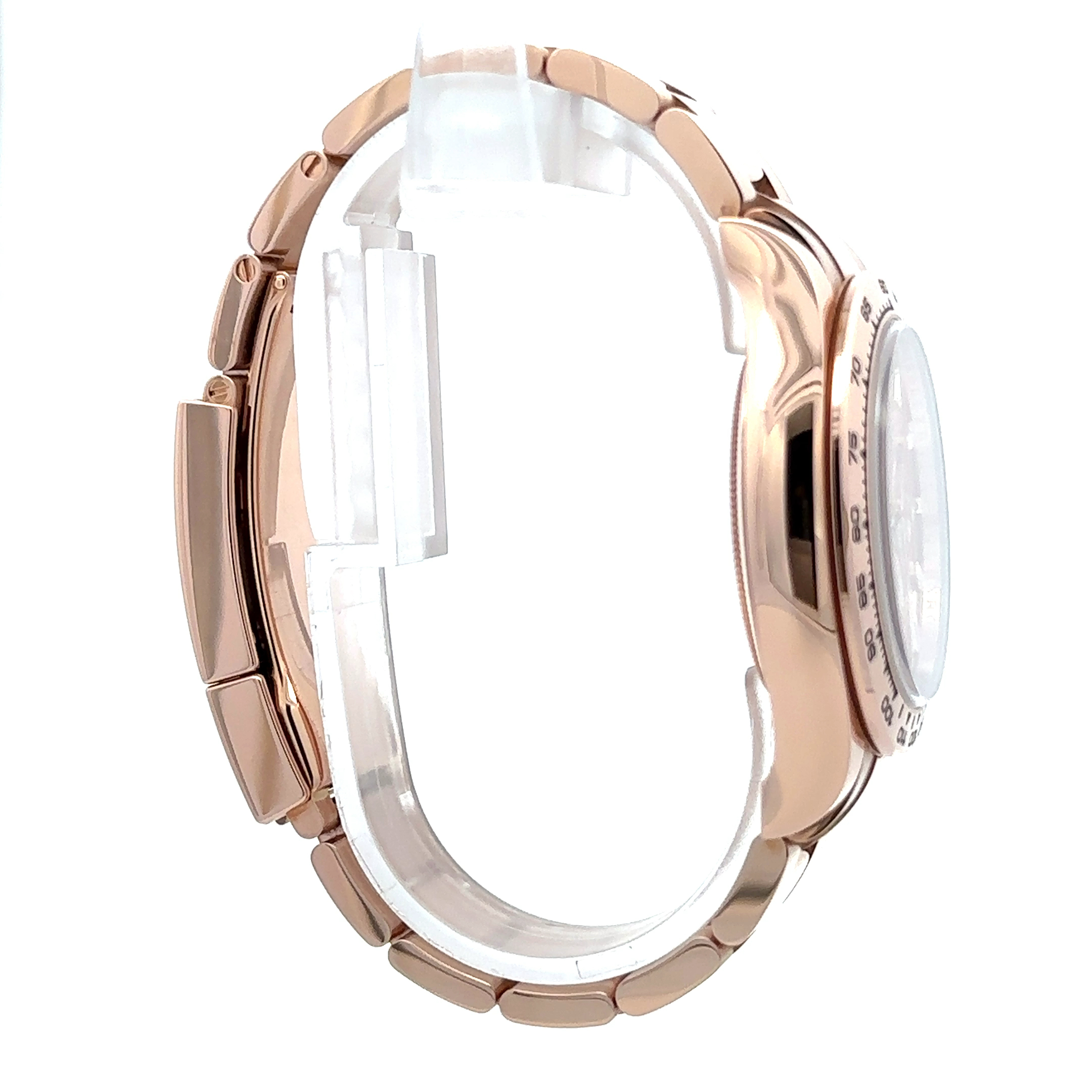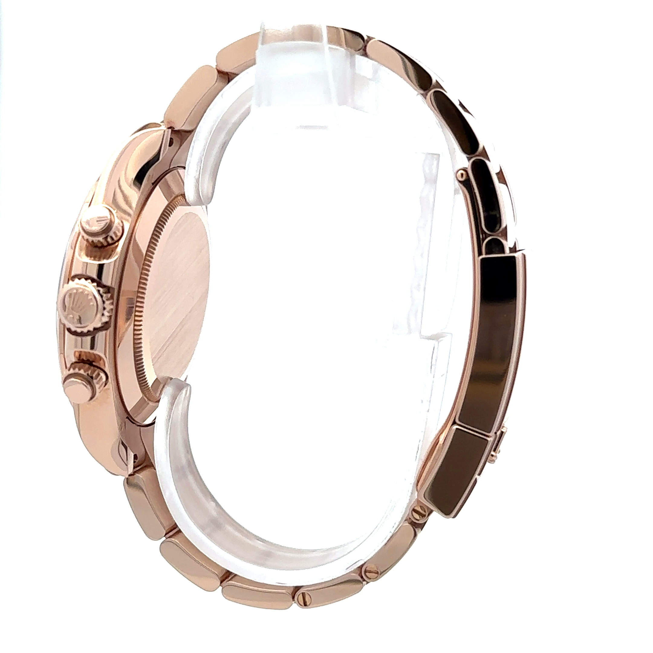 Inside beats the Rolex Caliber 4130, a highly reliable, in-house automatic chronograph movement with a vertical clutch and column wheel for precise stopwatch functionality. It offers a power reserve of approximately 72 hours and is COSC-certified, as well as a Superlative Chronometer for heightened accuracy. Fitted with the Oyster bracelet in Everose gold, complete with the Easylink comfort extension and Oysterlock safety clasp. Water-resistant to 100 meters.