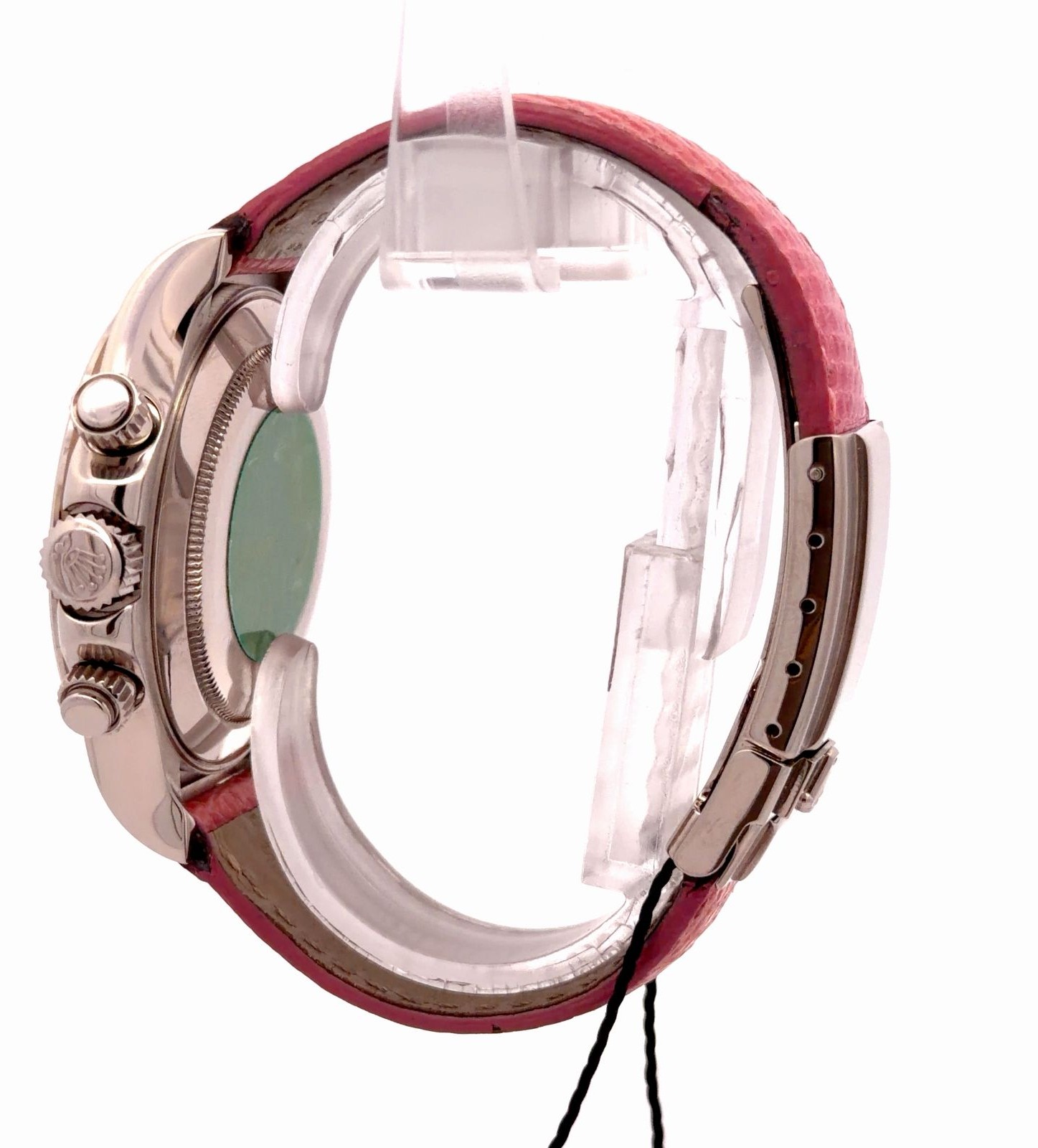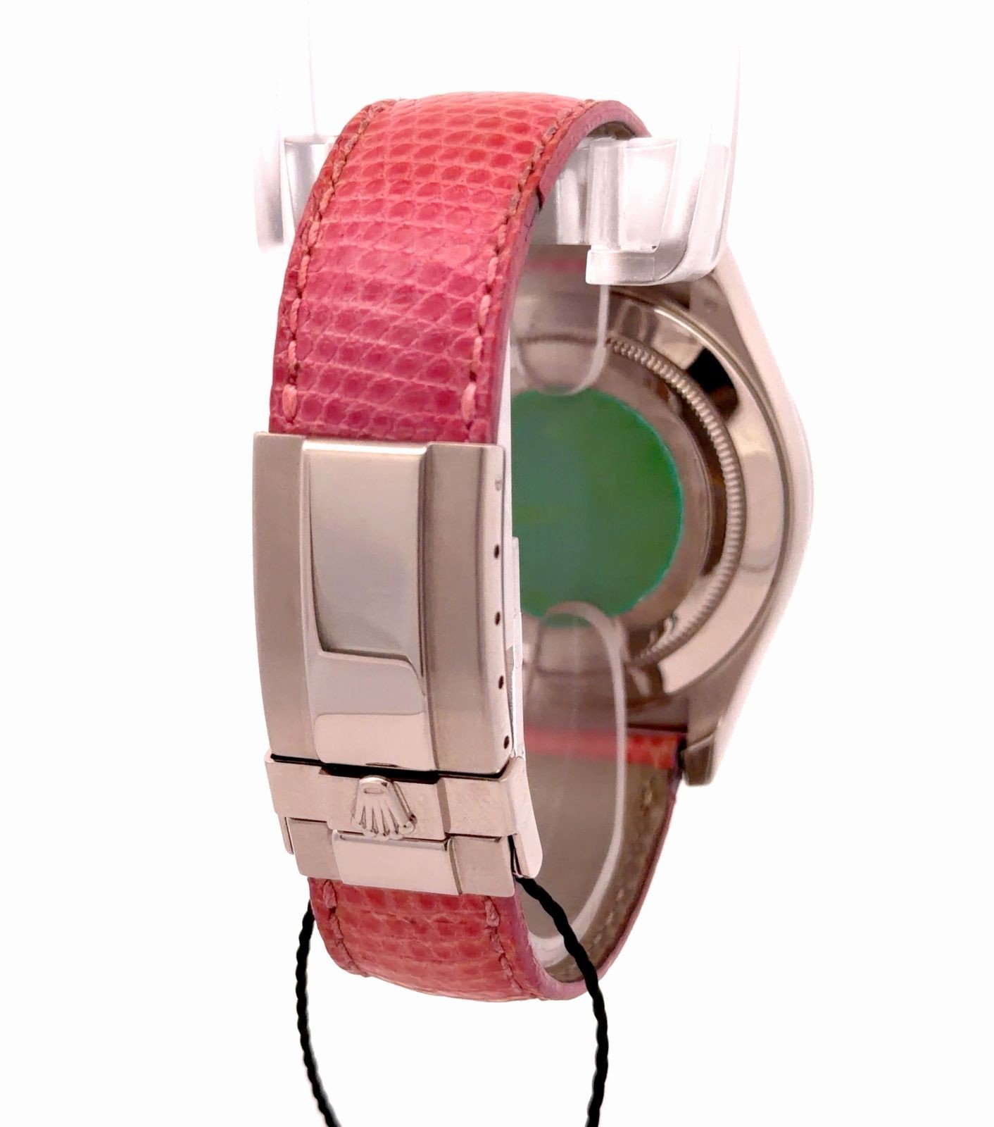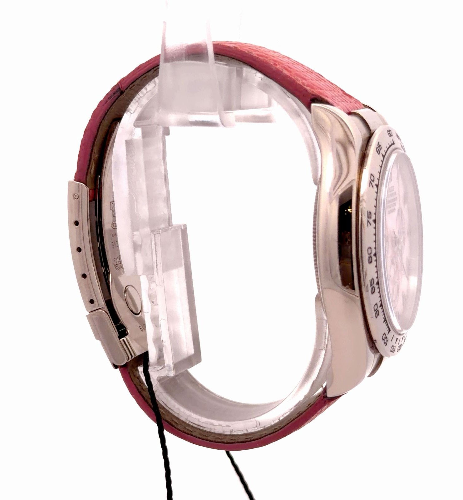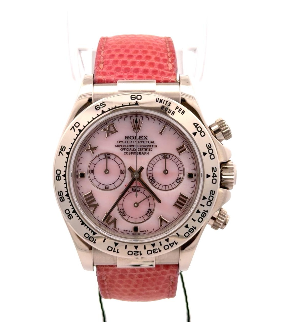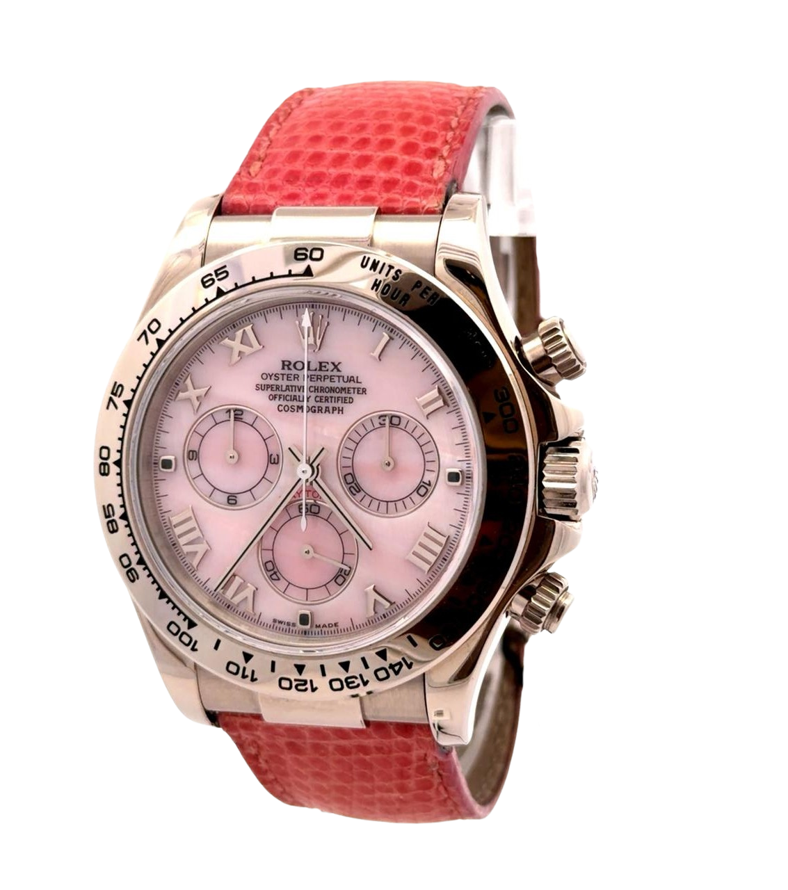 Rolex Cosmograph Daytona reference 116519 is a rare and highly collectible "Beach Edition" striking pink mother-of-pearl (MOP) dial. This 40mm timepiece is crafted in 18k white gold and is distinguished by its playful yet luxurious aesthetic, which marked a departure from the traditional tool-watch style of the Daytona line. The dial features Roman numeral markers and three chronograph registers, all powered by the high-performance Rolex Caliber 4130 automatic movement.
