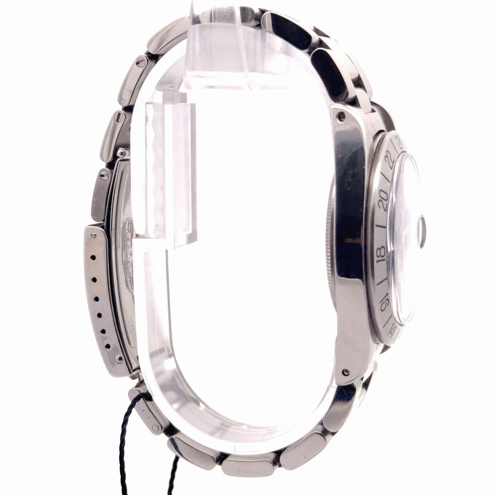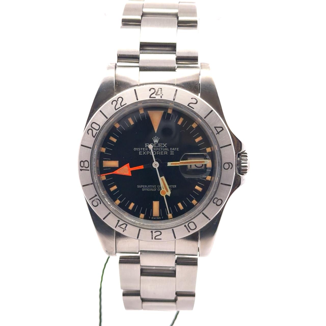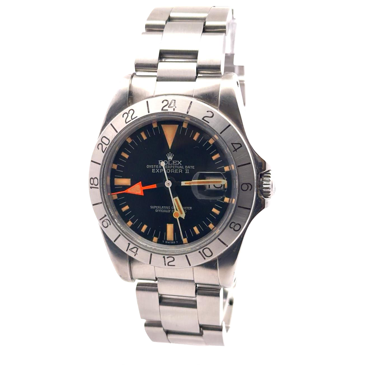 Rolex Explorer II Reference 1655 is a landmark tool watch that embodies Rolex’s commitment to functional design and professional utility. Launched in 1971, the 1655 was engineered specifically for cave explorers, polar researchers, and adventurers operating in environments where distinguishing day from night was critical. Unlike modern GMT watches, the 1655 features a fixed stainless-steel bezel engraved with a 24-hour scale, paired with an oversized bright orange 24-hour hand nicknamed “Freccione” (Italian for “arrow”). This hand makes one full rotation every 24 hours, allowing the wearer to instantly determine AM/PM orientation rather than track a second time zone.