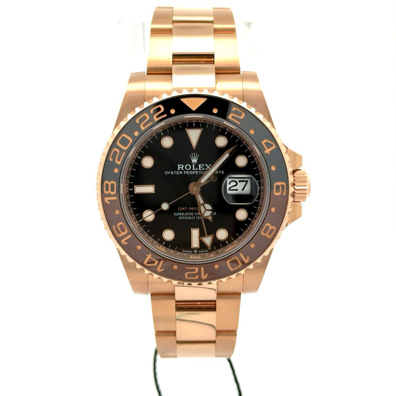 Rolex GMT-Master II 126715CHNR, affectionately nicknamed the “Root Beer,” is a striking blend of technical prowess and warm-toned luxury. Crafted entirely in 18ct Everose gold—a proprietary Rolex alloy—it features a bi-color Cerachrom bezel in glossy black and rich brown, evoking the nostalgic hues of its vintage predecessor. The black dial is punctuated by luminous hour markers and the signature GMT hand, allowing simultaneous tracking of two time zones, ideal for global travelers. A date window at 3 o’clock, magnified by the Cyclops lens, enhances legibility, while the robust Oyster case ensures water resistance up to 100 meters. Powered by the caliber 3285, this model boasts a 70-hour power reserve and Rolex’s Superlative Chronometer certification for precision and reliability.