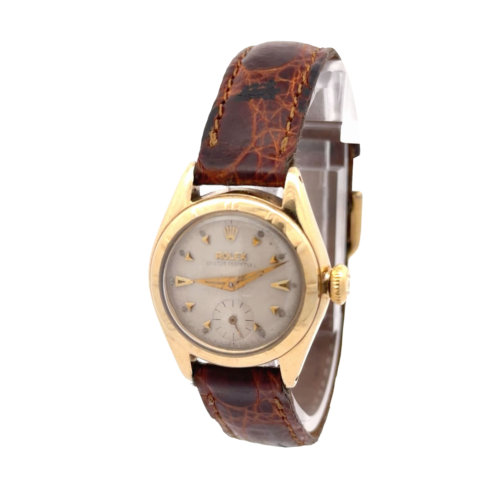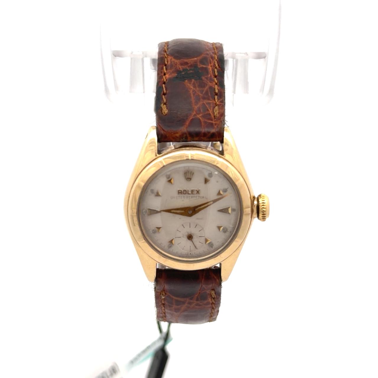 Rolex Oyster Perpetual Ref. 5003 is a charming vintage timepiece encased in 18k yellow gold, this model features a compact 24 mm case with a rounded “bubbleback” profile and screw-down crown and caseback, reflecting Rolex’s pioneering waterproof design. The champagne dial is adorned with applied gold dart indices and Arabic numerals at the quarters, complemented by a subsidiary seconds dial at 6 o’clock and leaf-shaped hands.