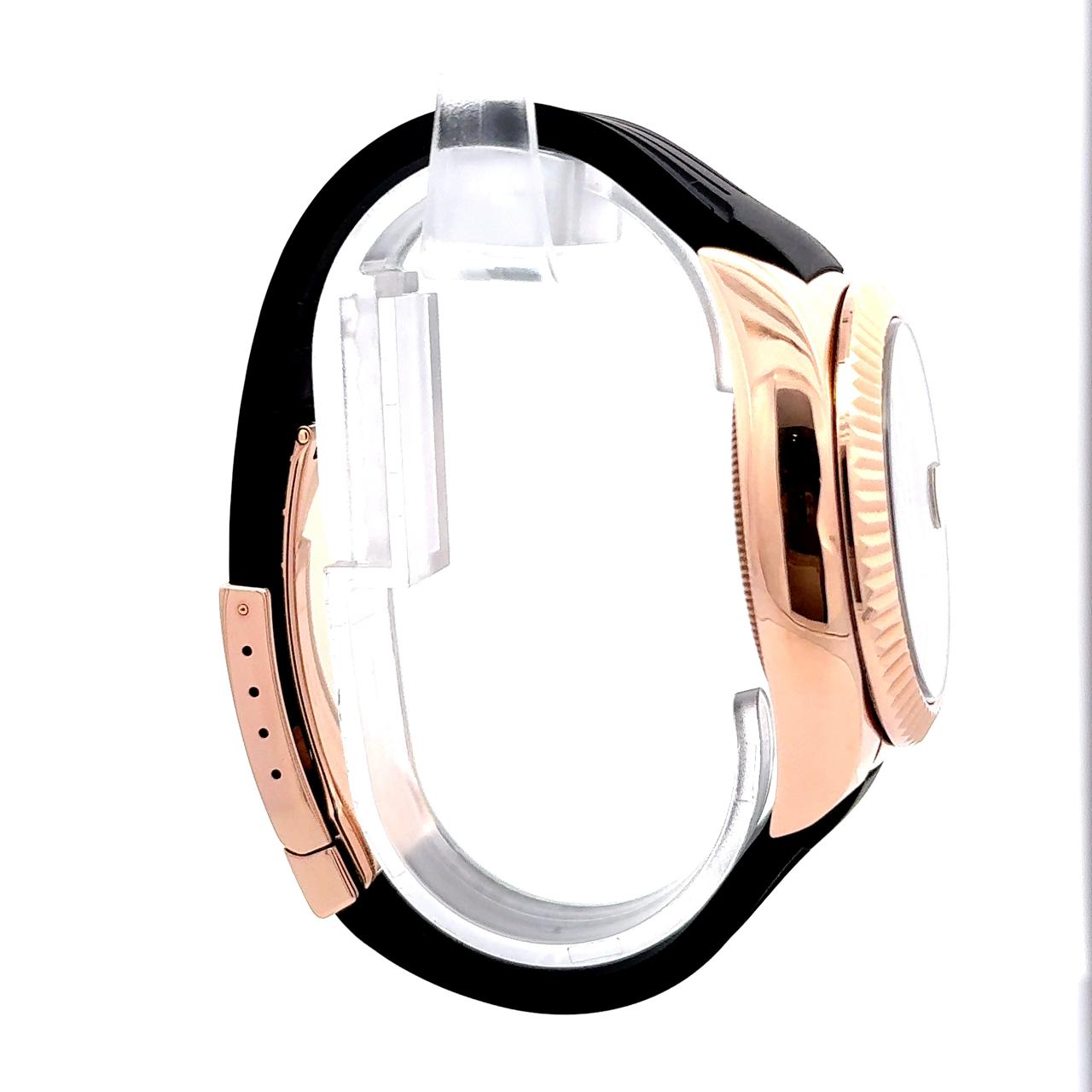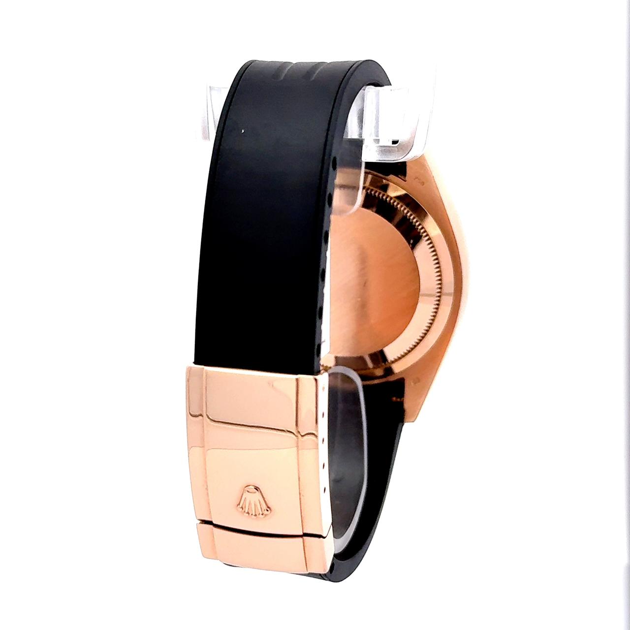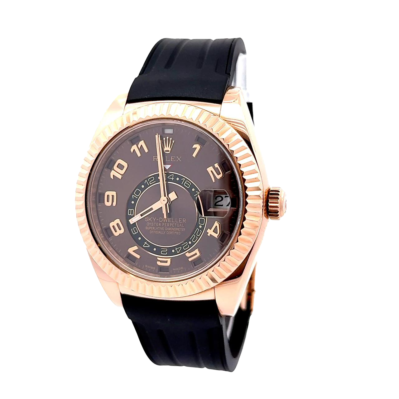 Rolex Sky-Dweller 326135 with a brown dial and fitted with a black Oysterflex rubber strap is a striking fusion of technical sophistication and sporty elegance. Housed in a 42mm 18k Everose gold case, Rolex’s proprietary rose gold alloy, the warm tones of the case beautifully complement the rich chocolate sunray-finish dial, creating a luxurious and contemporary aesthetic.