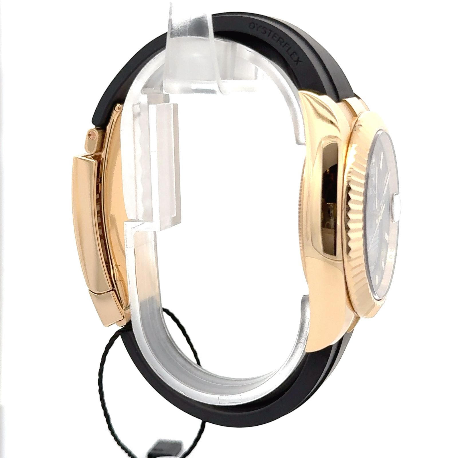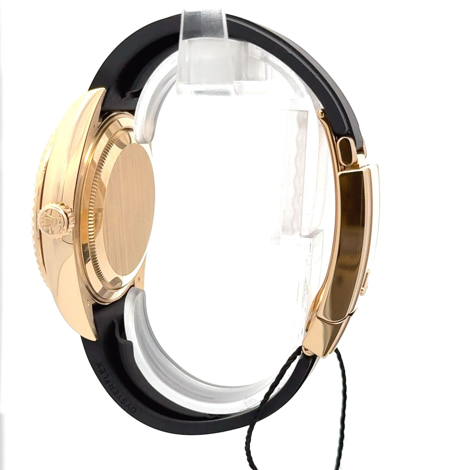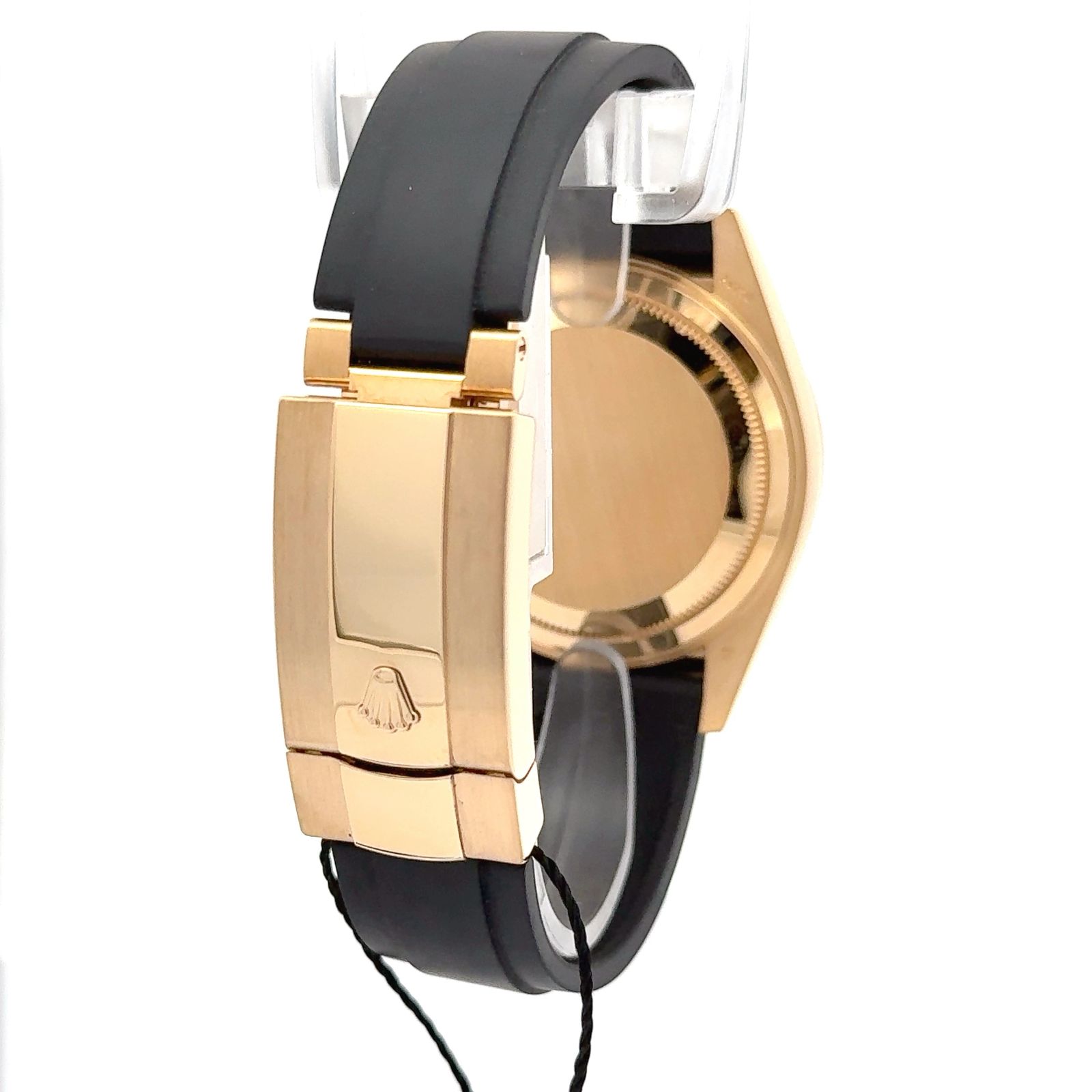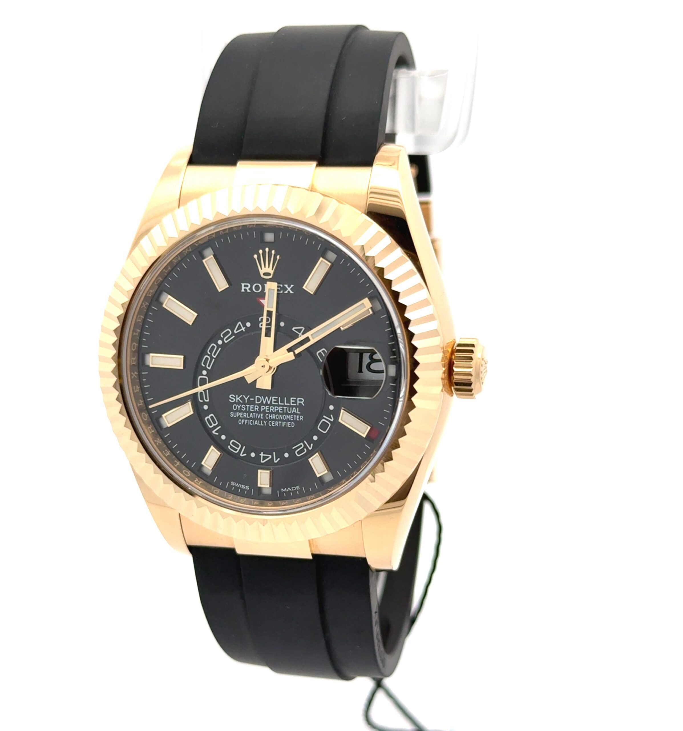 Rolex Sky-Dweller reference 326238 is an 18ct yellow gold timepiece featuring a 42mm case and a black dial, typically fitted with a black Oysterflex rubber bracelet. The watch is powered by the Rolex calibre 9001 automatic movement, which includes a 24-hour display on an off-centre disc for the second time zone, an instantaneous annual calendar at 3 o'clock. The fluted bidirectional rotatable bezel is not only a signature Rolex aesthetic but also a functional component of the Ring Command system, allowing seamless adjustment of the watch's settings.