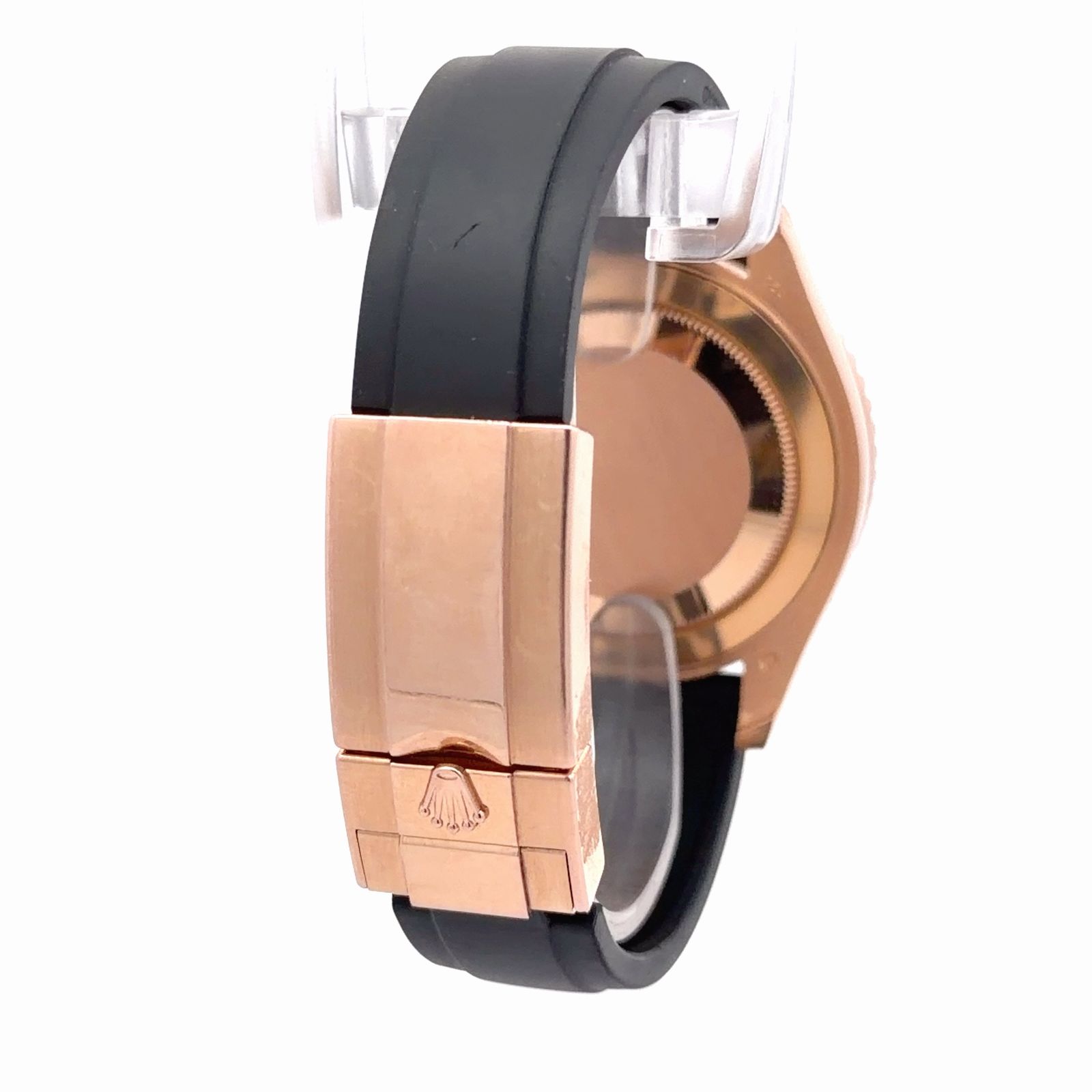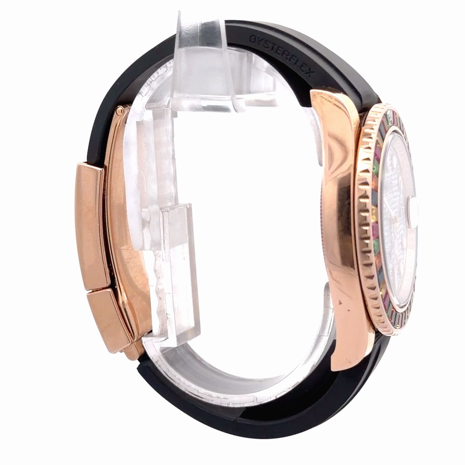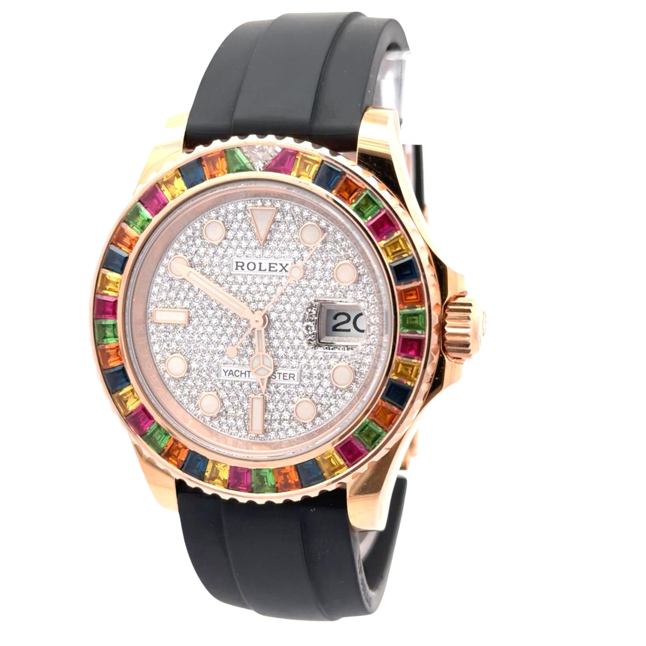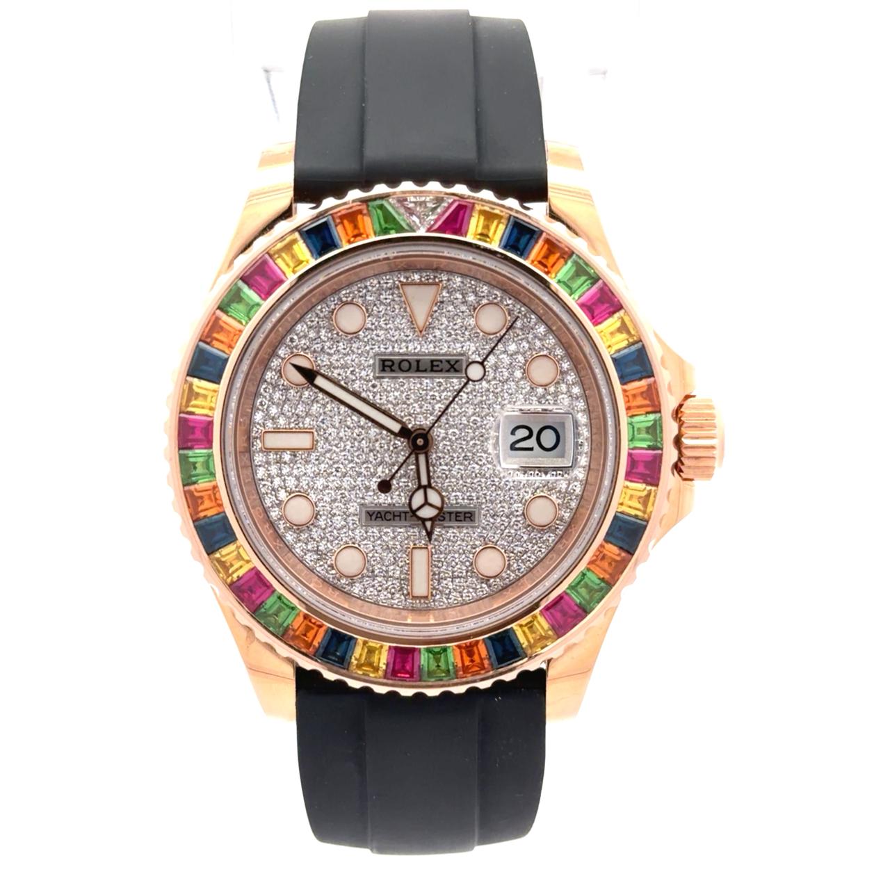 Rolex Yacht-Master 40 "Tutti Frutti" reference 116695 SATS encased in a 40mm 18k Everose gold case, its defining feature is a vibrant bidirectional rotating bezel set with 32 colorful sapphires, 8 green tsavorites, and a single triangular diamond at the 12 o'clock position, creating a "rainbow" or "Haribo" effect. This particular model is distinguished by its pavé diamond dial, where the entire surface is hand-set with brilliant diamonds, complemented by luminous Everose gold hands and a date window at 3 o'clock. Beneath the luxurious exterior is the reliable Rolex Calibre 3135, a self-winding mechanical movement that offers a 48-hour power reserve and 100-meter water resistance.