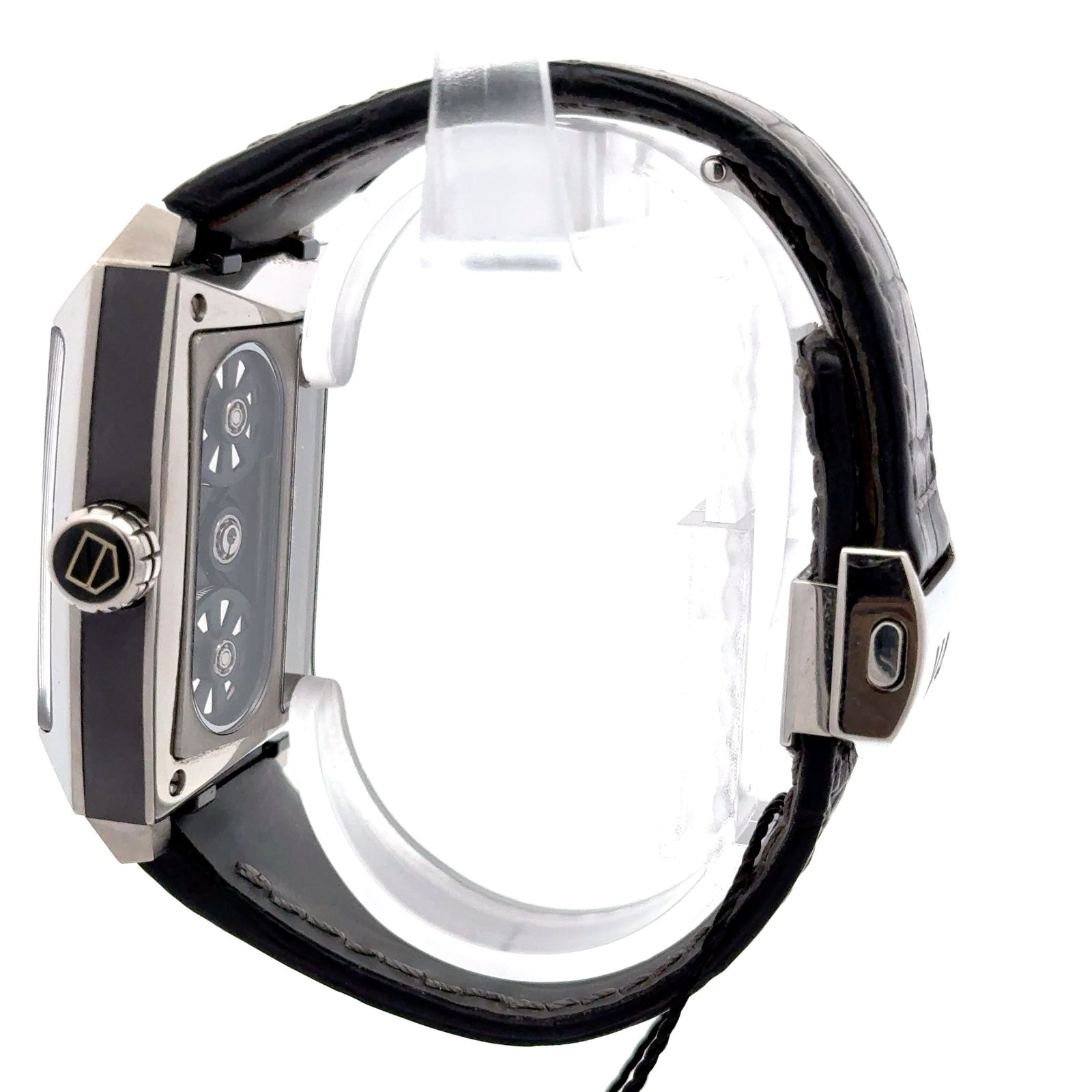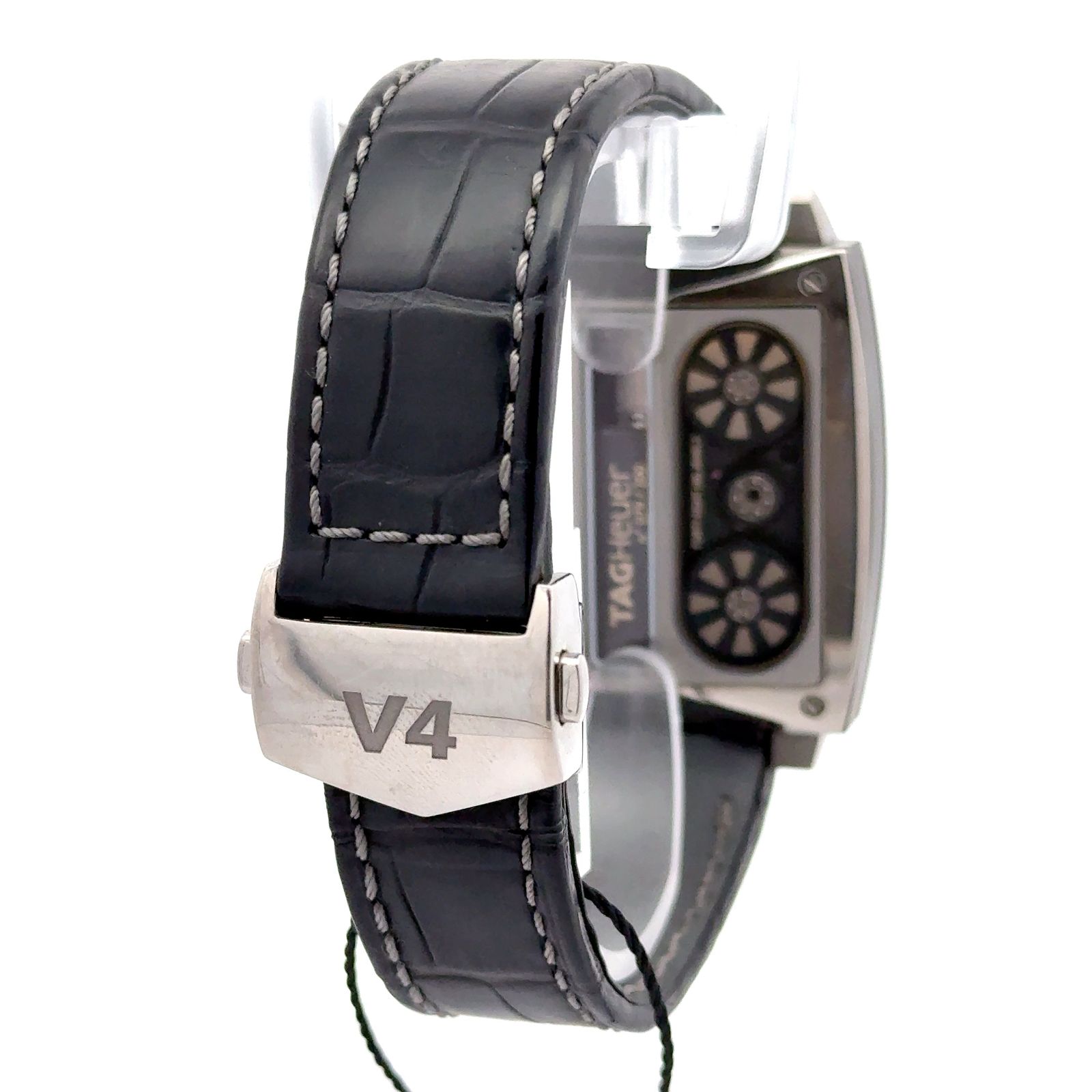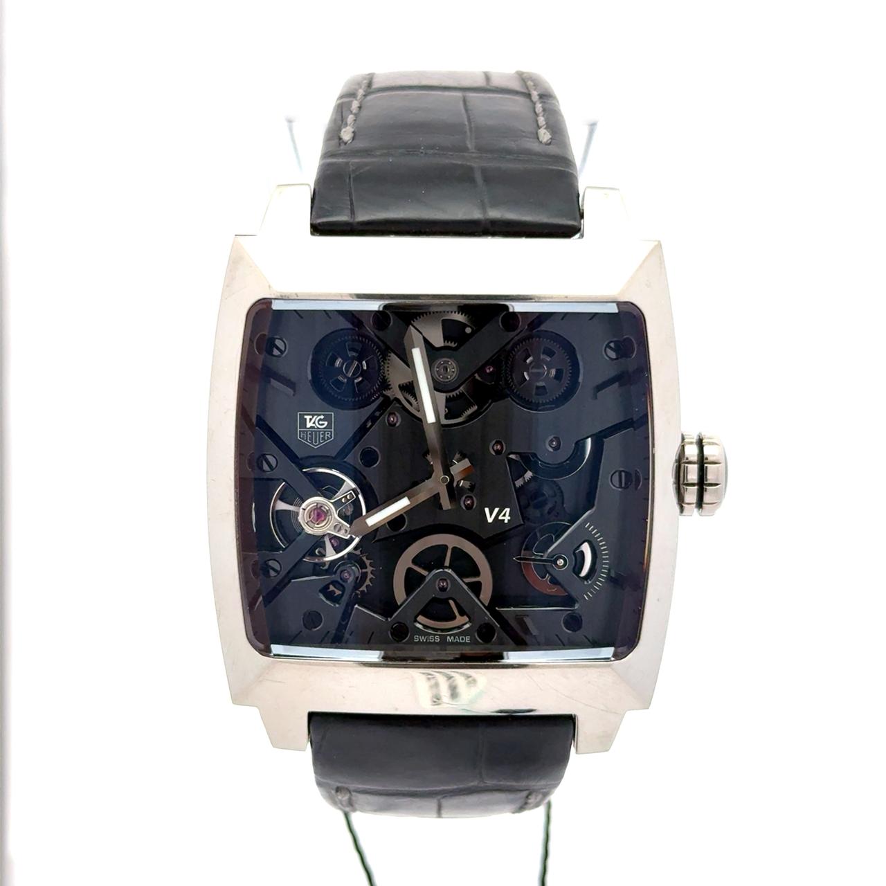 TAG Heuer Monaco V4 WAW2080.FC6288 is a groundbreaking horological statement, blending avant-garde engineering with the iconic Monaco design in a limited edition of just 200 pieces worldwide. Crafted from high-polish titanium and fine-brushed ceramic, the 41 × 41 mm case houses TAG Heuer’s revolutionary Caliber V4, the world’s first belt-driven automatic movement. This patented system replaces traditional gear trains with four tiny belts, visible through the black skeleton dial and exhibition case back, offering a mesmerizing view of the watch’s mechanical choreography. The movement features 48 jewels, a 42-hour power reserve, and operates at 28,800 vibrations per hour, underscoring its technical sophistication. The dial is minimalist yet futuristic, with luminescent index markers, silver-toned hands, and a separate seconds subdial, all framed by a scratch-resistant sapphire crystal. The watch is paired with a black crocodile leather strap and a titanium folding clasp, ensuring both comfort and durability. With a case thickness of 17 mm and water resistance up to 100 meters, the WAW2080.FC6288 balances bold aesthetics with robust performance