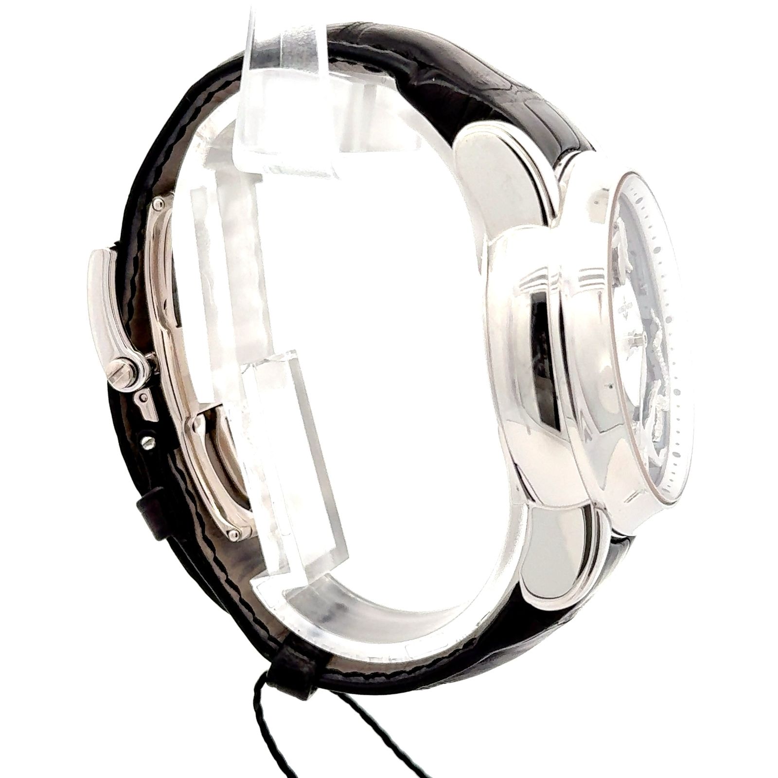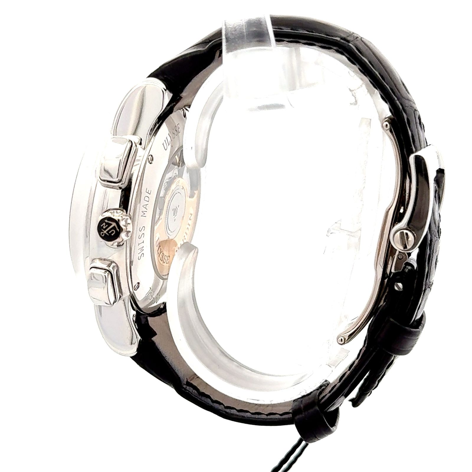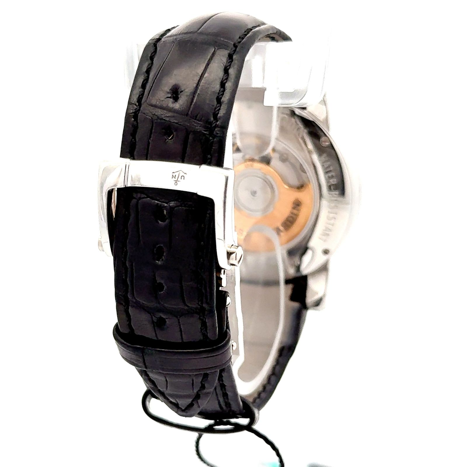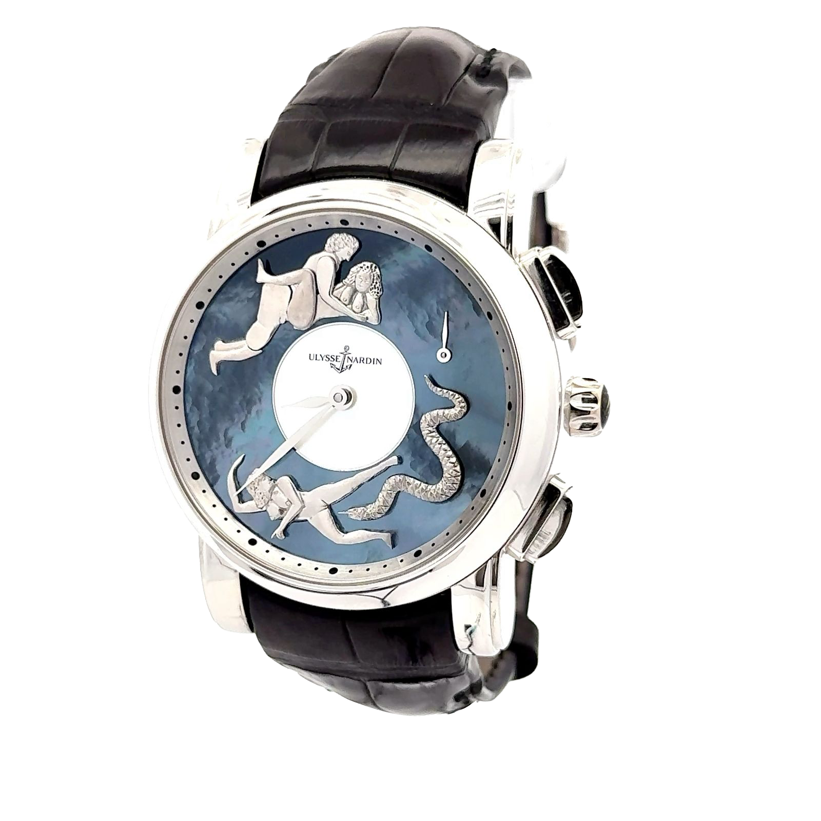 Ulysse Nardin Hourstriker Erotica Ref. 6119-103/P0-P2 is a rare and extravagant masterpiece of high horology, combining mechanical complexity with artistic sensuality. Housed in a 42 mm solid platinum case, this striking timepiece features a two-tone mother-of-pearl dial that elegantly contrasts a dark outer ring with a luminous white center. At its heart lies a beautifully hand-crafted automaton scene, where intricately sculpted 18K white gold figures spring to life in synchronized motion with the hour-striking mechanism. This “Erotica” complication is activated automatically at the top and bottom of each hour or on demand by the wearer, showcasing Ulysse Nardin’s historical expertise in chiming watches and erotic animations. Powered by the automatic UN-75 caliber, the watch offers approximately 40 hours of power reserve for timekeeping and 20 hours for the chime function.