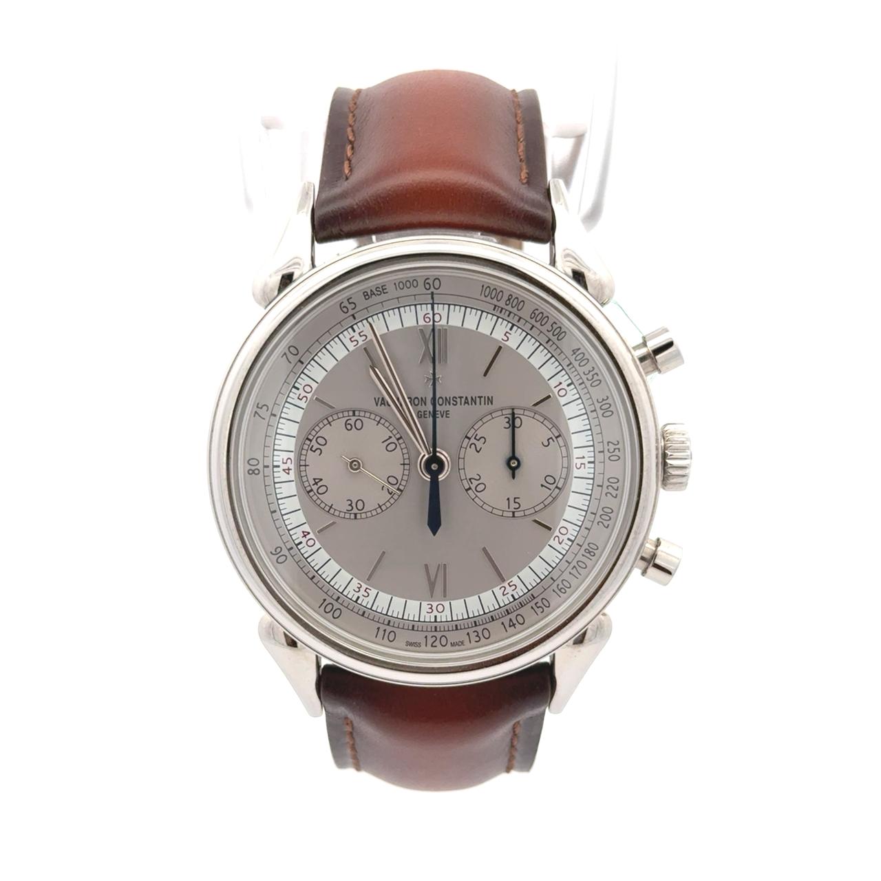 Vacheron Constantin Historiques Cornes de Vache 1955 (Ref. 5000H/000A-B582) is a refined chronograph that pays homage to the brand’s first water-resistant chronograph from the mid-20th century. Crafted in stainless steel, its 38.5 mm case features the iconic “cow horn” lugs—an elegant nod to the original reference 6087. The grey velvet-finished opaline dial is framed by a black tachymeter scale and adorned with Roman numerals at 12 and 6 o’clock, complemented by white gold hour markers and blued steel chronograph hands. Inside beats the manual-winding Caliber 1142, a Geneva Seal-certified movement composed of 164 parts and 21 jewels, offering a 48-hour power reserve and operating at 21,600 vibrations per hour.