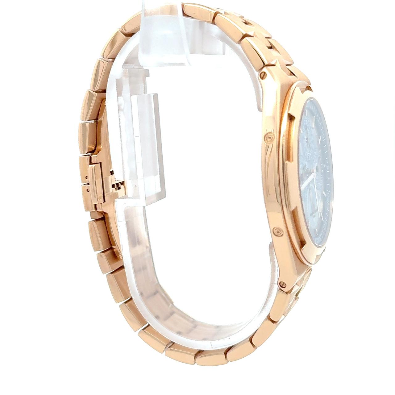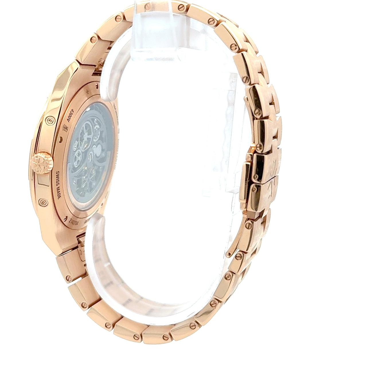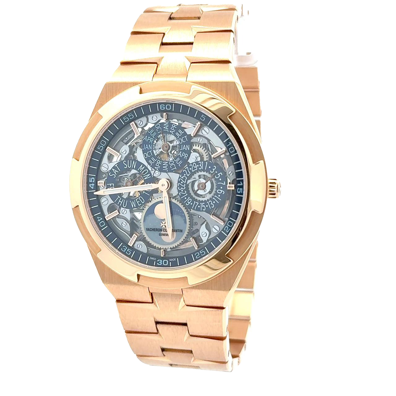 Vacheron Constantin Overseas 4300V/120R‑B642 housed in a 41.5 mm rose gold case, the open worked dial reveals the fully skeletonized automatic Calibre 1120 QP SQ, a micro‑rotor movement with perpetual calendar complications: including day, date, month, leap‑year indication, and a moon‑phase. The moon‑phase display at 6 o’clock, charmingly rendered with twin gold moons against a star‑spangled sky, is balanced by subdials for the calendar functions and a discreet baton‑style hour and minute hands, all crafted in pink gold. It offers a 40‑hour power reserve, complete with the prestigious Hallmark of Geneva certification for fine finishing, protected by dual sapphire crystals and offering 50 m water resistance.
