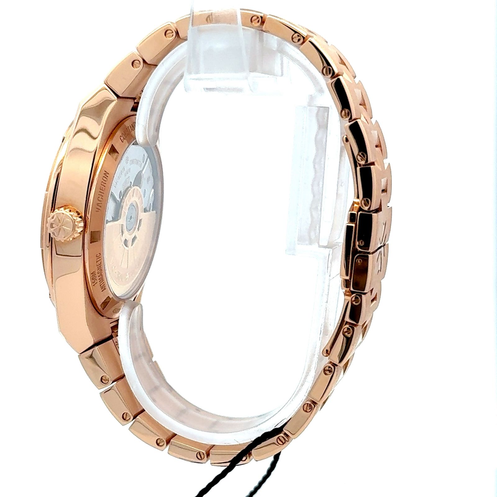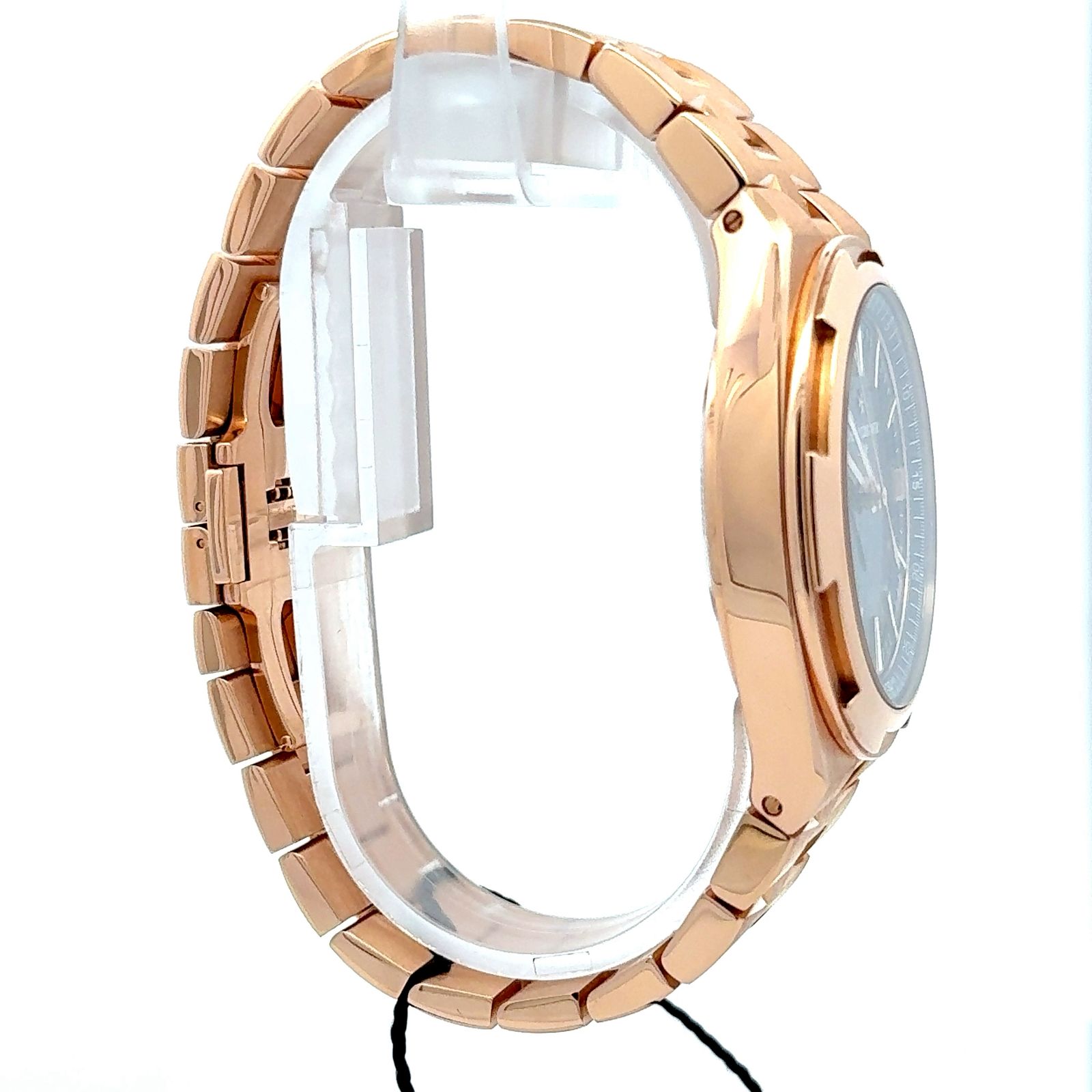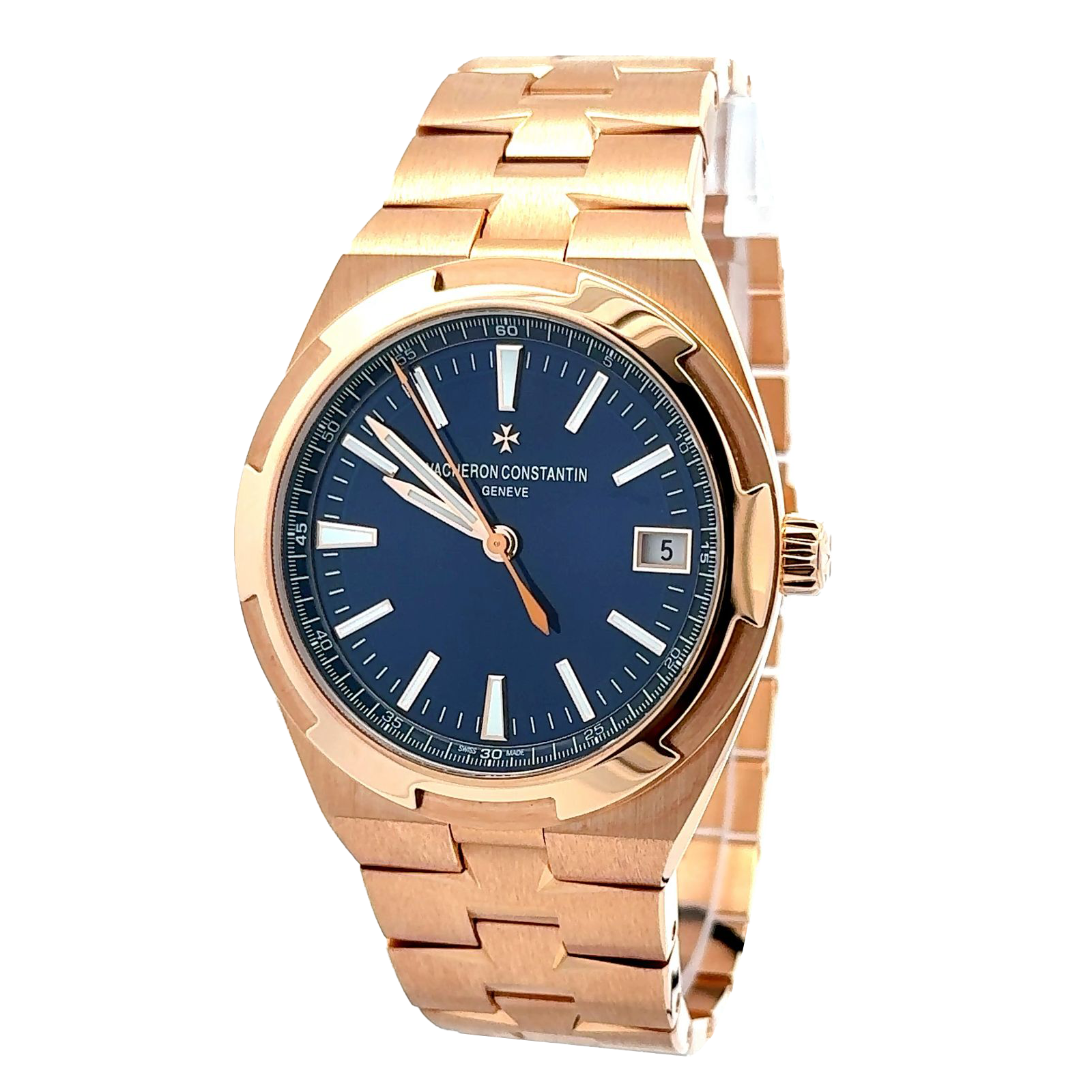 Vacheron Constantin Overseas, a powerful embodiment of sporty elegance and timeless craftsmanship. Crafted in 18K pink (5N) rose gold, the 41 mm round case seamlessly integrates into a matching rose gold bracelet. The deep lacquered blue dial features a sunburst-finished center with a velvet-finished flange, complemented by applied rose-gold hour markers and luminous-filled hands for excellent readability. A discreet date window sits at 3 o'clock. Inside, Vacheron’s robust in-house Caliber 5100 (37 jewels) delivers a 60‑hour power reserve, central seconds, and is hallmarked with the prestigious Geneva Seal, visible through the sapphire caseback. The watch is also ruggedly equipped with water resistance up to 150 meters.