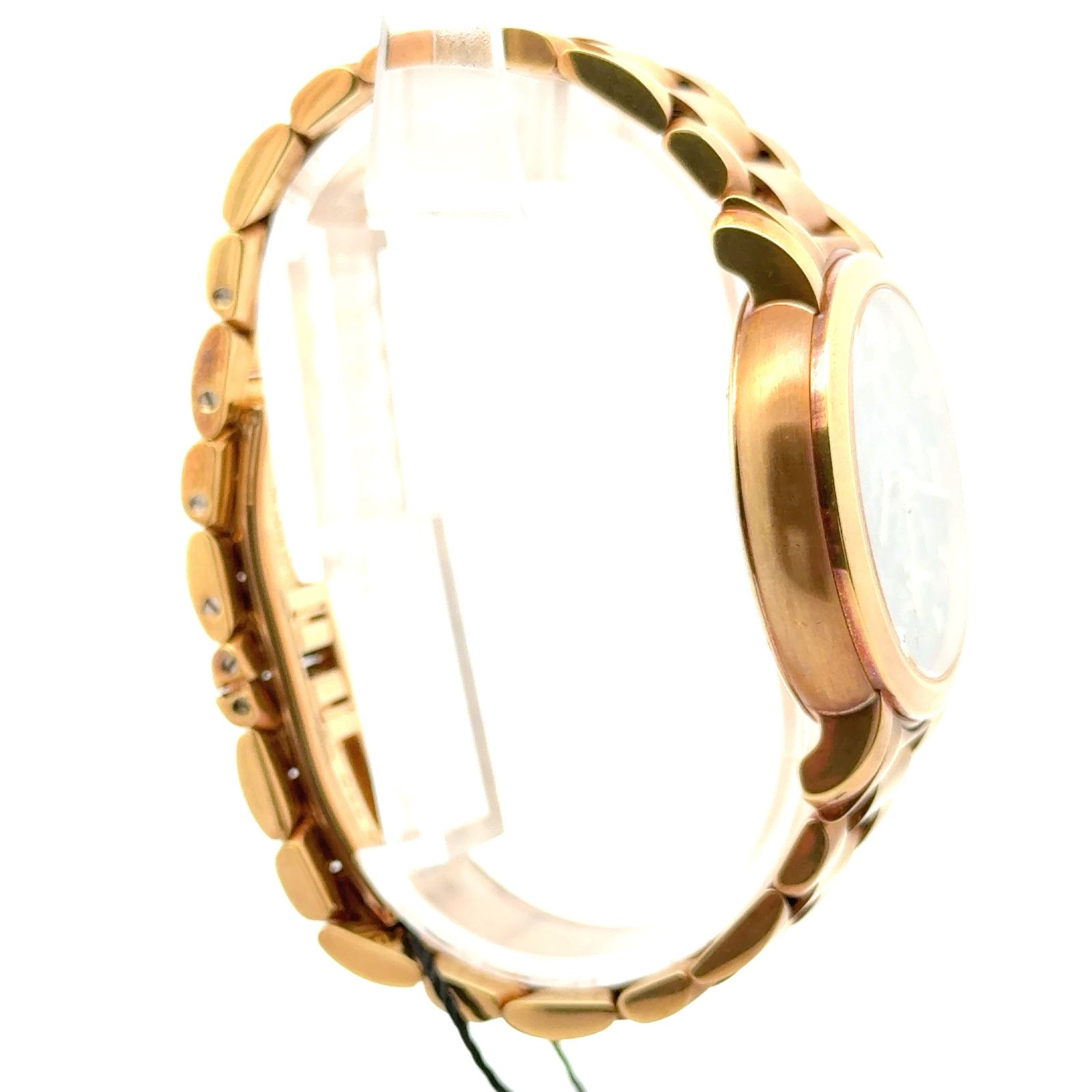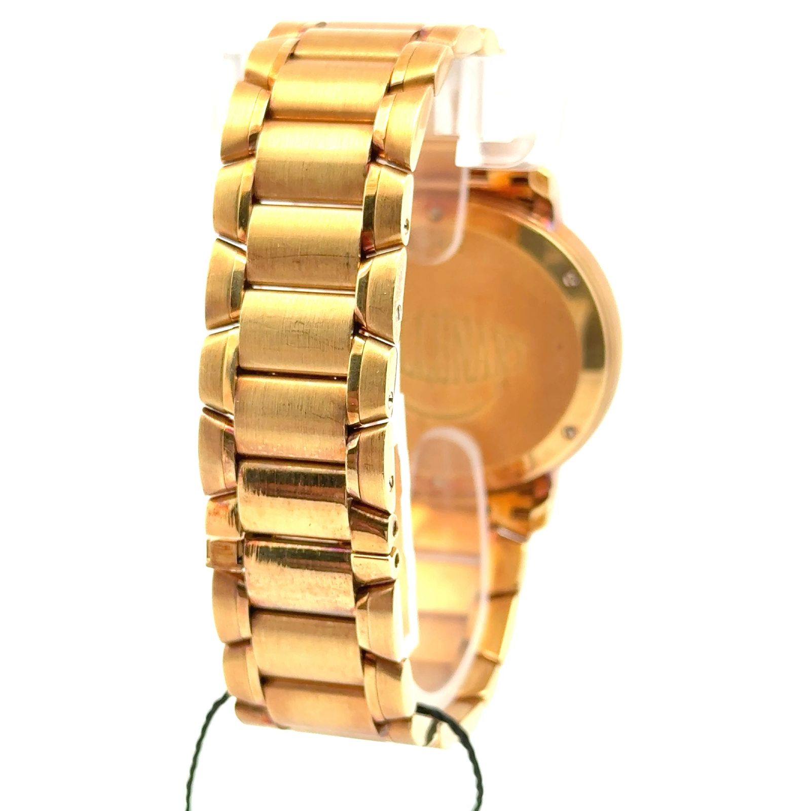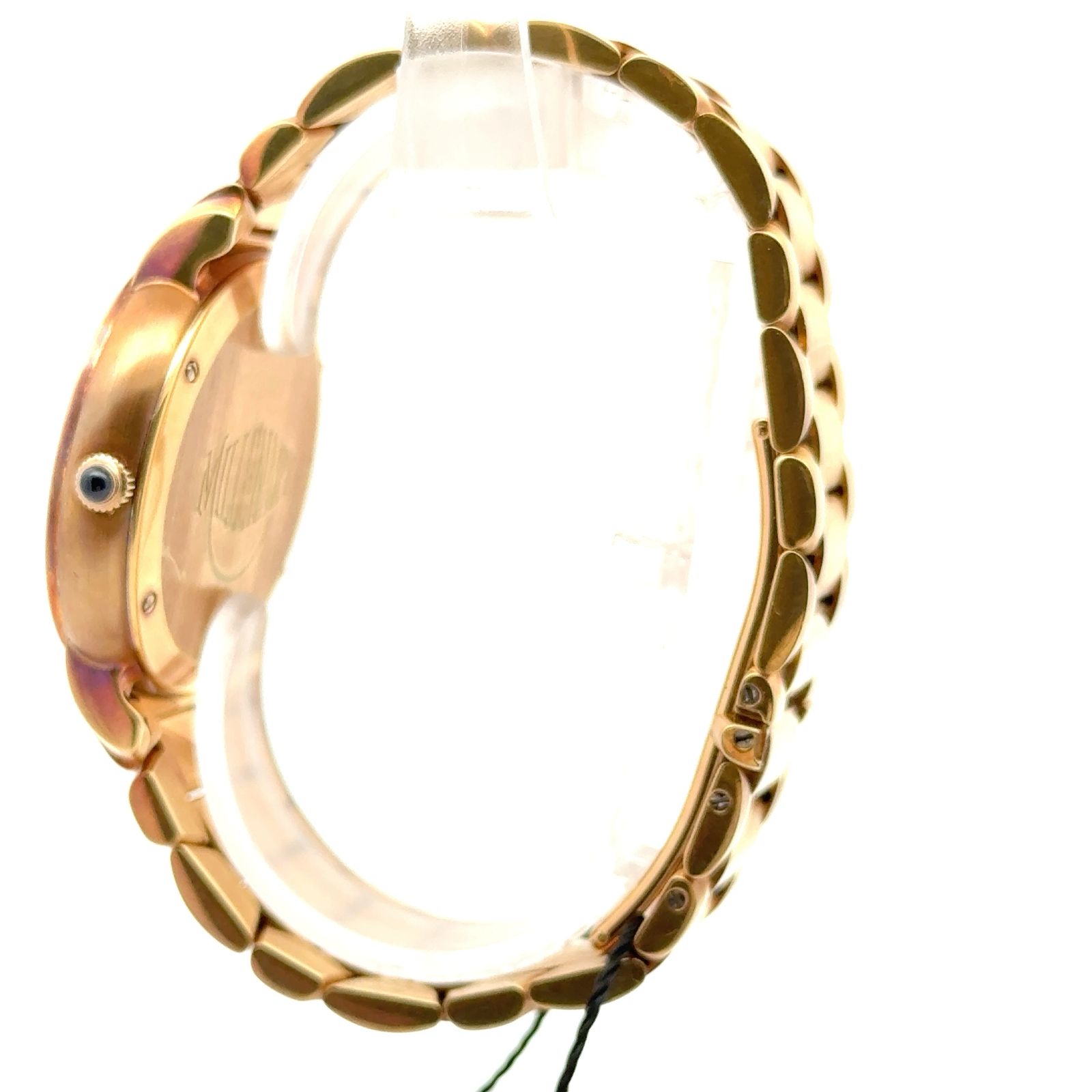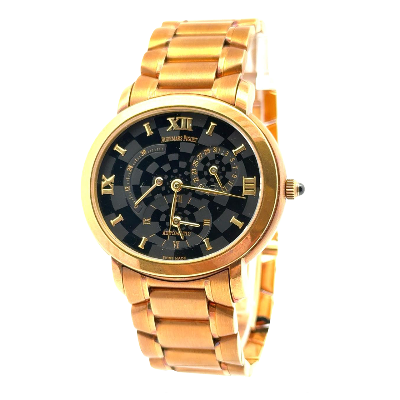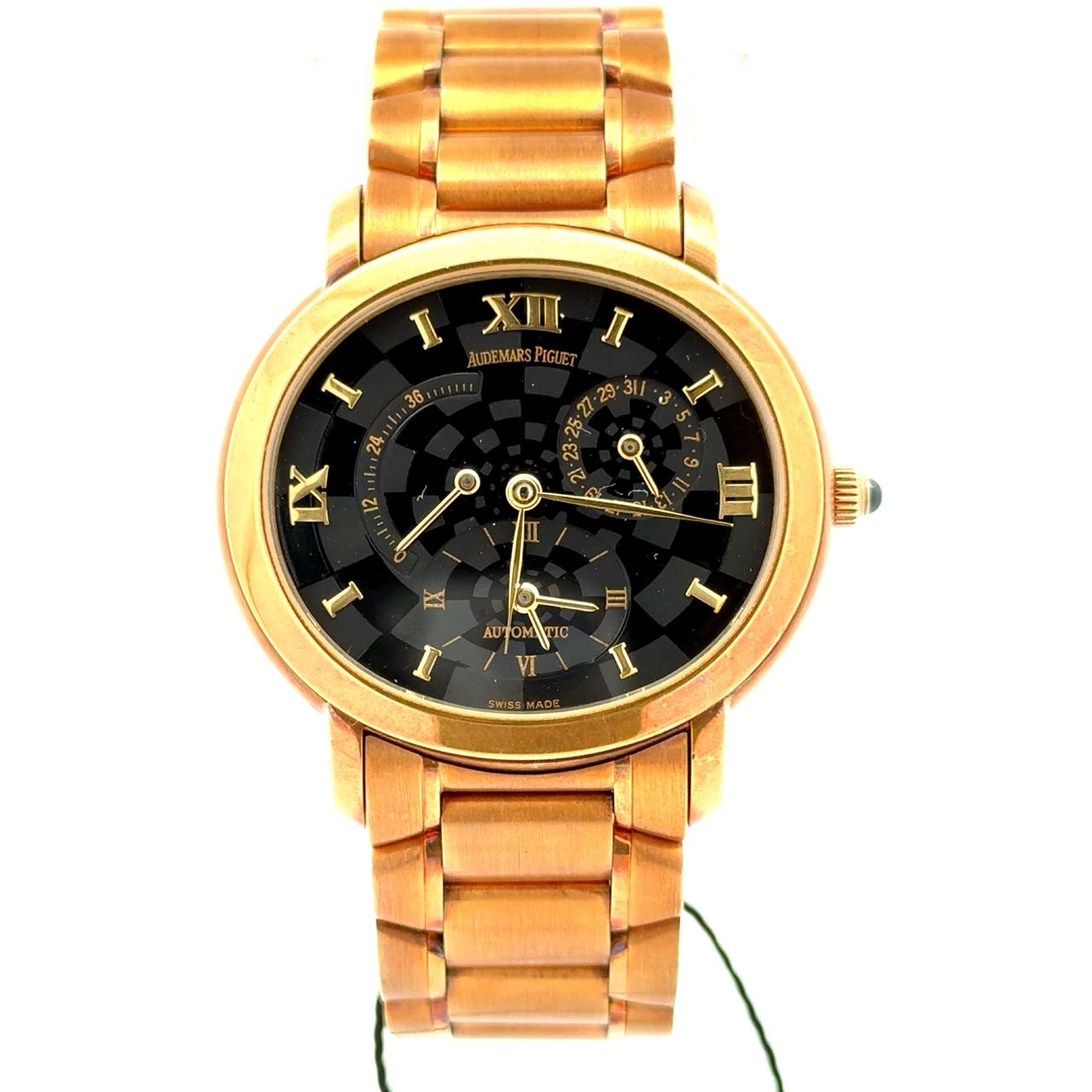 Audemars Piguet Millenary “Kasparov” Ref. 25914BA.OO.1136BA.01 is a limited-edition masterpiece in 18K yellow gold, blending horological complexity with intellectual symbolism inspired by chess grandmaster Garry Kasparov. The 25914BA features a dual time zone display, date function, and a power reserve indicator, all powered by the automatic Caliber 2229/2845 with 54 jewels. Its black checkerboard dial—a nod to the chessboard—hosts gold Roman numerals and elegant gold hands, creating a striking contrast that enhances legibility and thematic depth. The 38mm case and integrated yellow gold bracelet with a double-folding clasp offer a bold yet refined wrist presence. The case back is secured by six screws, underscoring the watch’s robust construction.